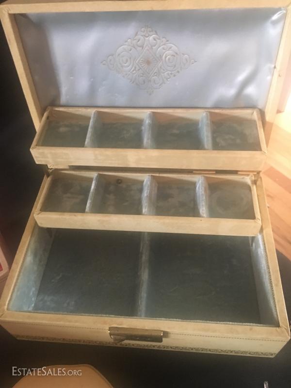 Three vintage jewelry boxes with jewelry as we found it inside each box.