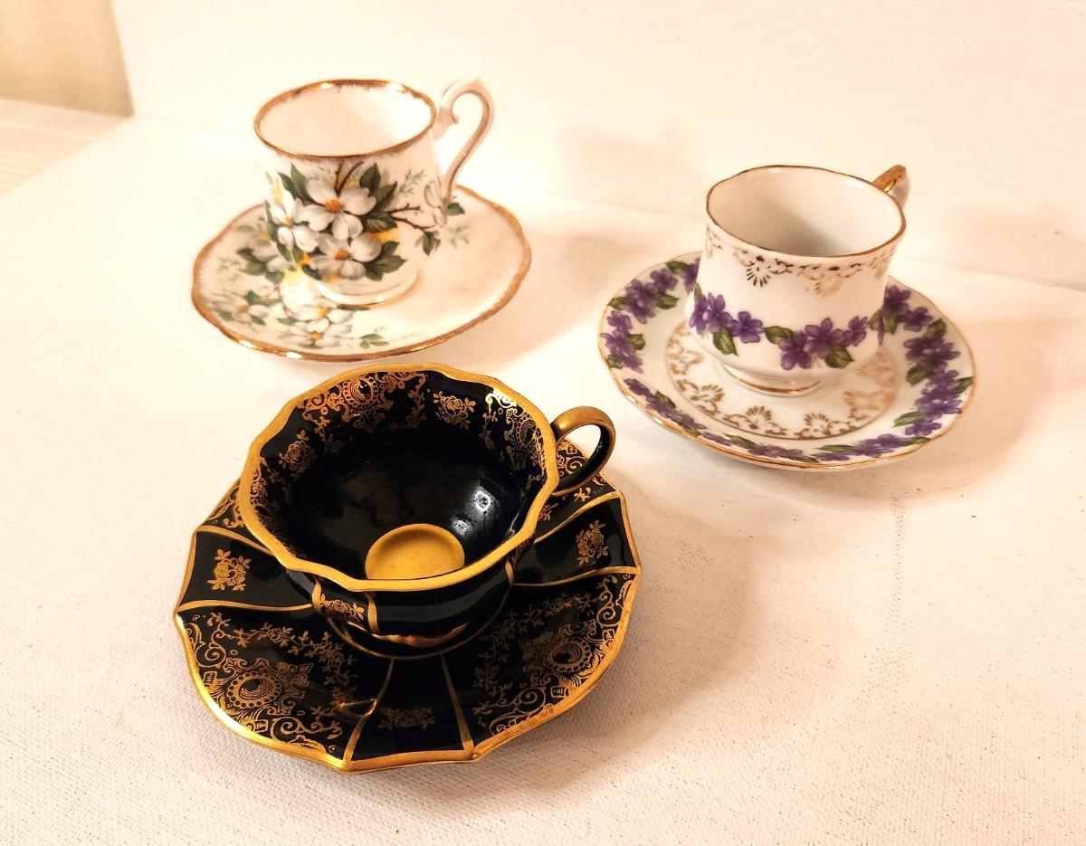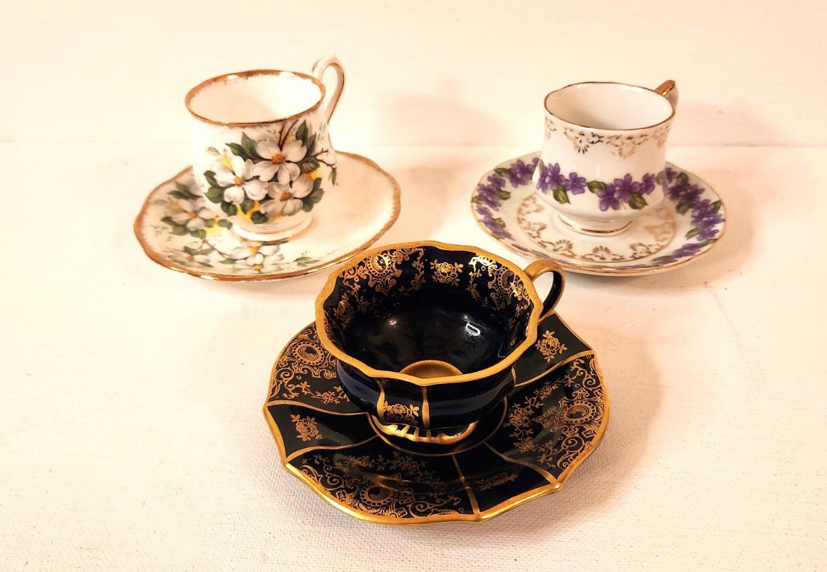 Lot of 3 collectible demi-tasse sets - the Dogwood set is Royal Albert. All in good condition.