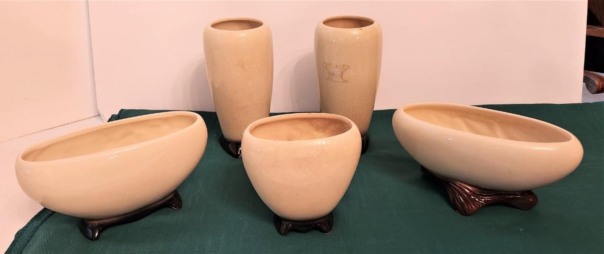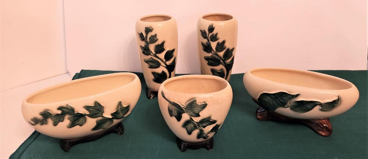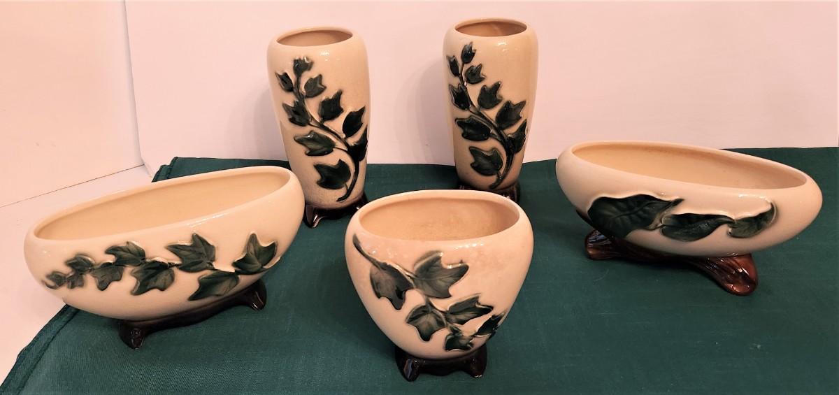5 pieces Royal Copley potter in the "Ivy" pattern - unmarked (these had a foil label that is now usually missing). Piece in front has a bit of age-related discoloration and crazing. Pieces range from 7" tall to 4" tall.