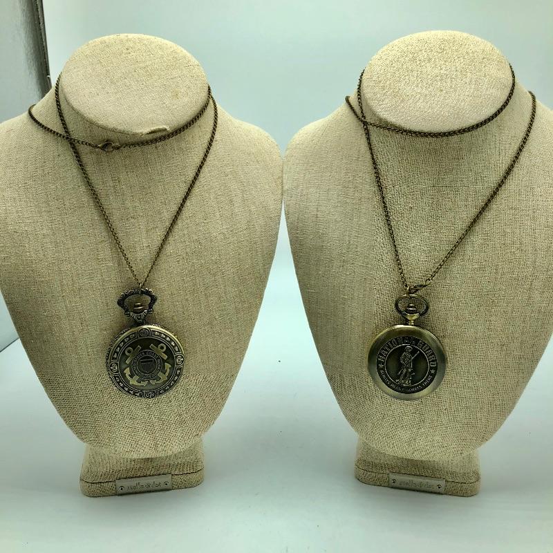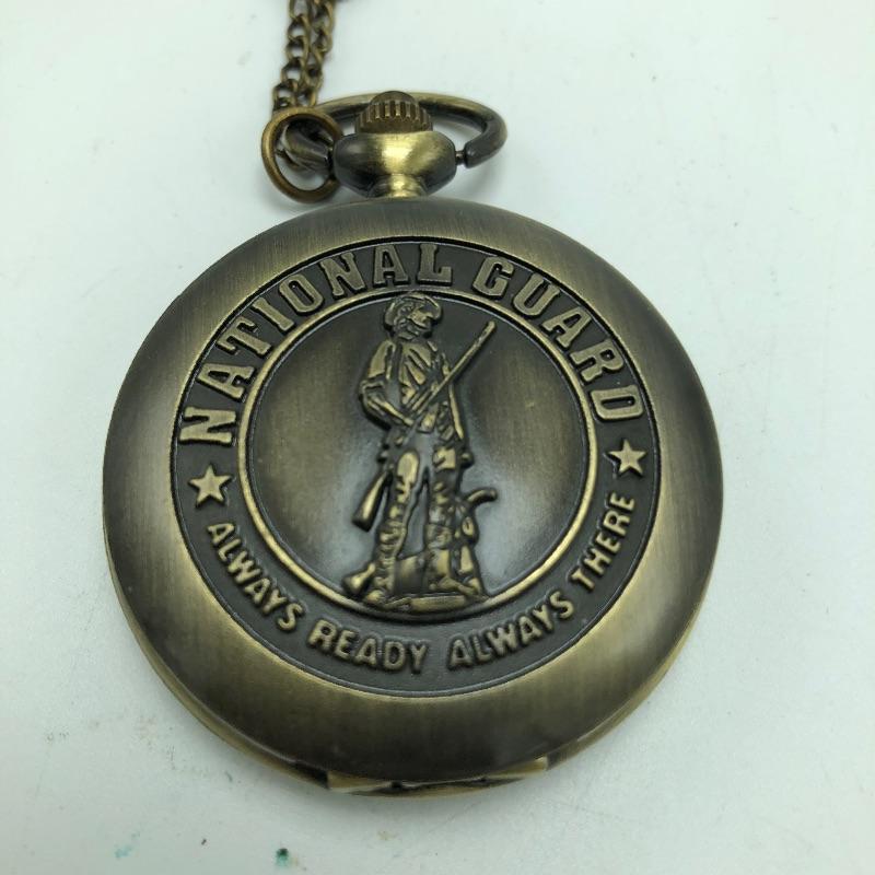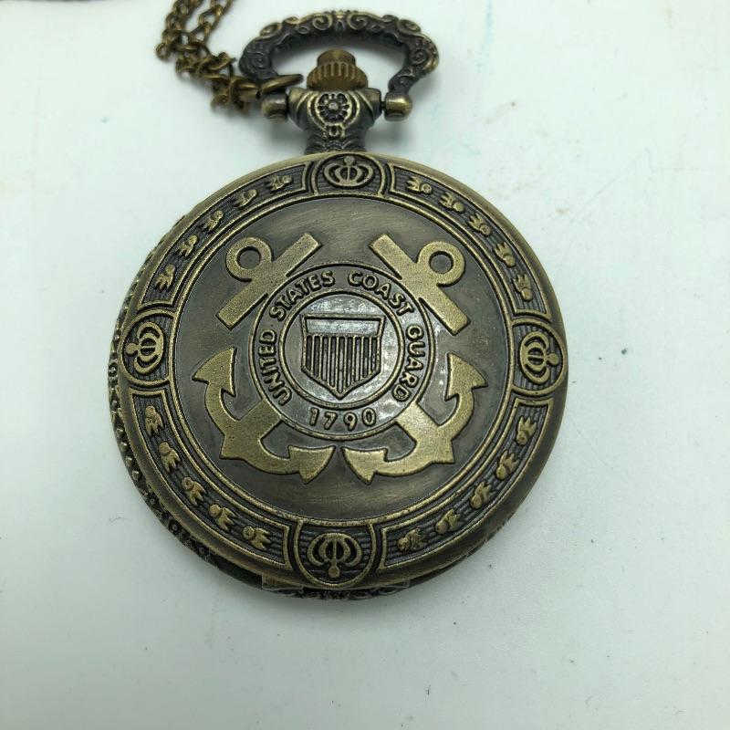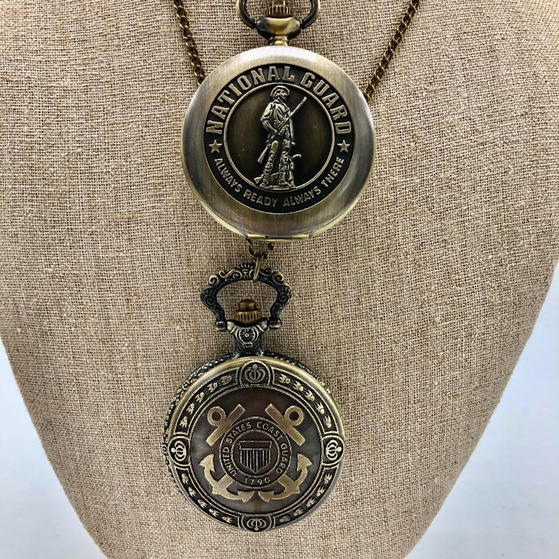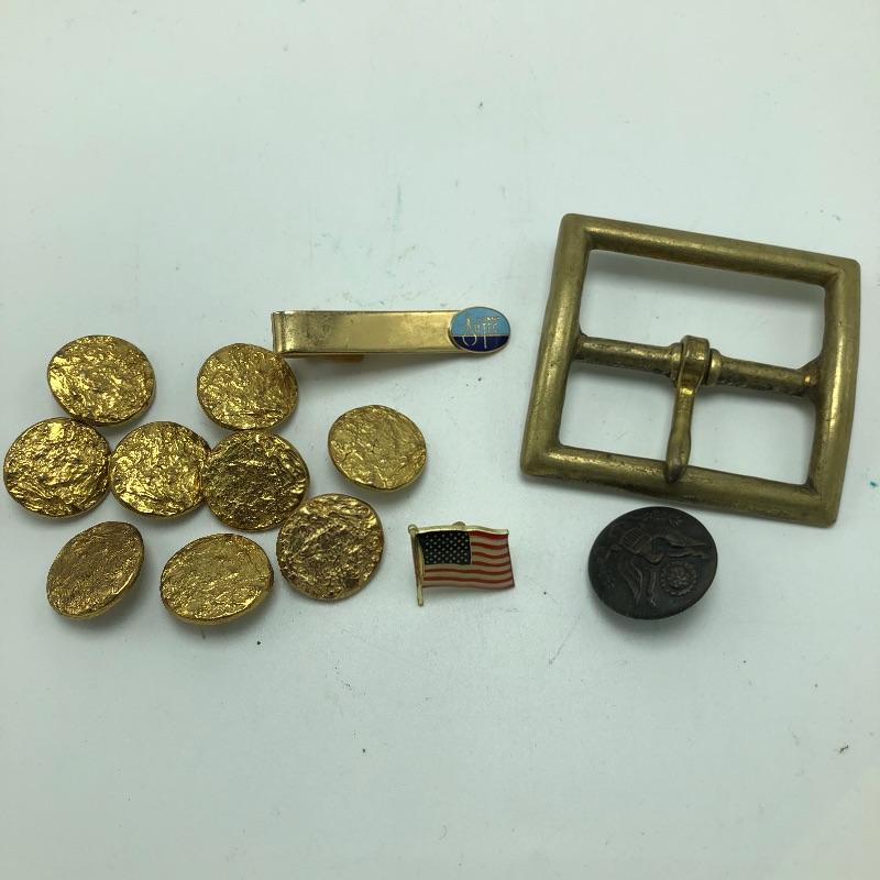 Pocket watches are both made by Strada, one is for the Coast Guard, the other National Guard. It is unclear whether they work or not. Also included is a brass belt buckle, Bobbins Company Attleboro gold or gold like tie pin, brass or brass like coat buttons and more.