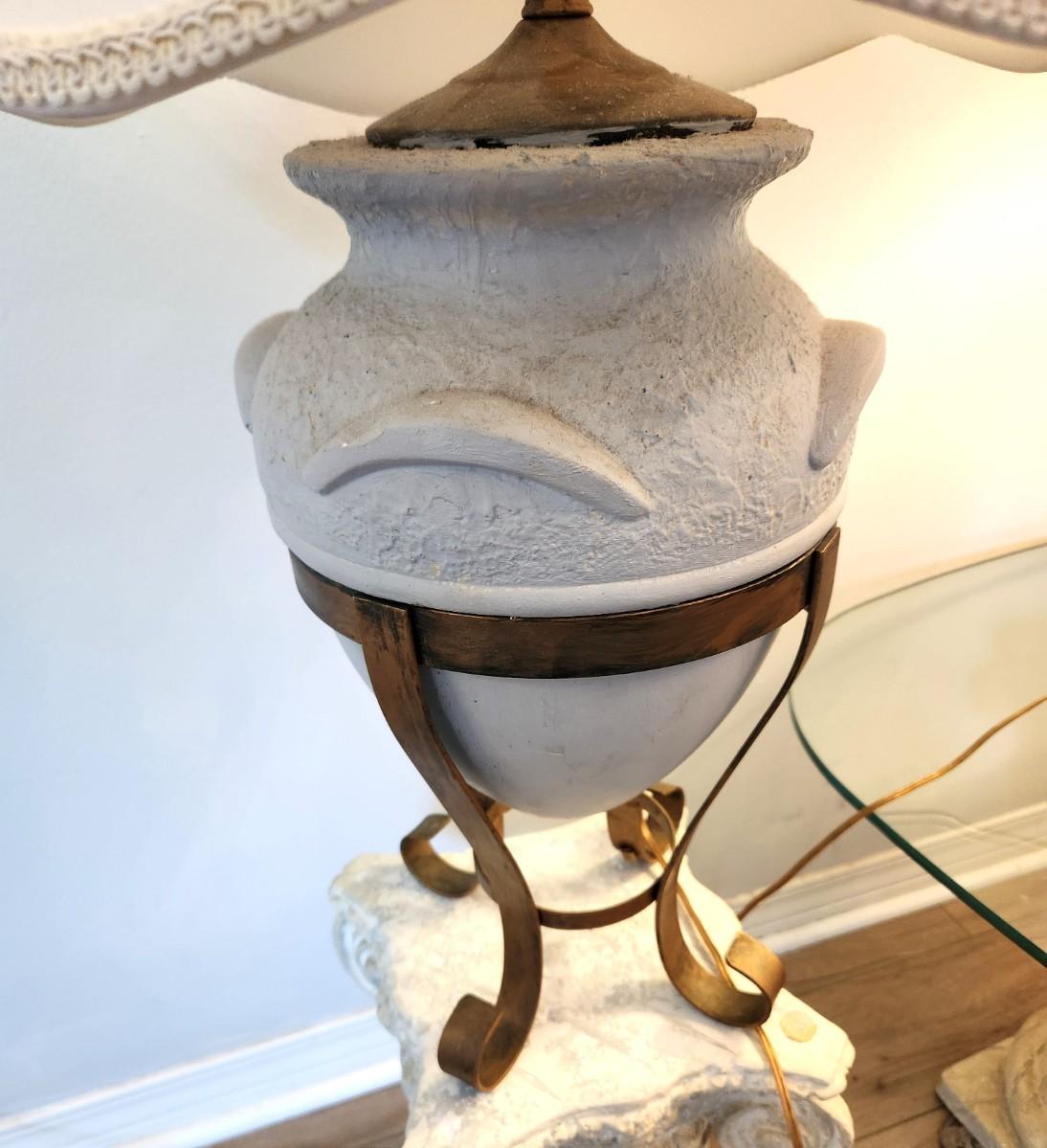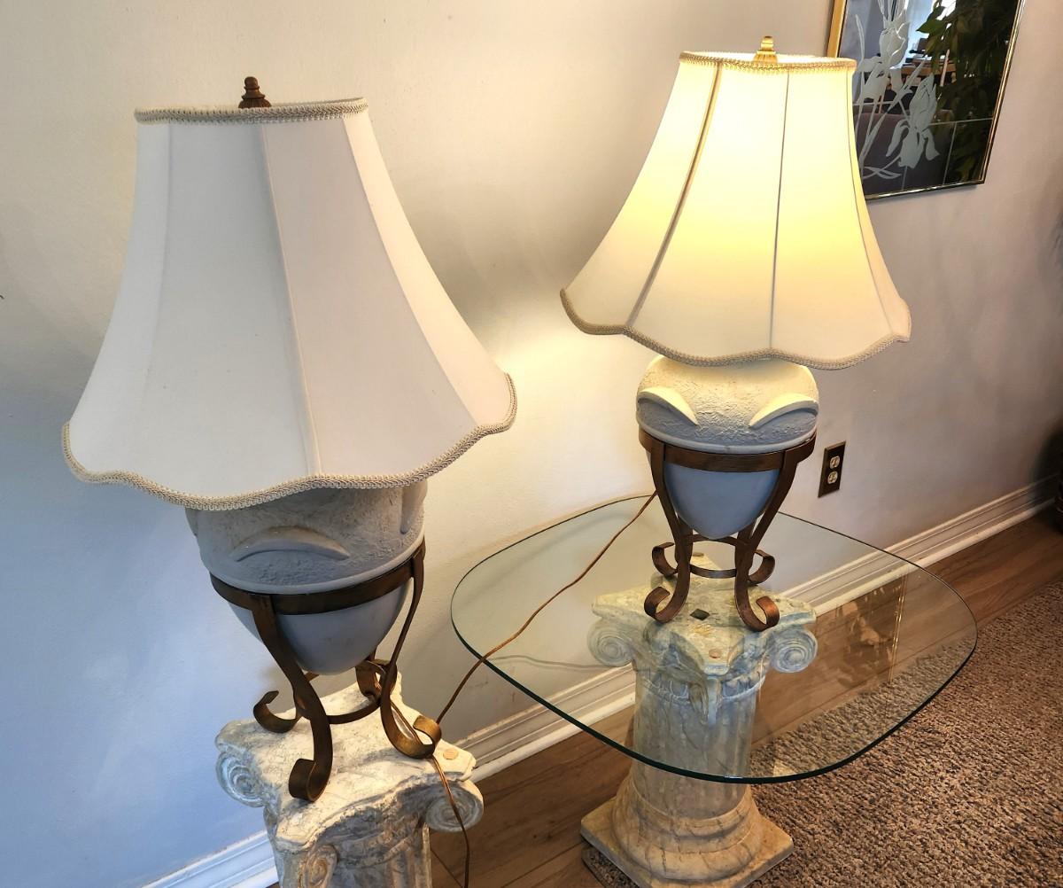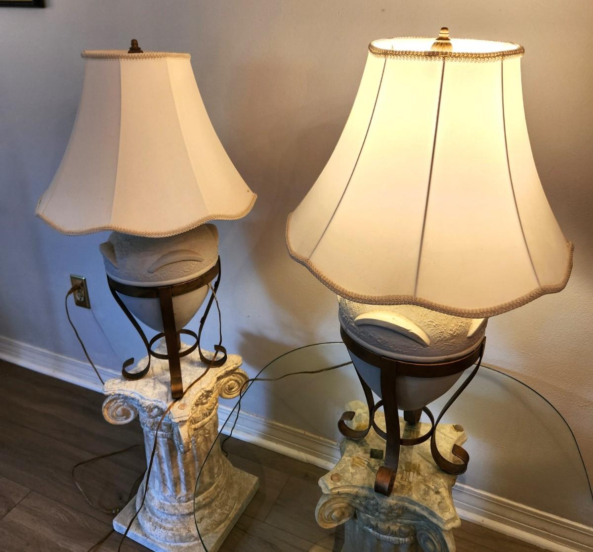 These pottery table lamps lift out of the metal bases - both in working condition - neutral tones - they look good. 31" tall.
