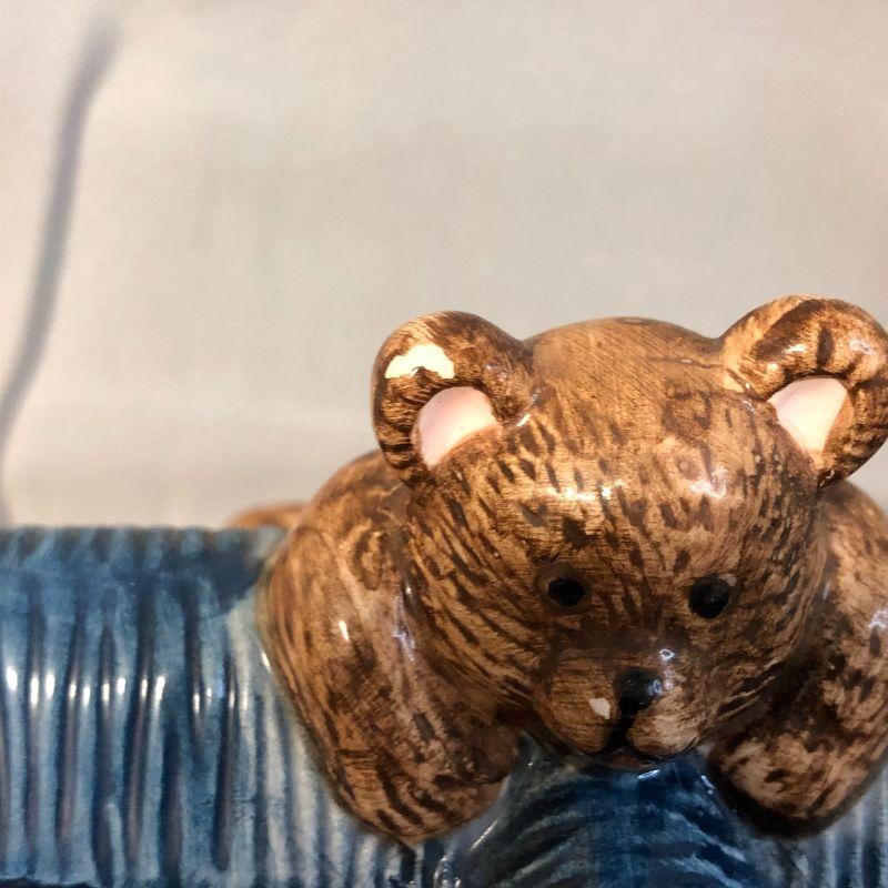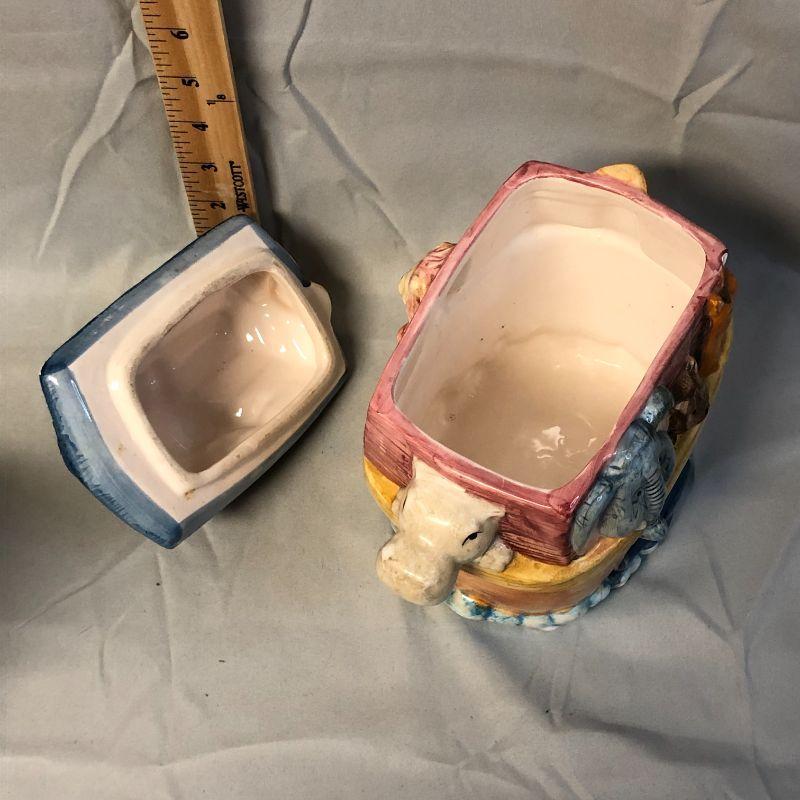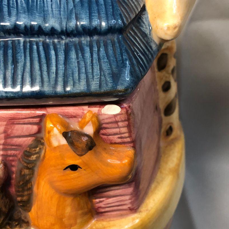 I am calling this a cookie jar, but it is a little smaller than most cookie jars (not that it can't be filled with a package of Oreos). It has three paint chips - one on the bears ear, one just above the horse ear, and one on the corner of the roof. Otherwise, it is in very good condition. It stands about 9" tall.