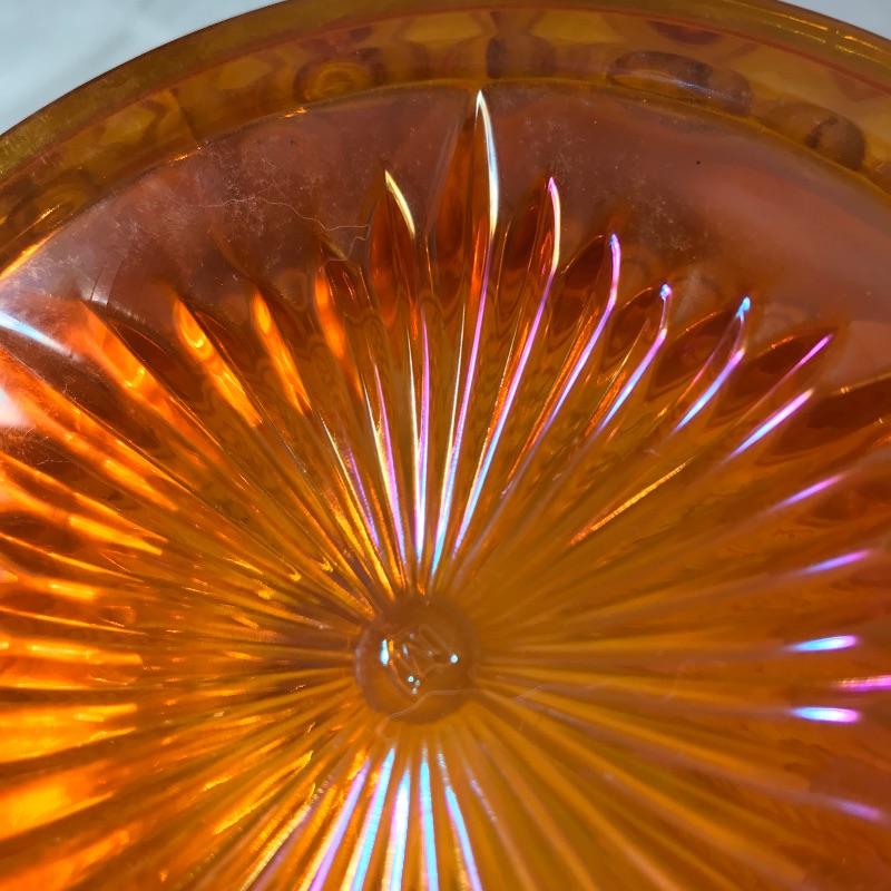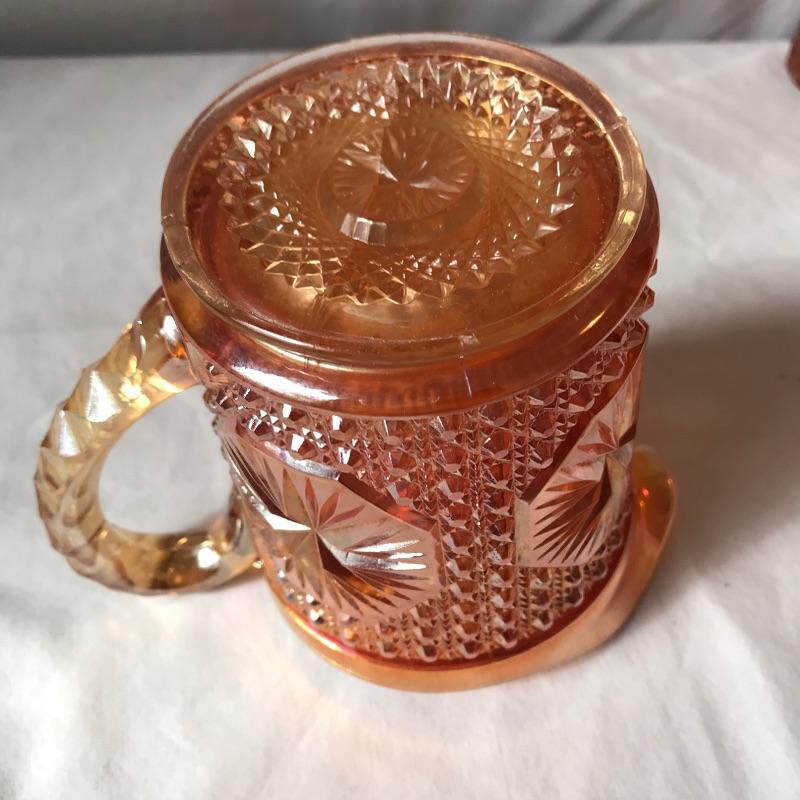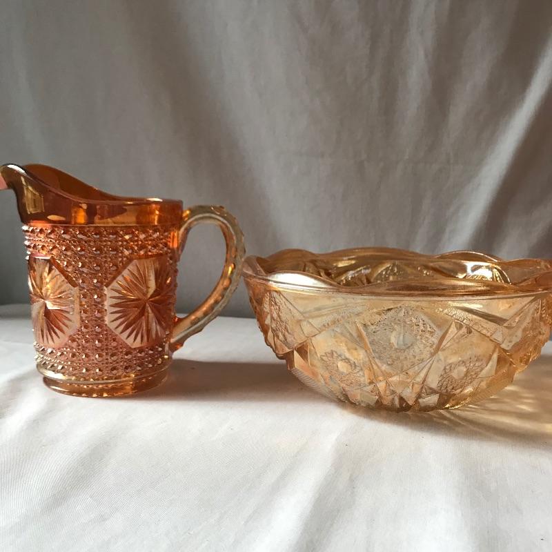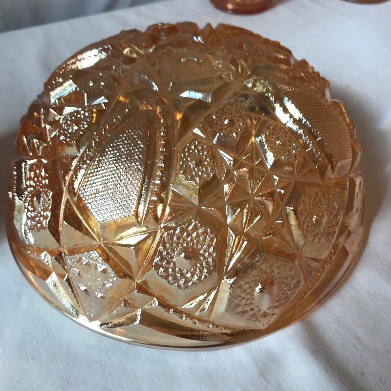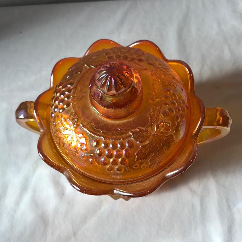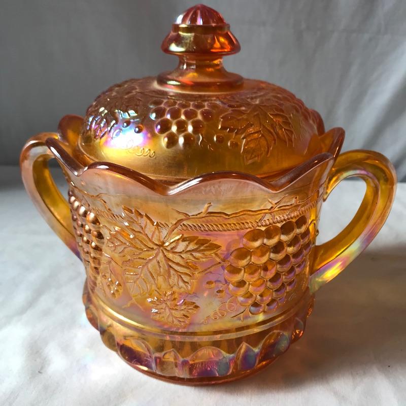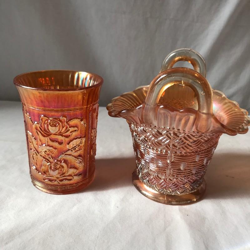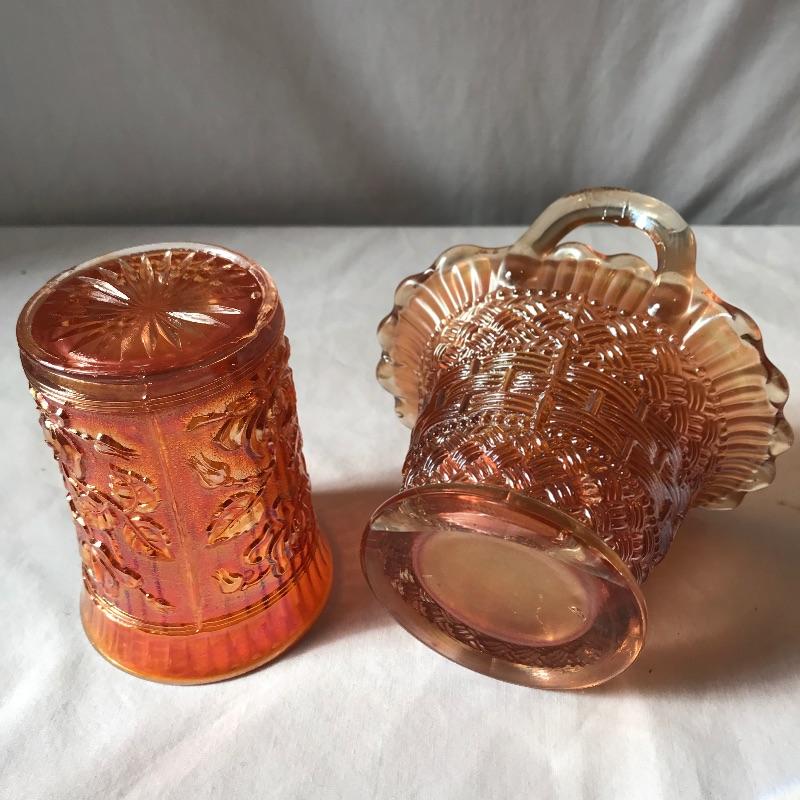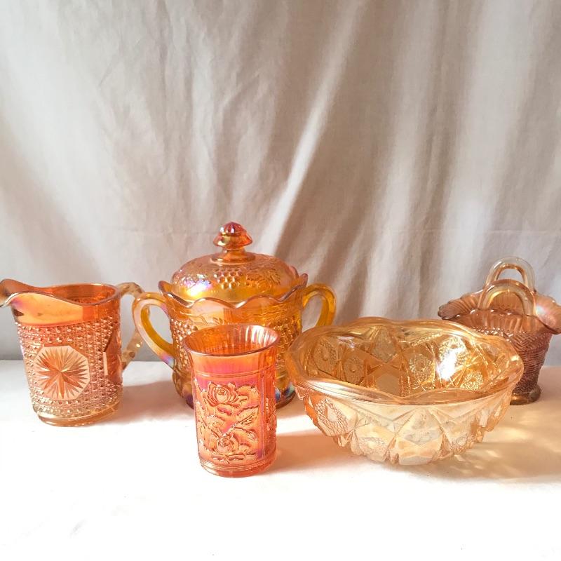Nice pearl orange collection of carnival glass. Pieces have a variety of uses including a lidded jar, decorative basket and bowl. Pieces also have a variety of styles that look great together, but can stand well on their own. Grapes, roses, wicker and starbursts! Don’t let this lot get away! Lidded jar stands 8” high. See photos. Shipping available.
