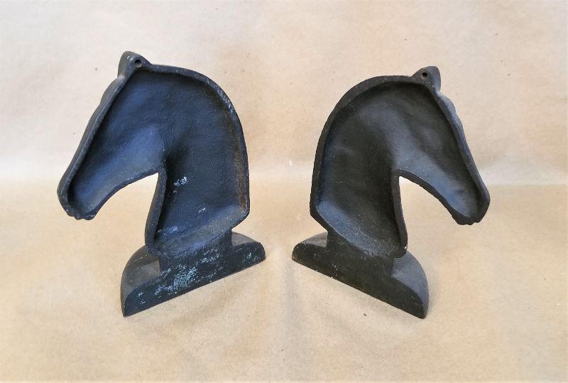 Nice pair of vintage cast iron bookends. No maker's mark. Each stands about 6" tall and 4.5" wide.
