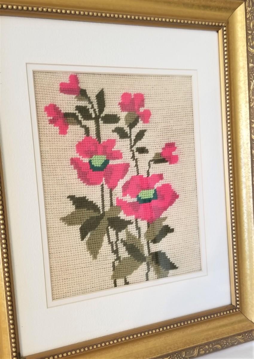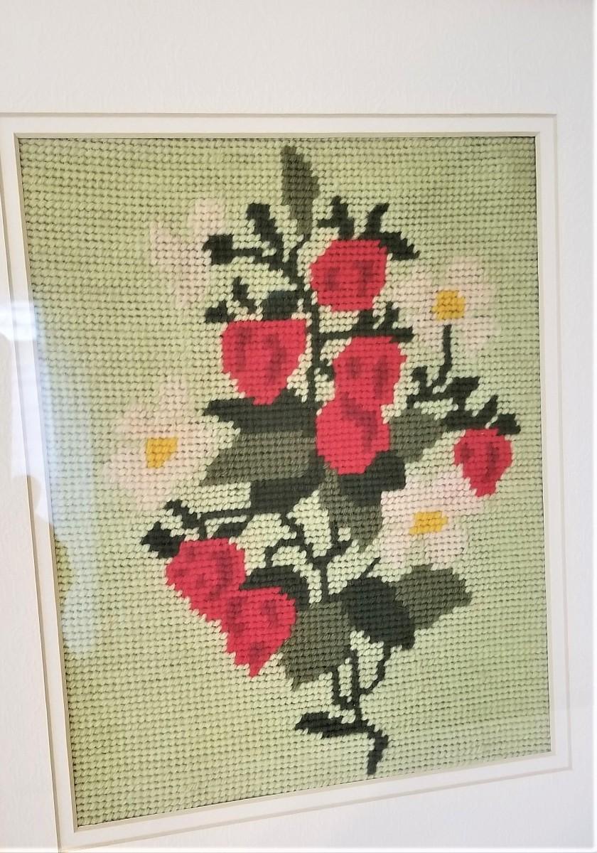 Pair of vintage needlepoints - floral motif - matching frames. Each measures 14" x 17.5" - double mat.