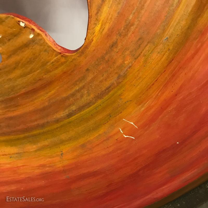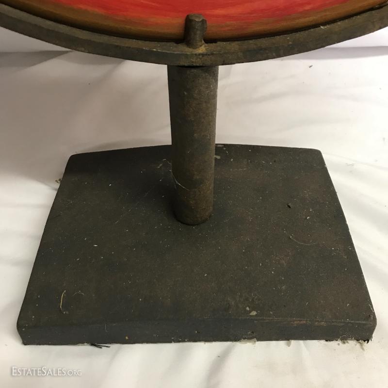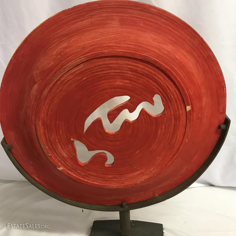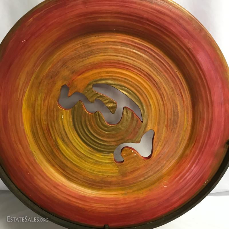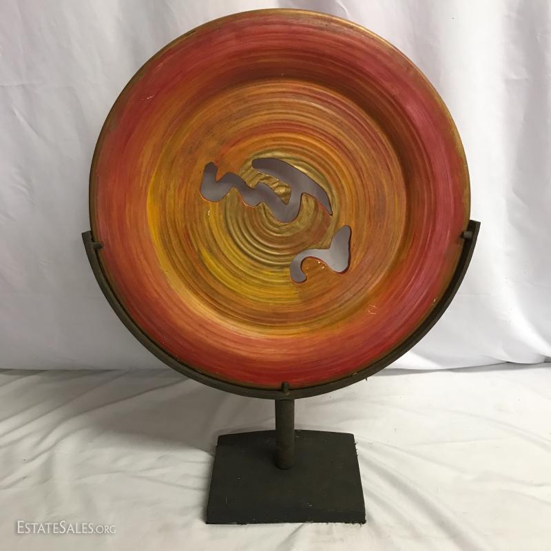 Nice decor for your home. This large wooden painted plate sits nicely into a metal stand. Can rotate for perfect look. Removable plate from stand. Plate is 21"diameter. On stand it's 27.5"tall.