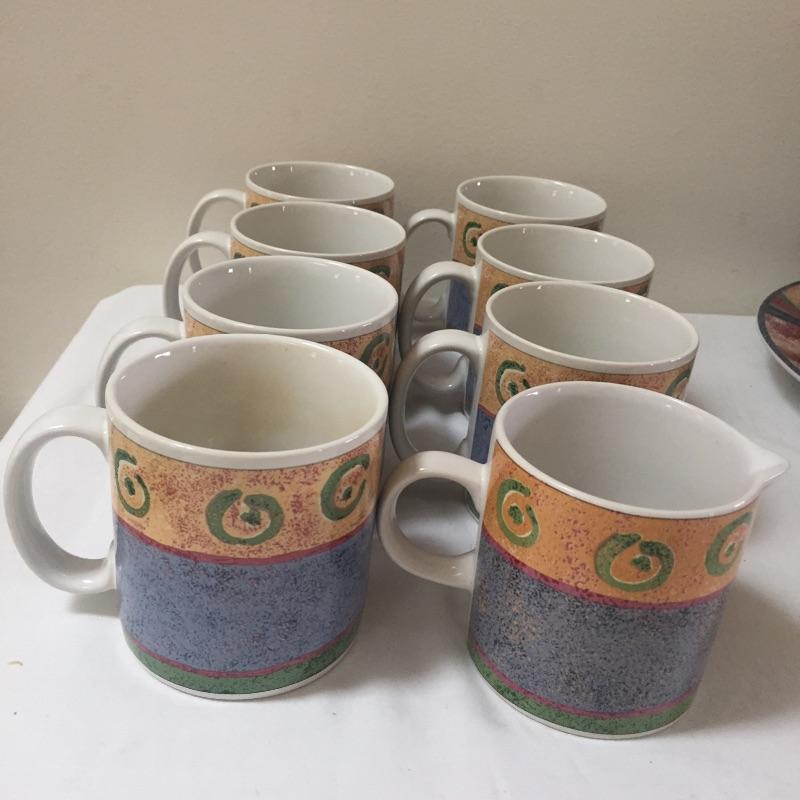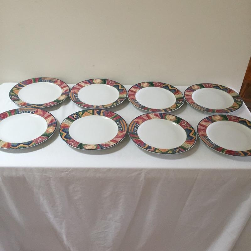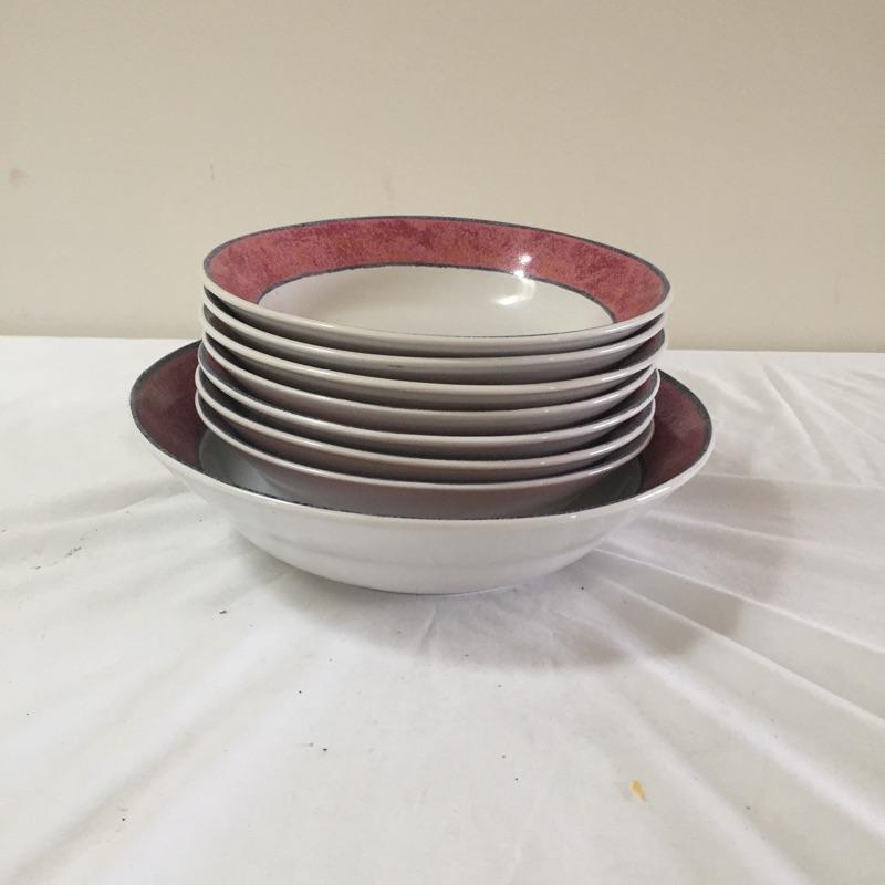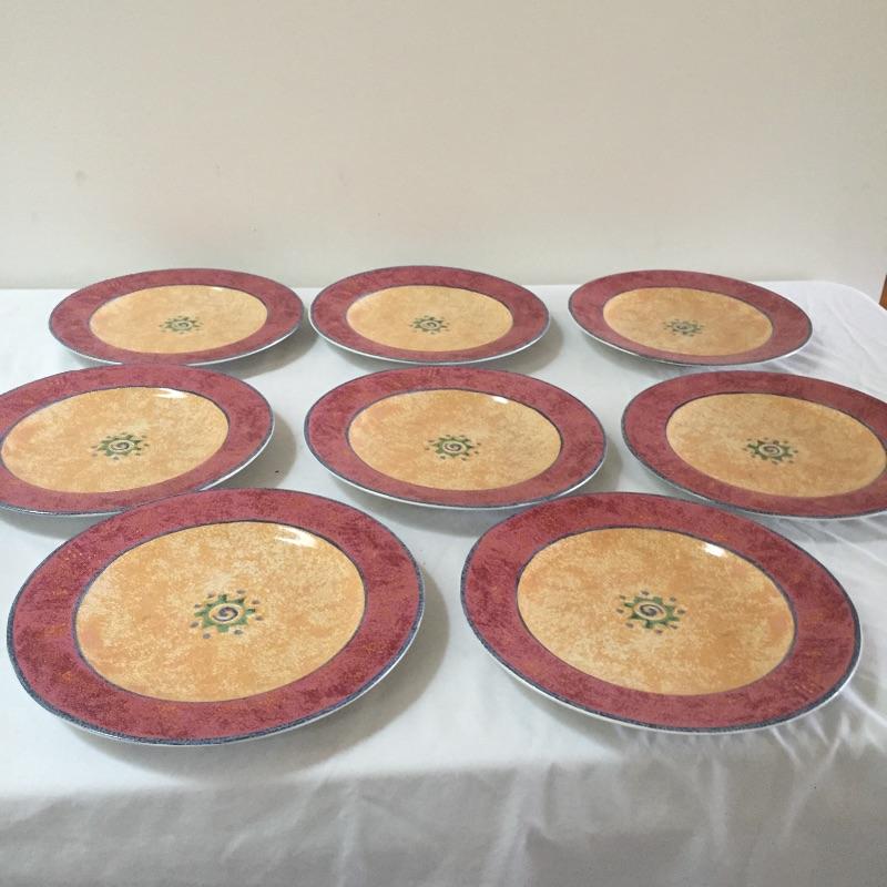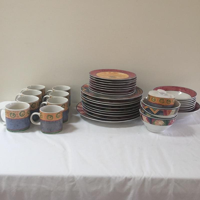 Fun Sakura Dish set includes eight dinner and side plates , eight mugs. Seven bowls ,three small bowls a large plate and bowl. Plates measure 11”D.