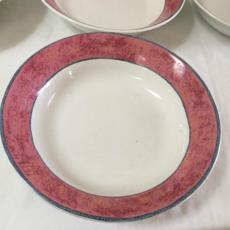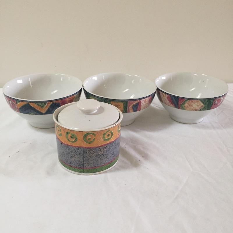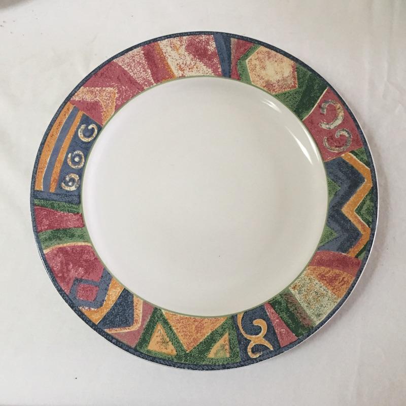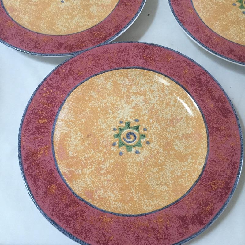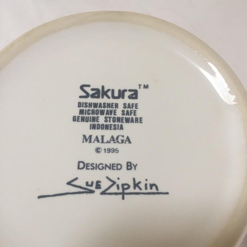 Fun Sakura Dish set includes eight dinner and side plates , eight mugs. Seven bowls ,three small bowls a large plate and bowl. Plates measure 11”D.