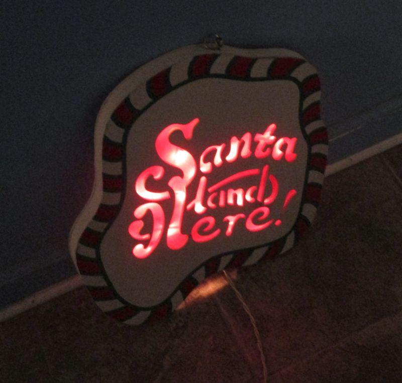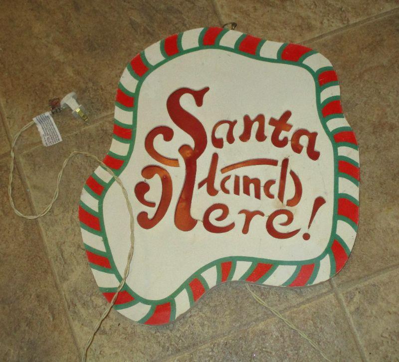 It says the same thing on both sides and has a place at the top to hang it with. About 15.5" tall.
