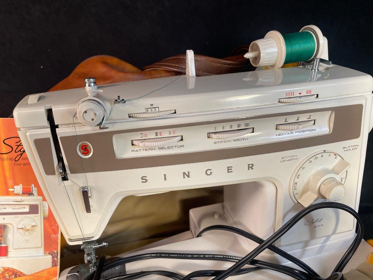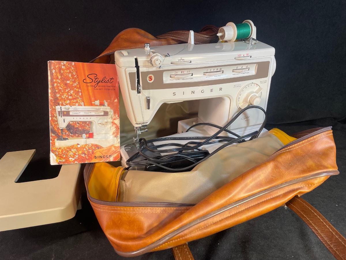 Vintage Singer "Stylist" zig-zag, free-arm, mechanical sewing machine model 834 comes with original carrying case. Untested