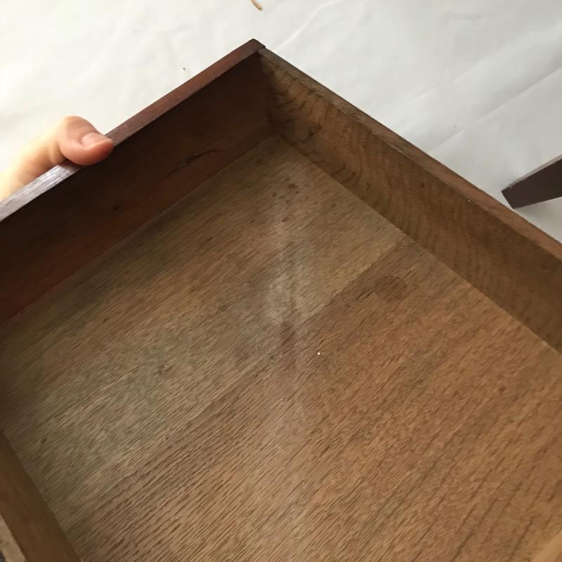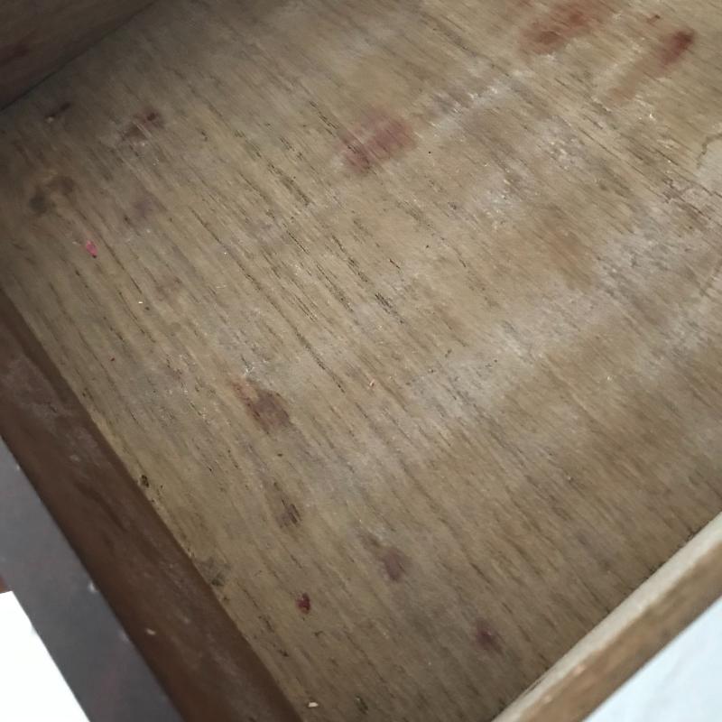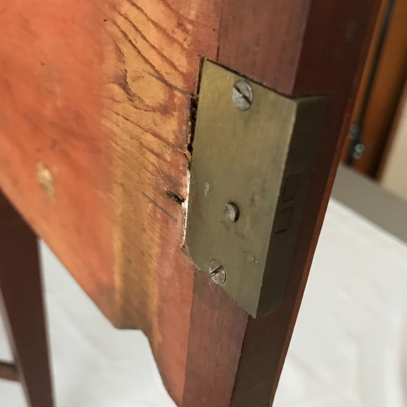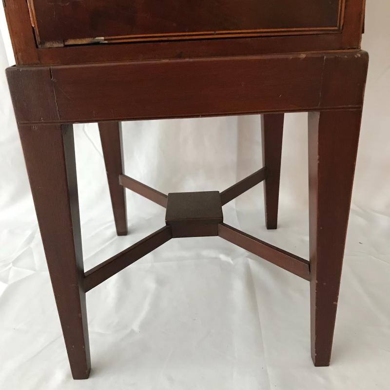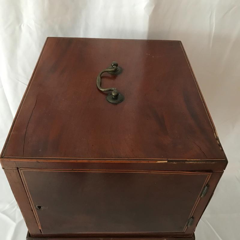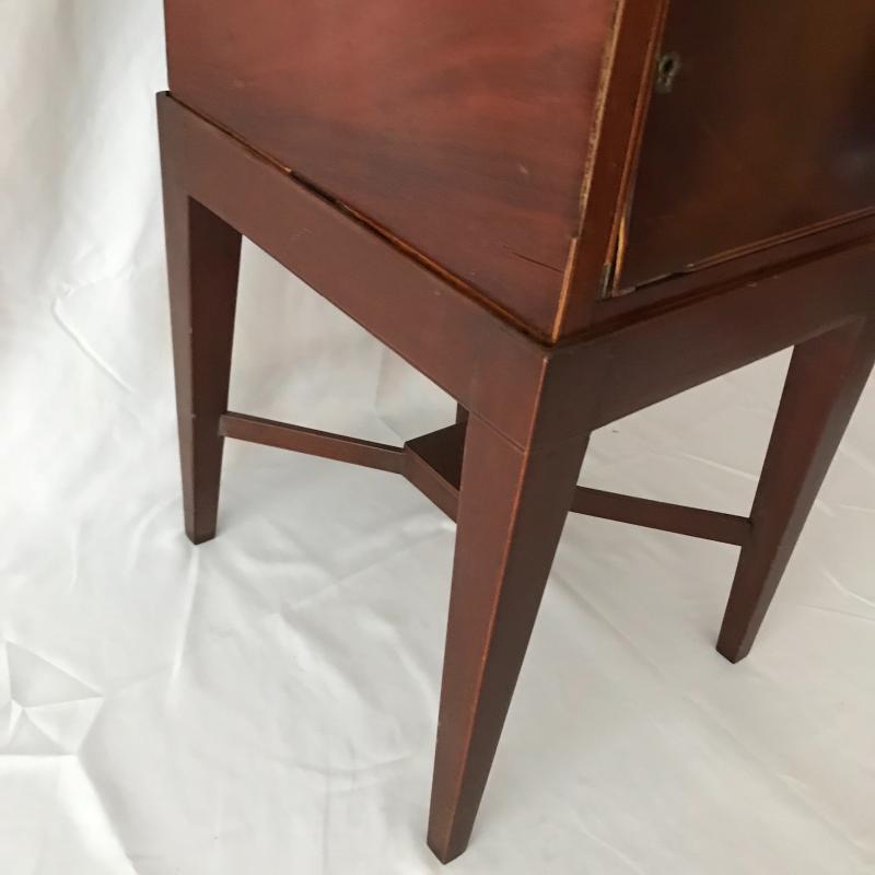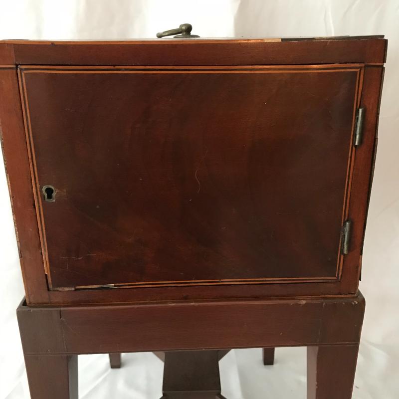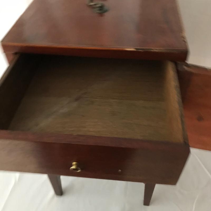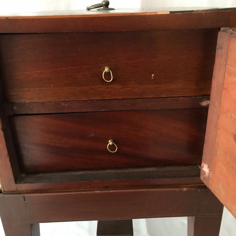 This small piece opens to reveal two drawers. Top sits on stand. Some damage to wood on door. See pics for details. No key Approx 12.5” x 11” x 21”. No shipping available. Local pickup only in Asheville, NC.
