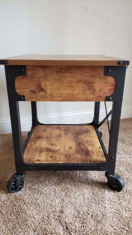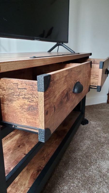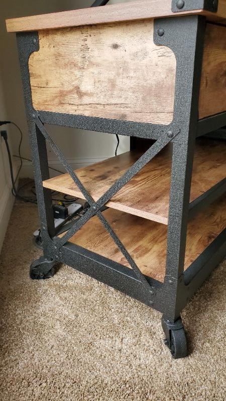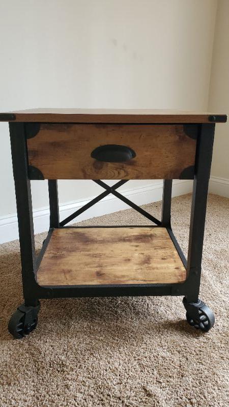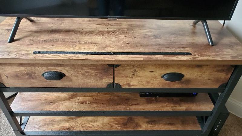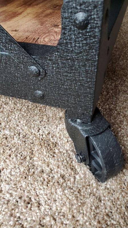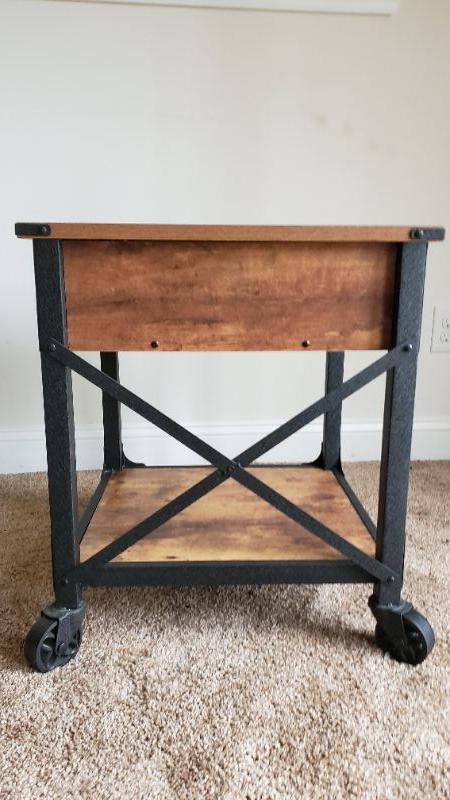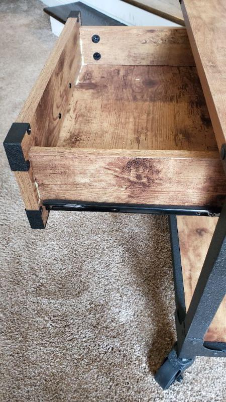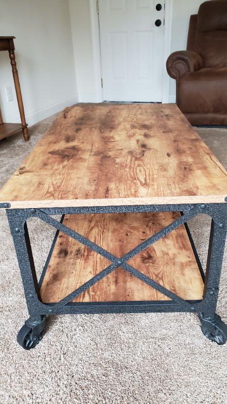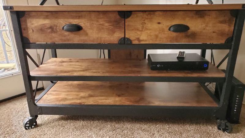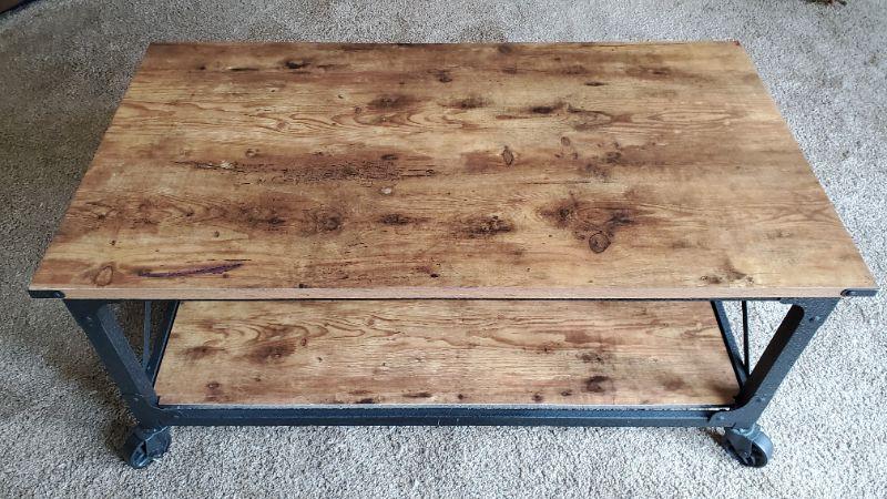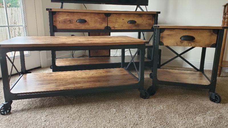 Metal and faux wood coffee table, side table, and TV stand with storage. Small repair to finish on coffee table
