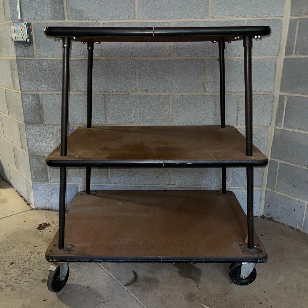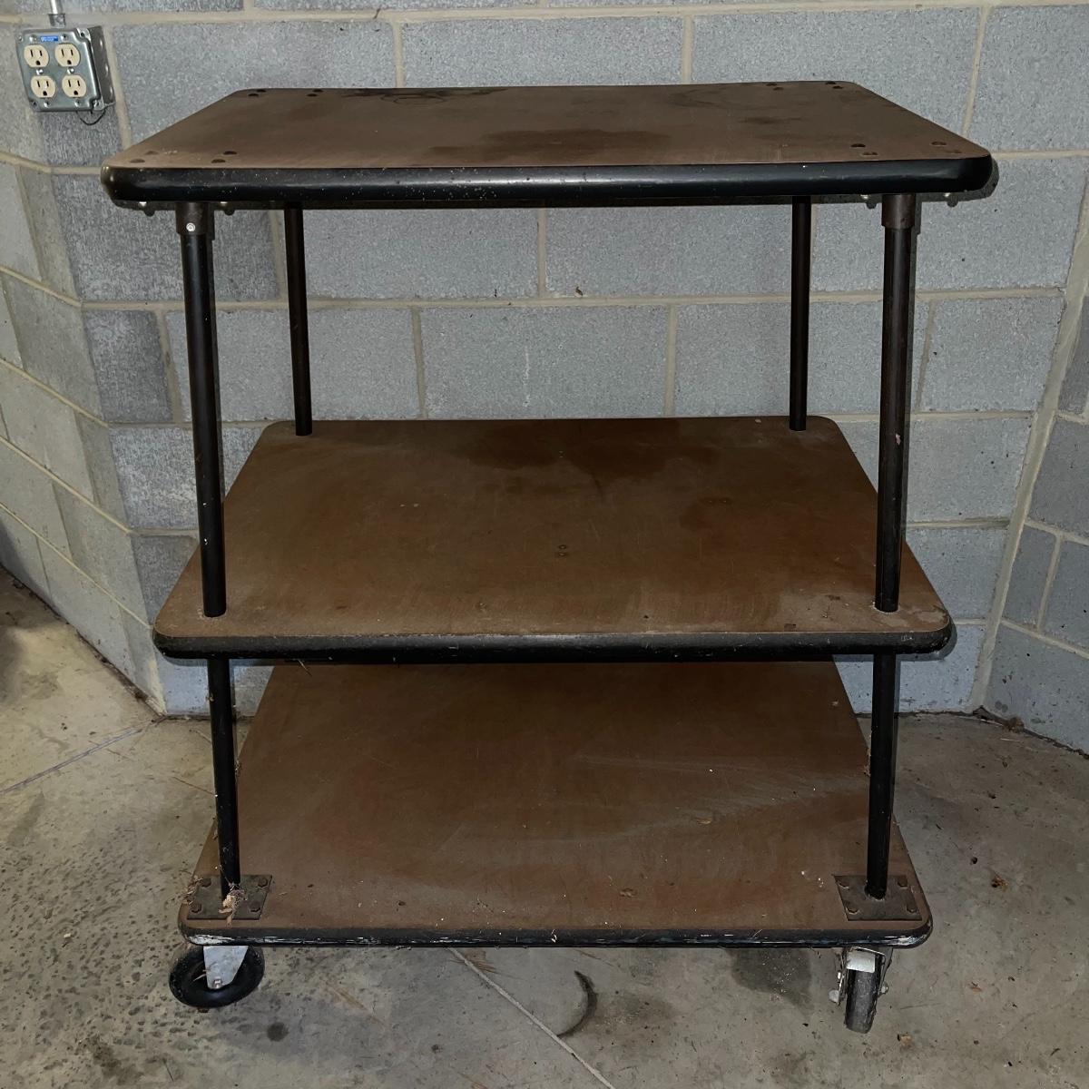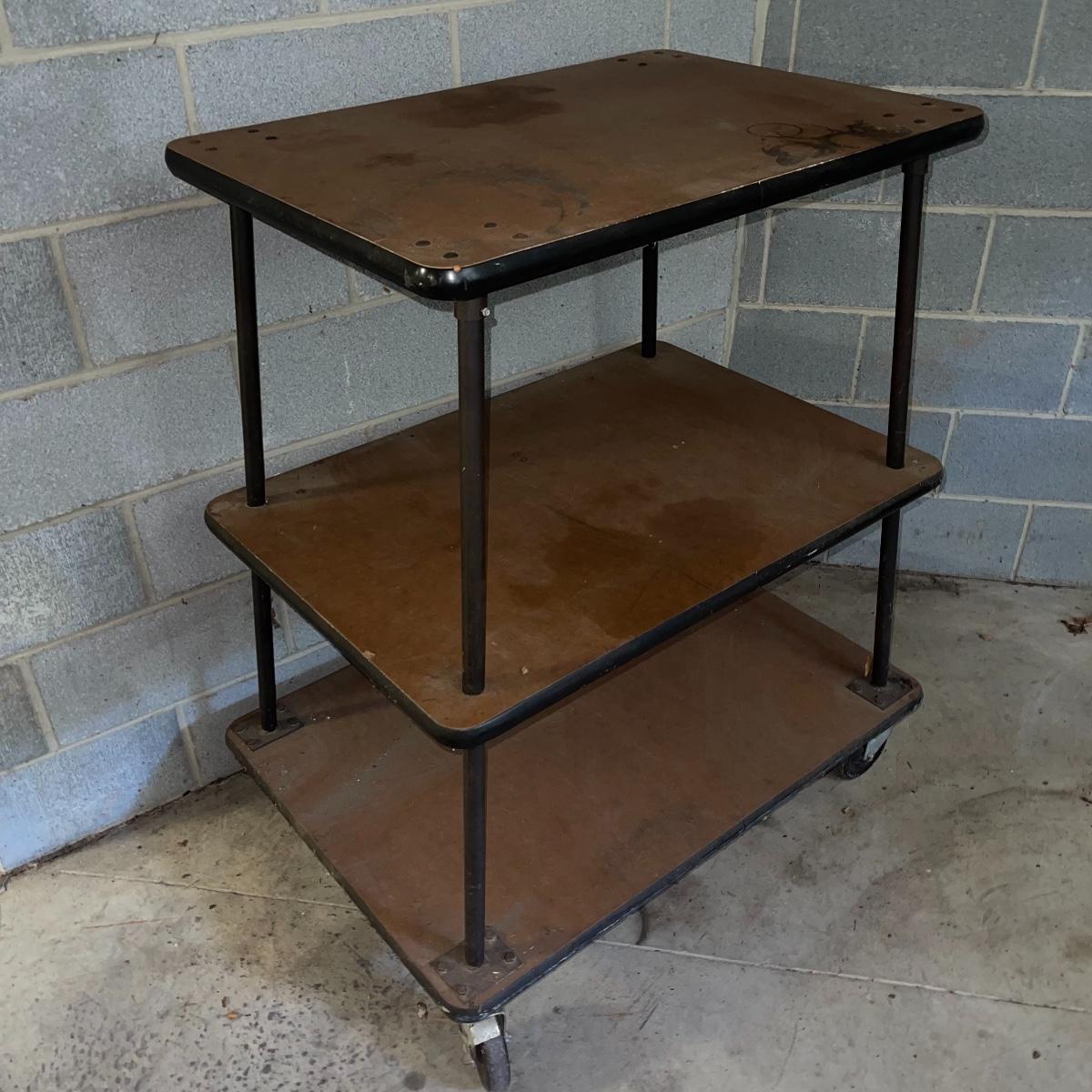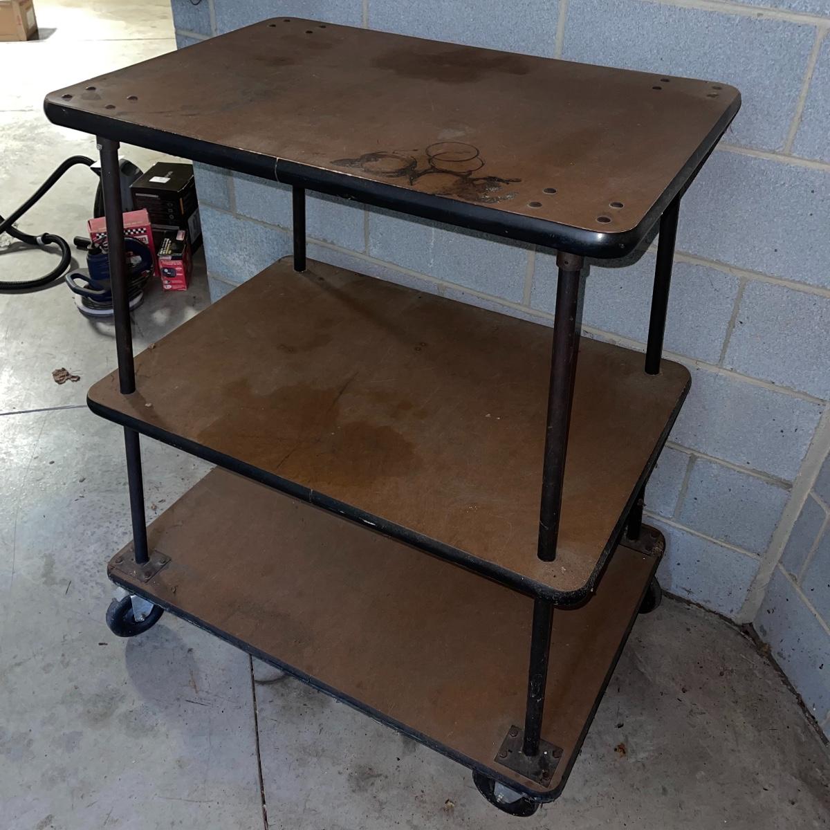 With three large shelves and wheels, this rolling shelf is ideal for any storage. It is 44.5 inches tall and the shelves, with the largest on the bottom, are each slightly smaller than the shelf below. The largest shelf measures 38 inches by 27.5 inches and the smallest, 33.25 inches by 23.25 inches. There is some wear and various marks due to being garage storage, but with a dusting, wipe down, and possible refinish, this shelf unit can be indoor storage once again.