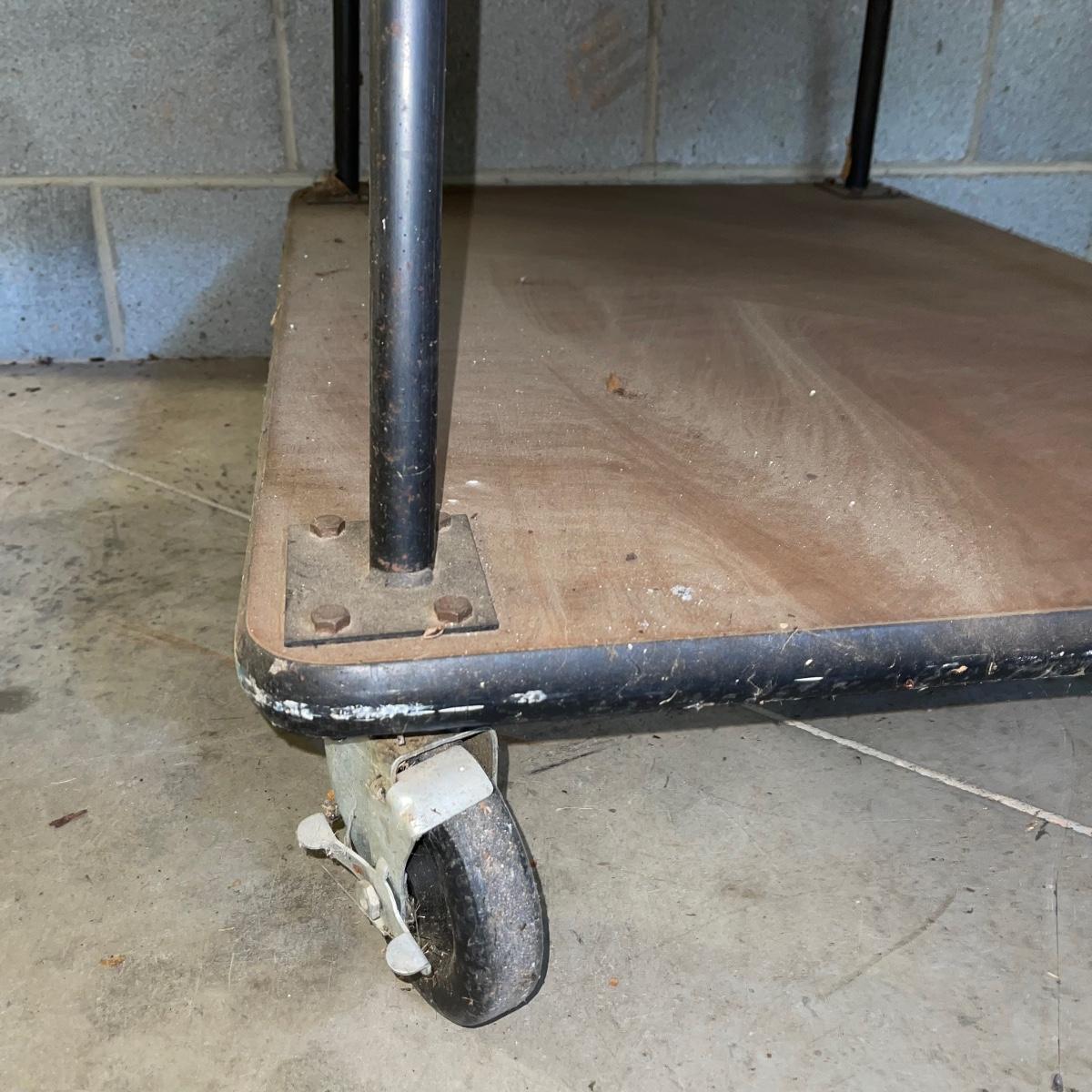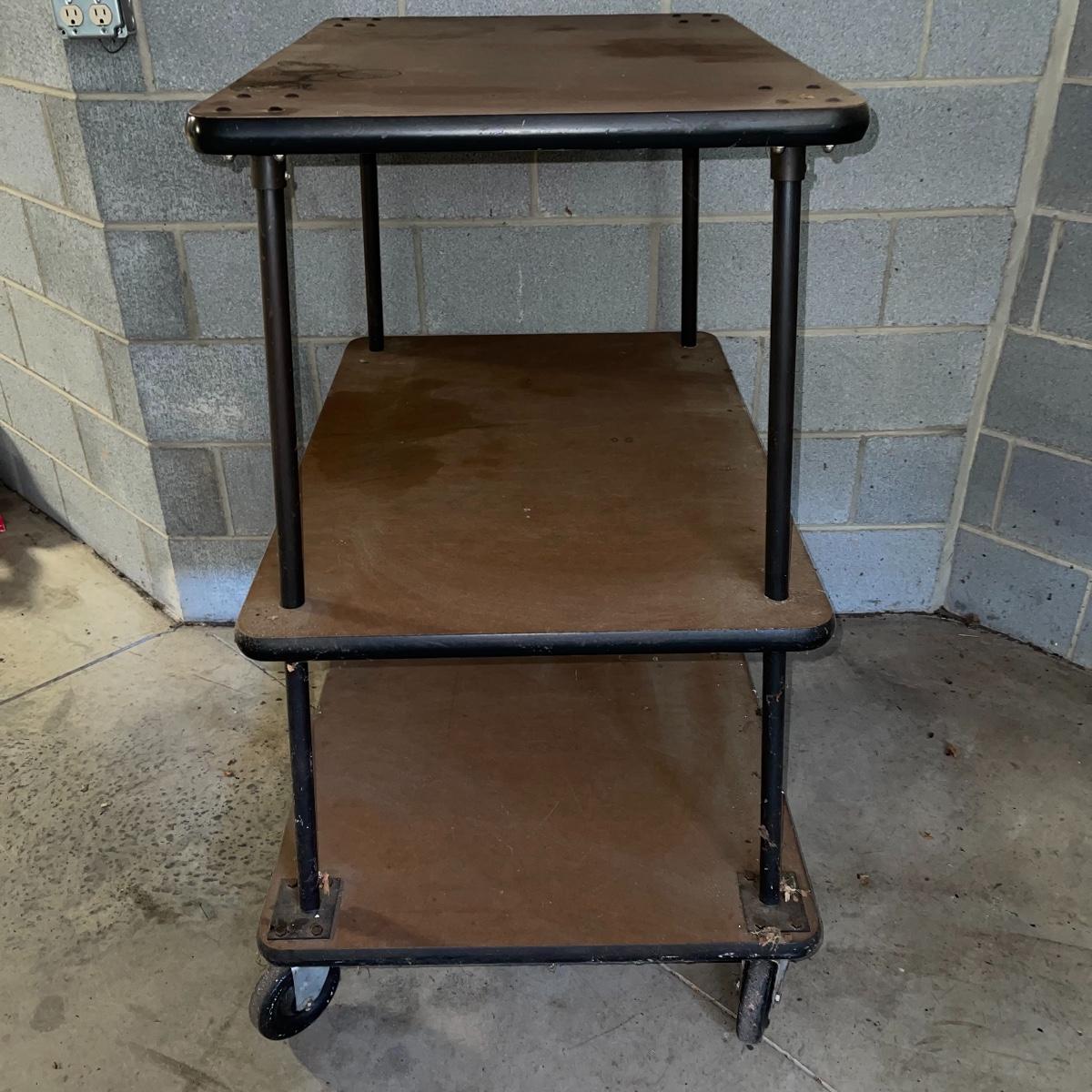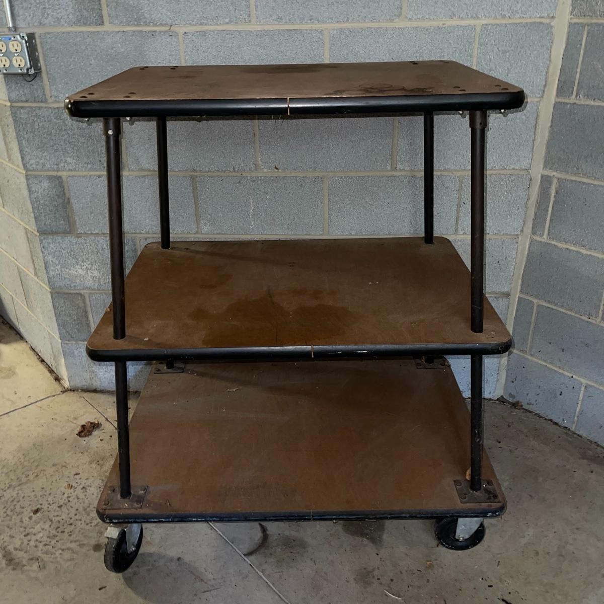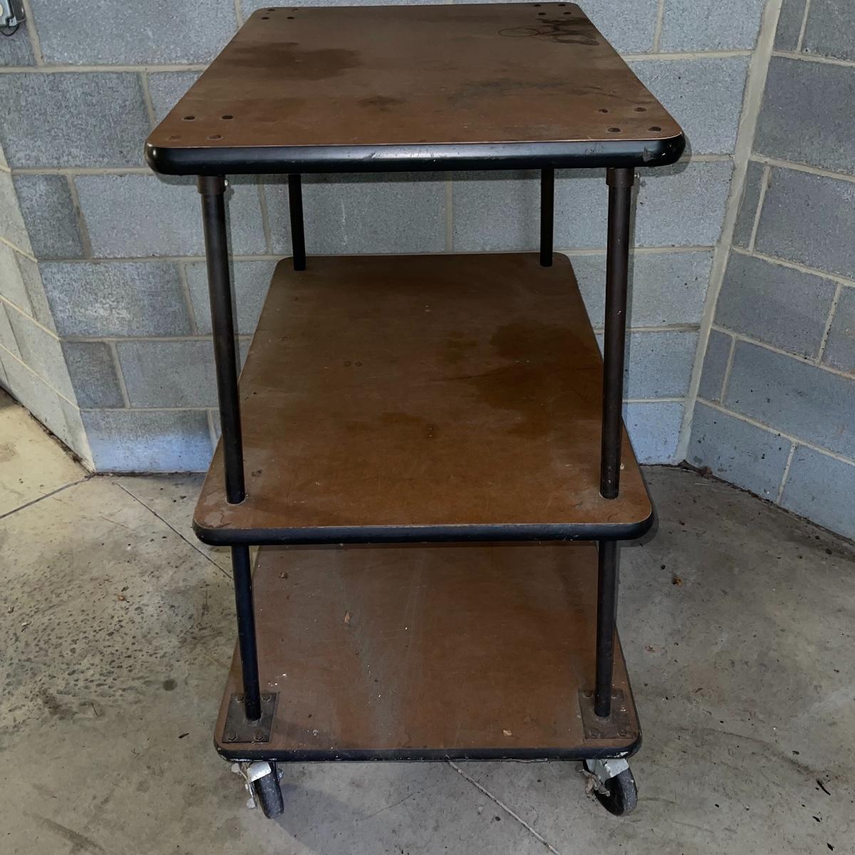 With three large shelves and wheels, this rolling shelf is ideal for any storage. It is 44.5 inches tall and the shelves, with the largest on the bottom, are each slightly smaller than the shelf below. The largest shelf measures 38 inches by 27.5 inches and the smallest, 33.25 inches by 23.25 inches. There is some wear and various marks due to being garage storage, but with a dusting, wipe down, and possible refinish, this shelf unit can be indoor storage once again.