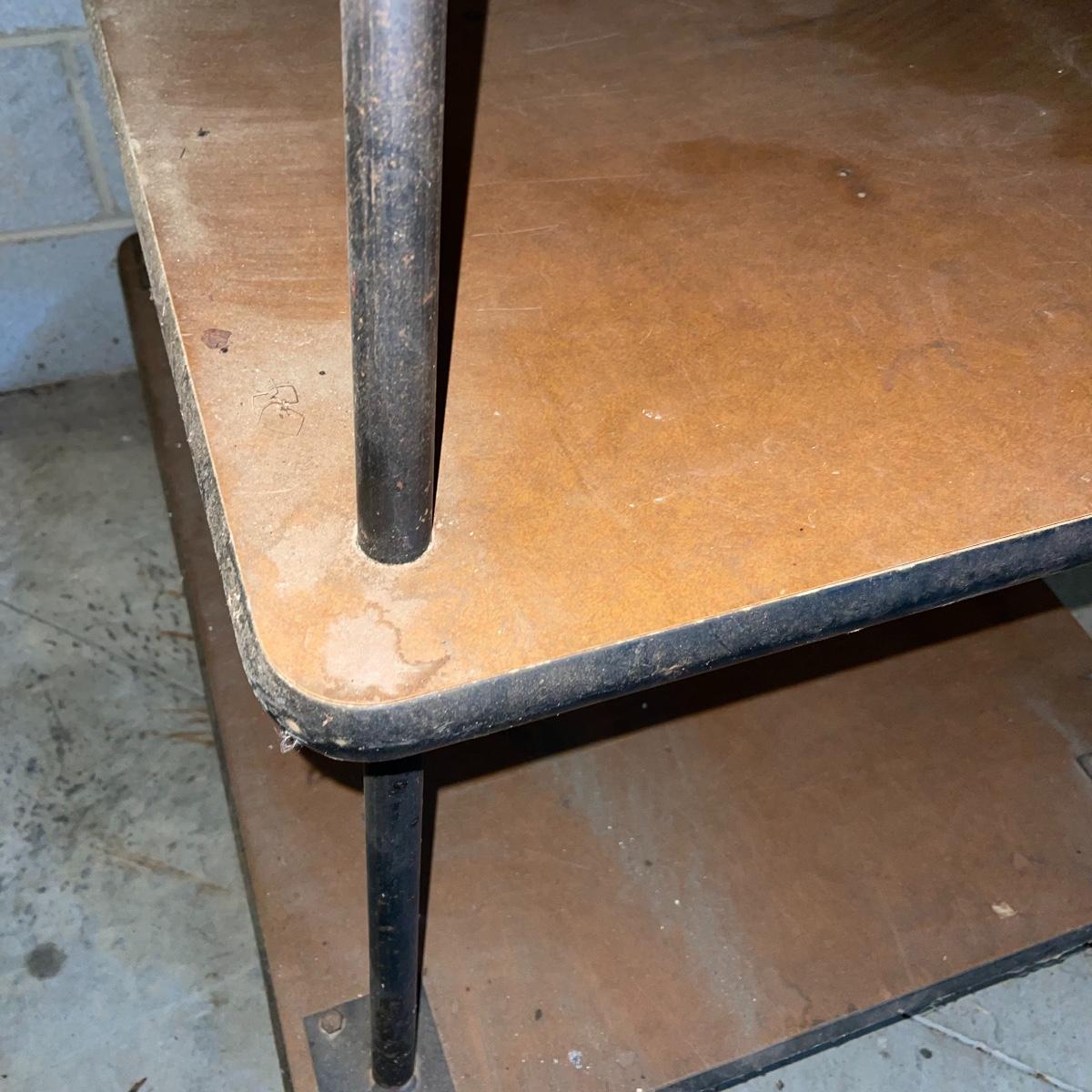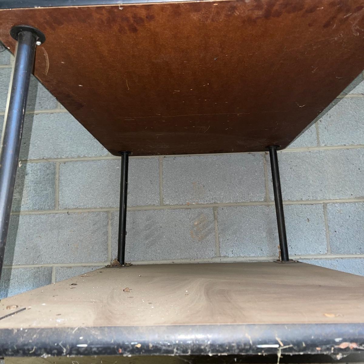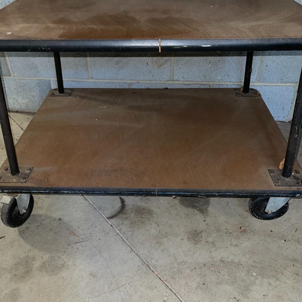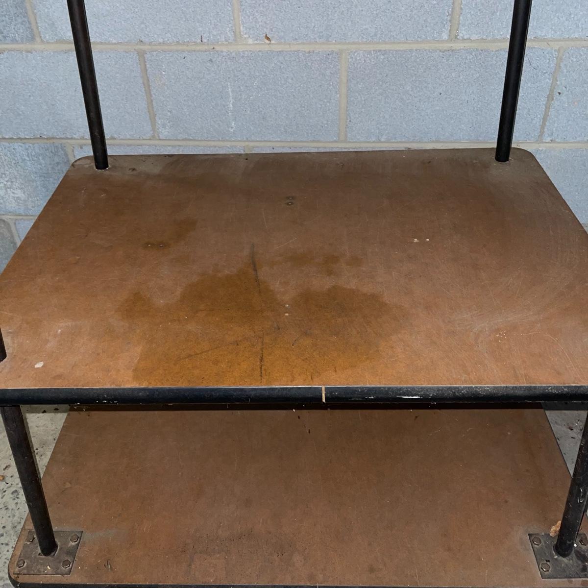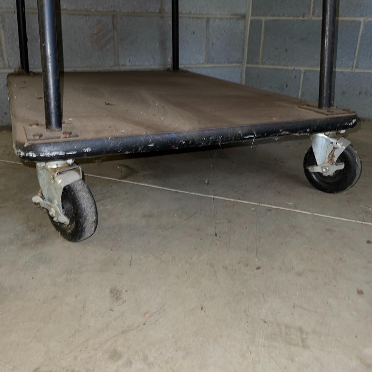 With three large shelves and wheels, this rolling shelf is ideal for any storage. It is 44.5 inches tall and the shelves, with the largest on the bottom, are each slightly smaller than the shelf below. The largest shelf measures 38 inches by 27.5 inches and the smallest, 33.25 inches by 23.25 inches. There is some wear and various marks due to being garage storage, but with a dusting, wipe down, and possible refinish, this shelf unit can be indoor storage once again.