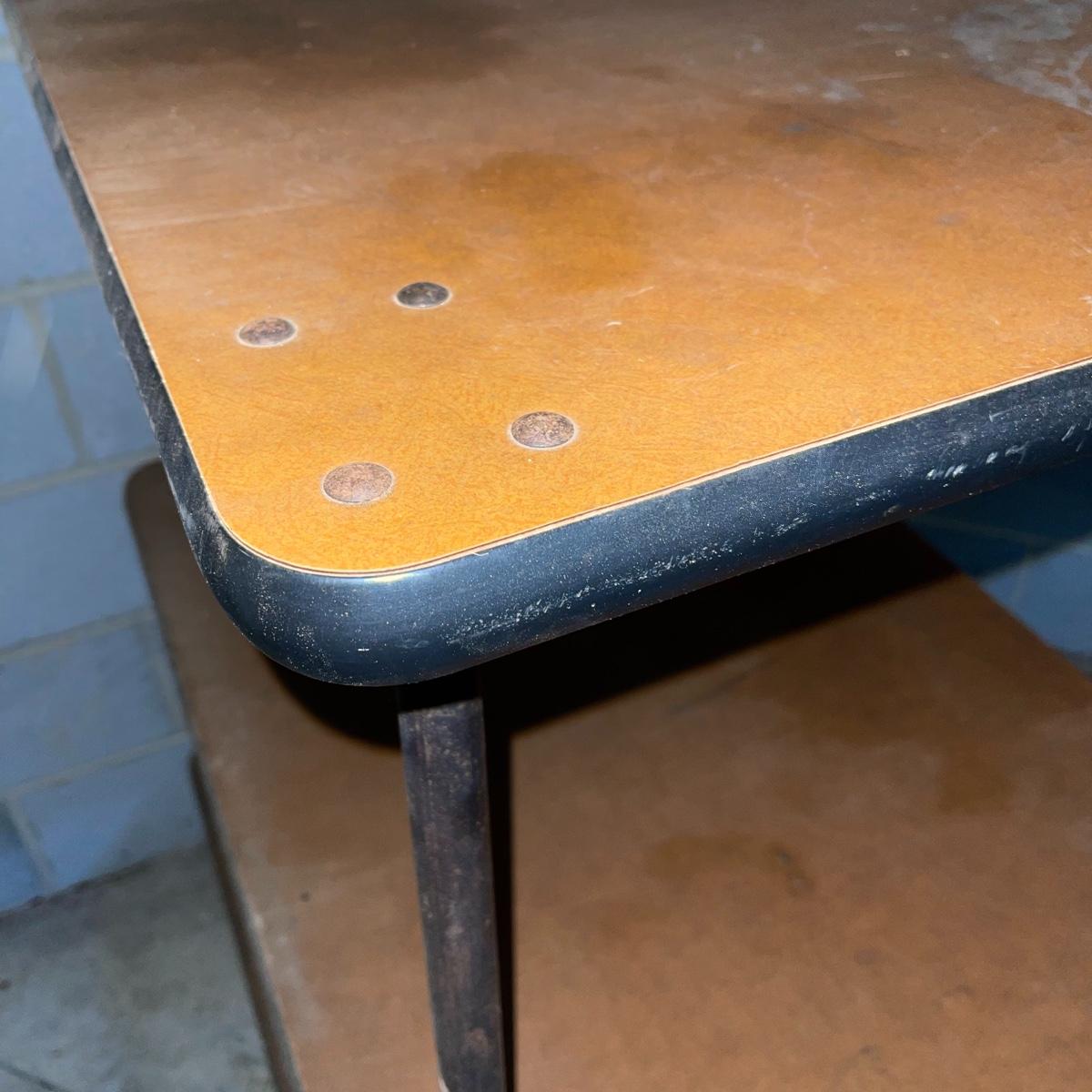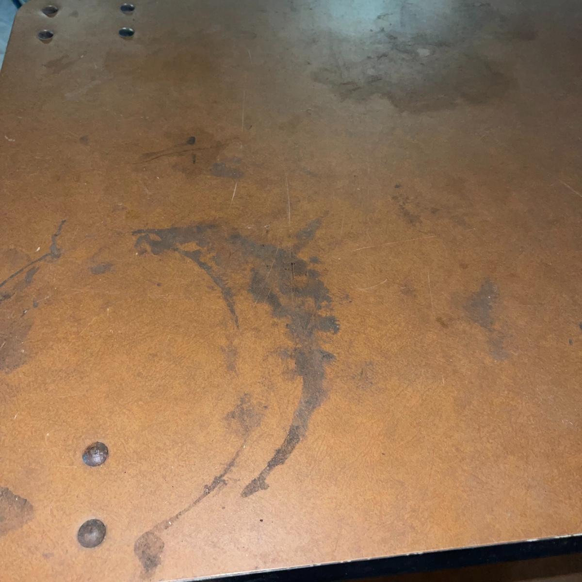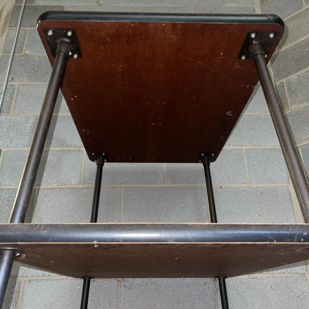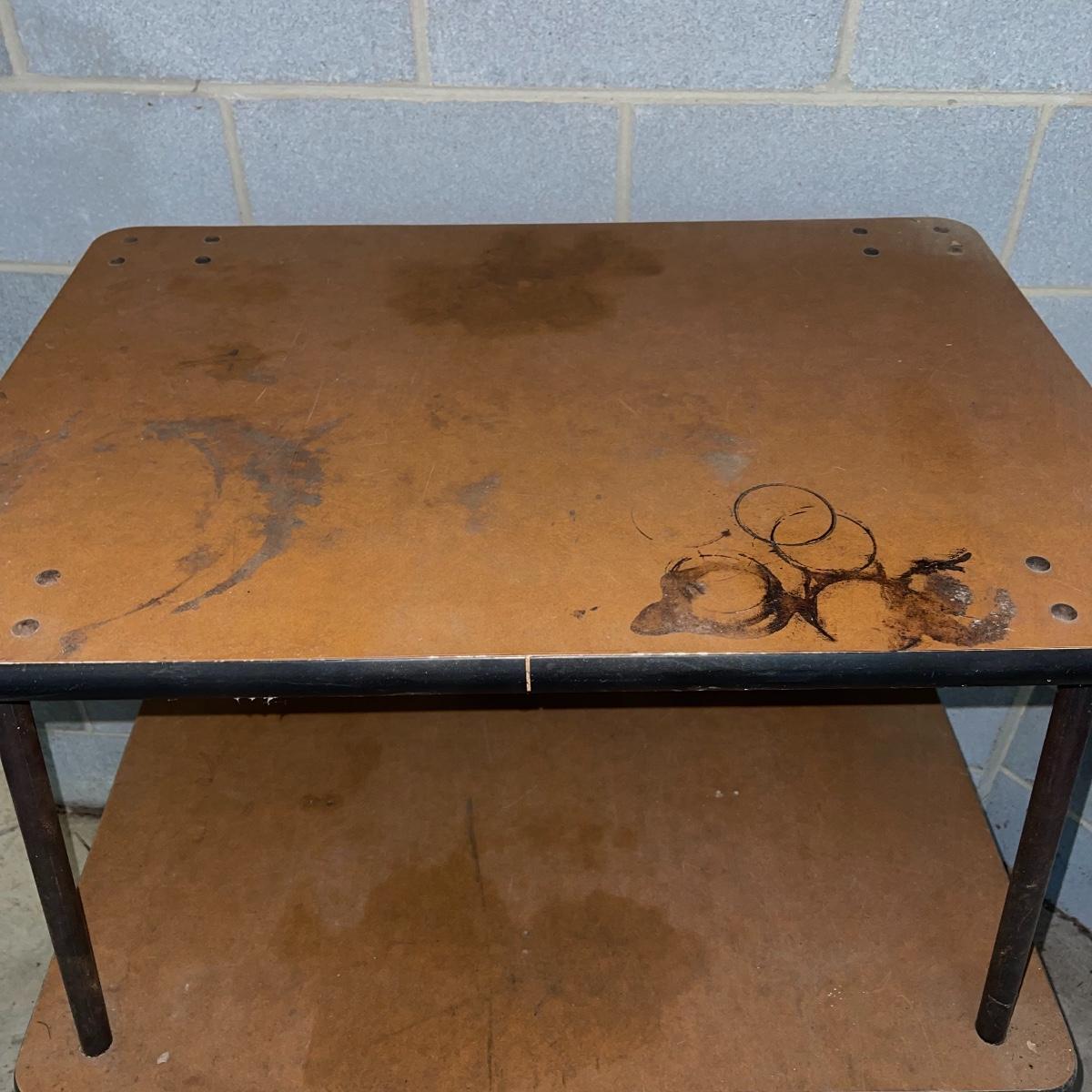 With three large shelves and wheels, this rolling shelf is ideal for any storage. It is 44.5 inches tall and the shelves, with the largest on the bottom, are each slightly smaller than the shelf below. The largest shelf measures 38 inches by 27.5 inches and the smallest, 33.25 inches by 23.25 inches. There is some wear and various marks due to being garage storage, but with a dusting, wipe down, and possible refinish, this shelf unit can be indoor storage once again.