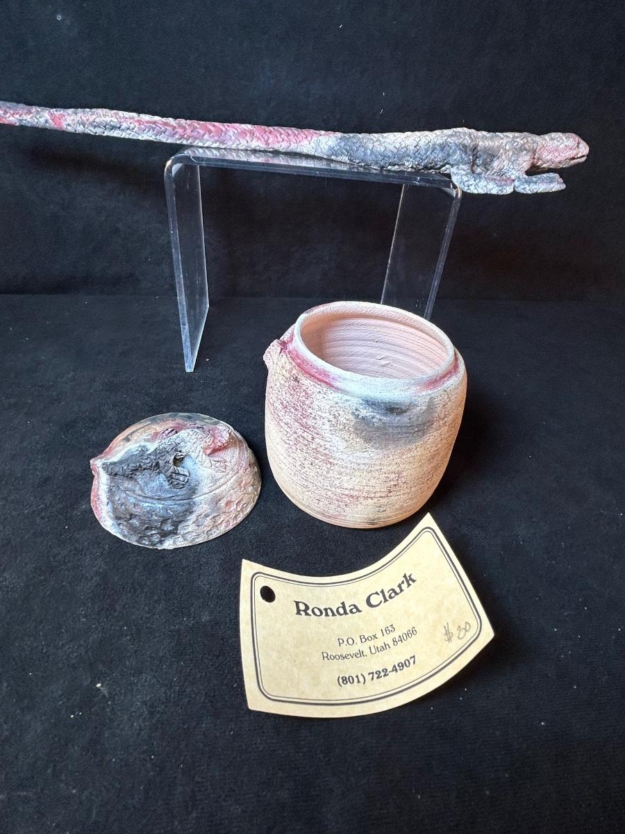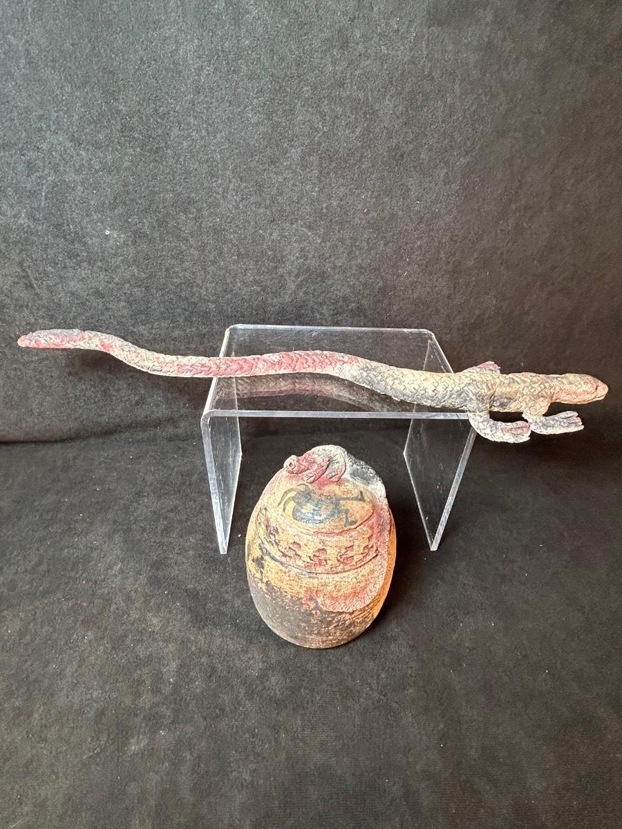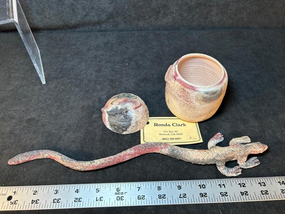 clay lizard and covered jar
