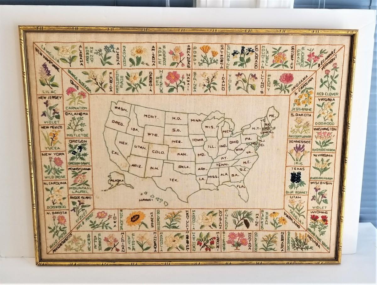 Nice framed vintage embroidery/sampler - map of the U.S. with the State Flowers. Vintage condition. 24.5" across, 18.75" tall.
