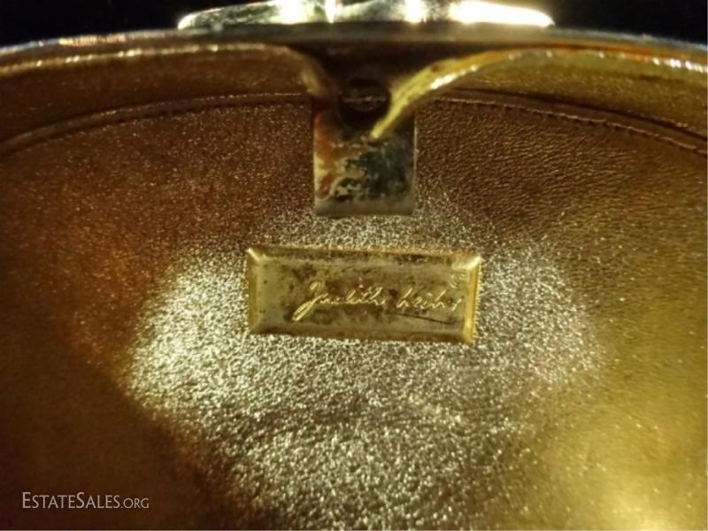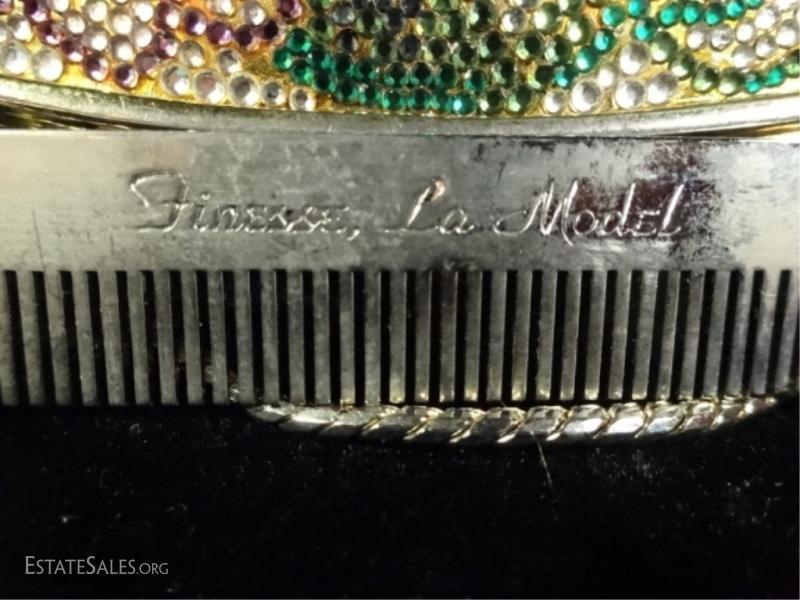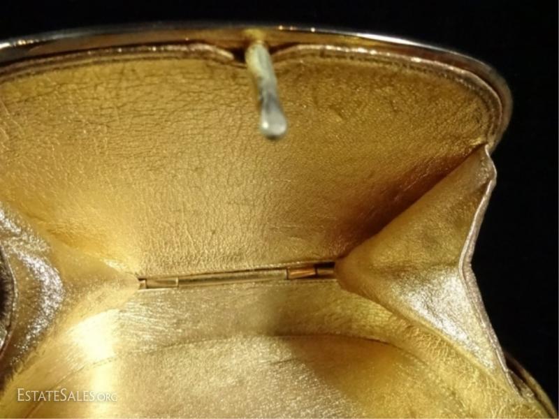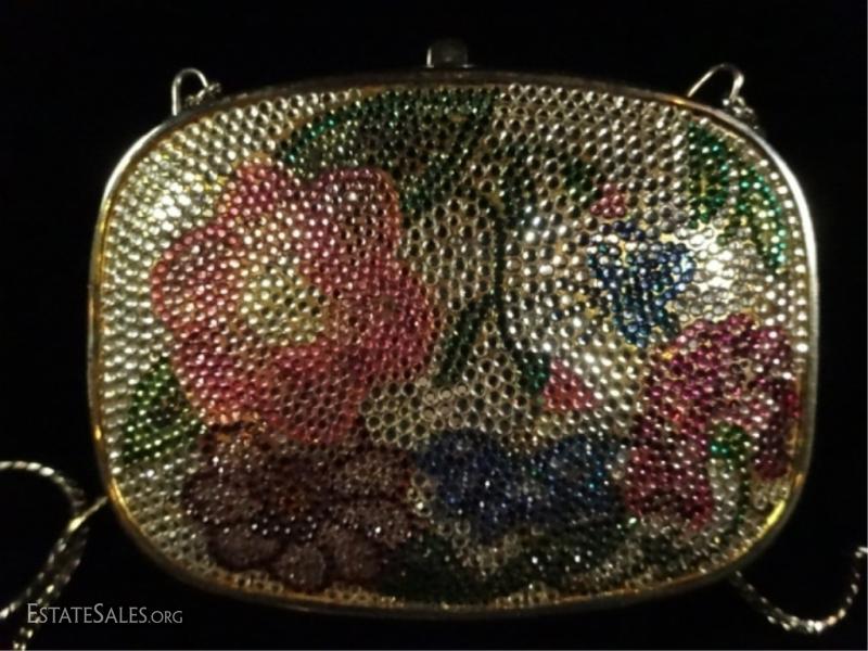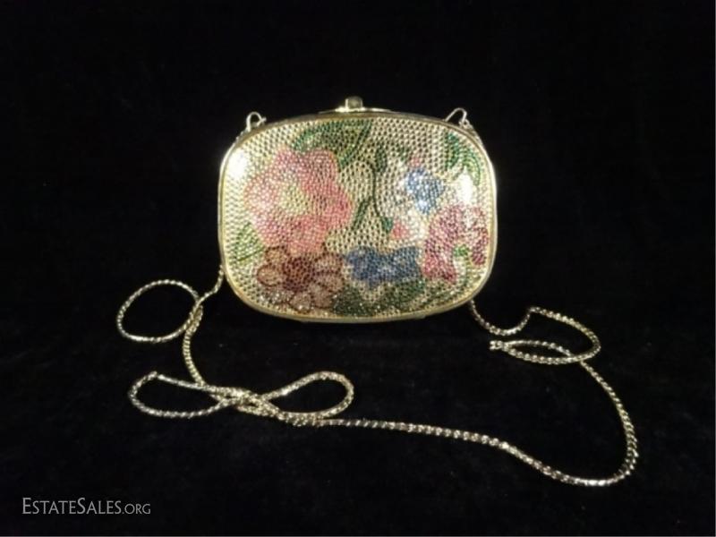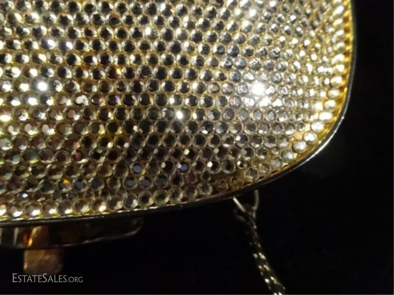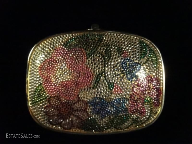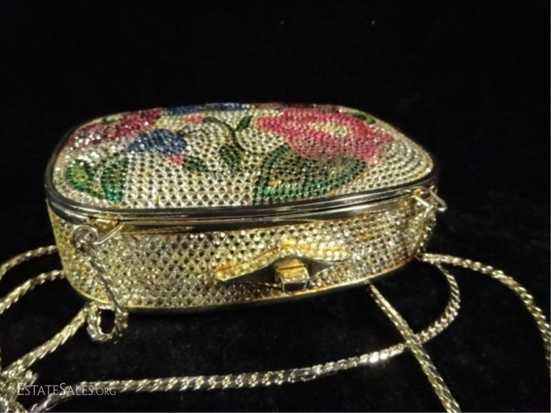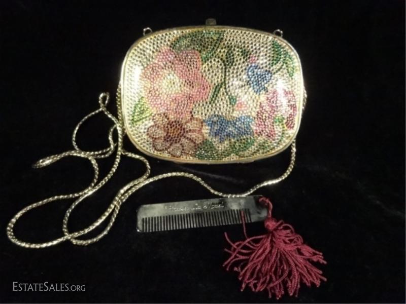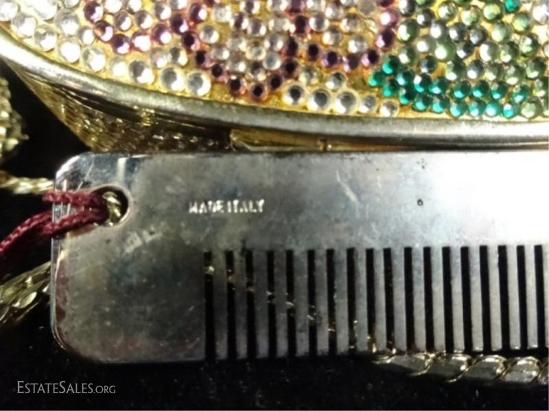 LOT 69: VINTAGE JUDITH LEIBER MINAUDIERE CLUTCH HANDBAG, FLORAL DESIGN SWAROVSKI CRYSTALS ON GOLD BACKGROUND, INCLUDES FINESSE LA MODEL COMB MADE IN ITALY, VERY GOOD GENTLY USED CONDITION WITH A FEW MISSING CRYSTALS, MINOR DAMAGE TO HINGE (NOT READILY APPARENT FROM OUTSIDE, DOES NOT AFFECT FUNCTION), APPROX 4.25" X 5" X 1.75"