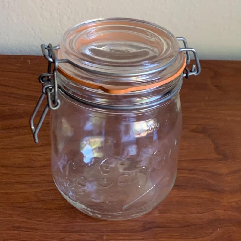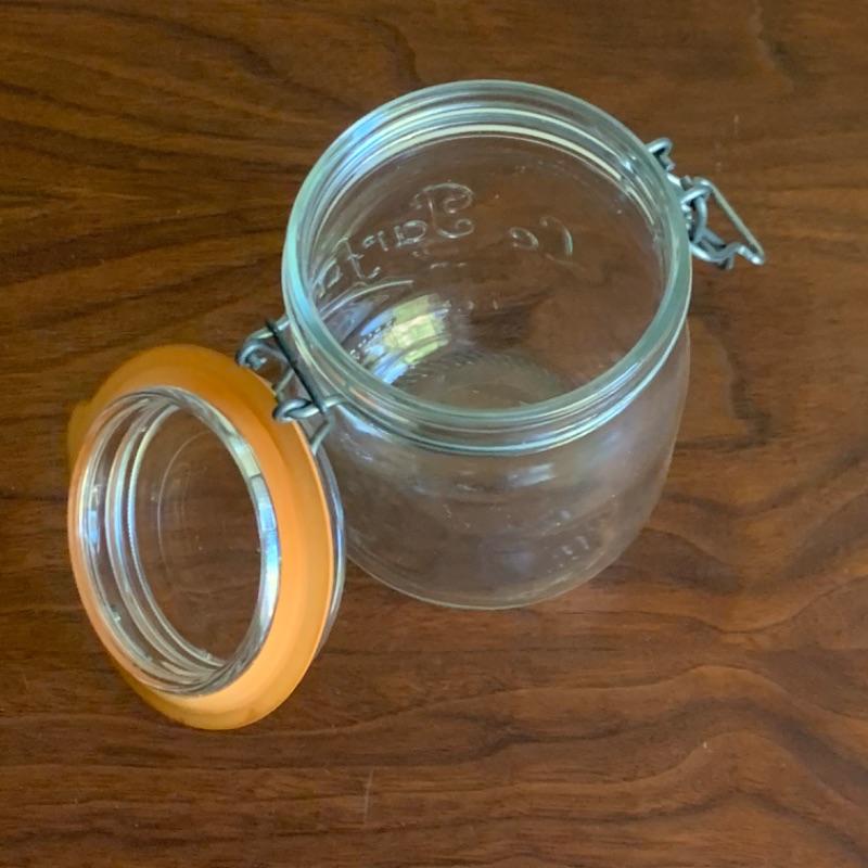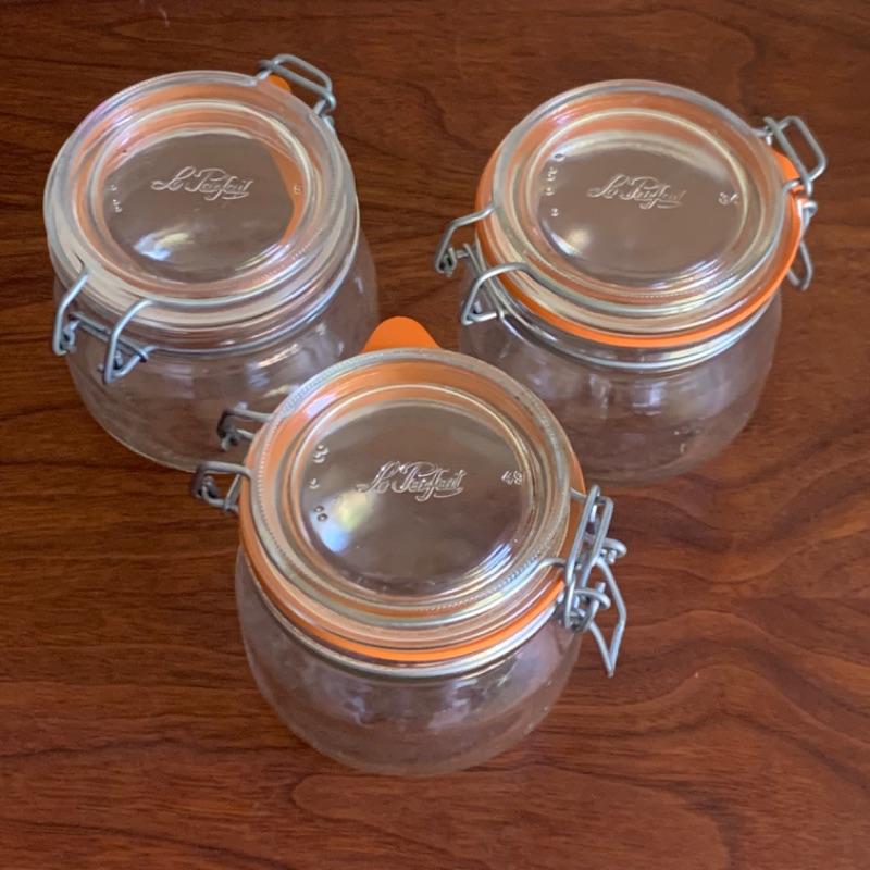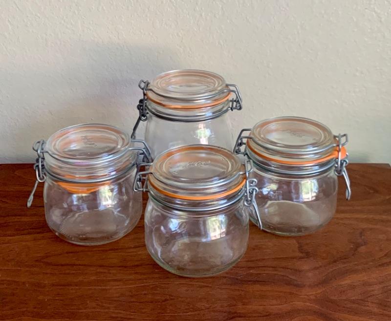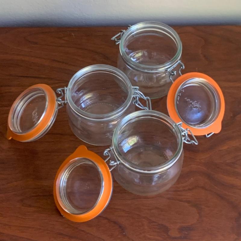 4 La Parfait, clear glass canning jars with orange seal ring and bails. 3 - 560 ml and 1 - 0.75 l. All in excellent vintage condition.