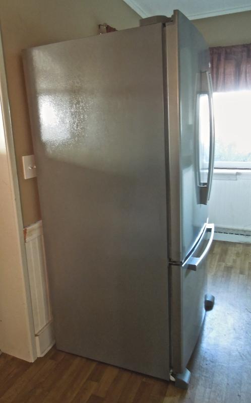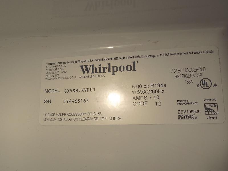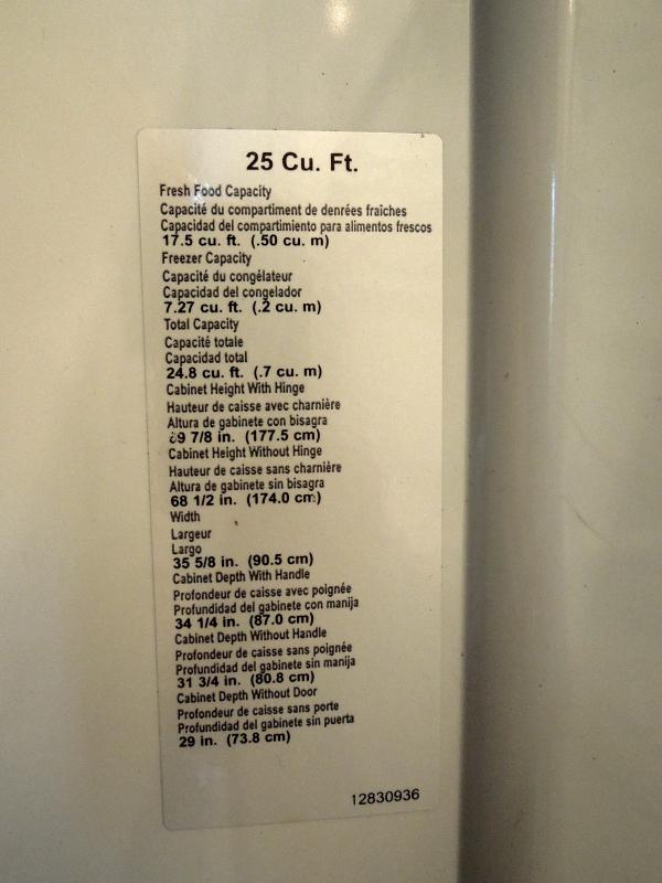 Model # GX5SHDXVD01. In good working order. Color is grey. Has stainless steel handles. Has been wiped clean. No terrible odors. 36" L x 31" W x 68" H. There is an icemaker in the freezer, but currently no waterline connected, so not able to verify it is working. If you bid please be sure you have someone to help you load it. It is easy access out front door with just two steps.