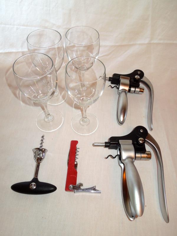 4 cork pullers of which two are heavy duty; 4 large wine glasses. All in excellent condition.