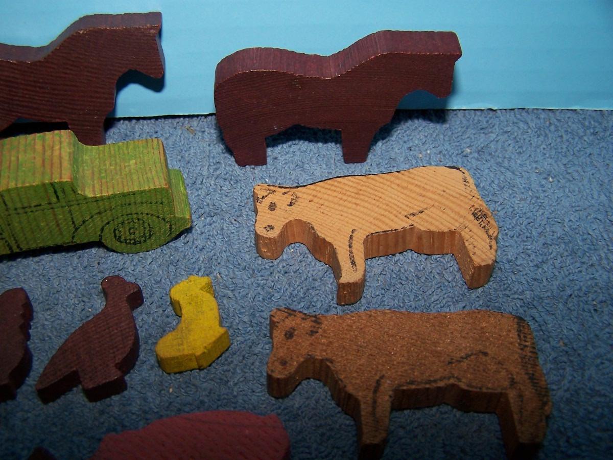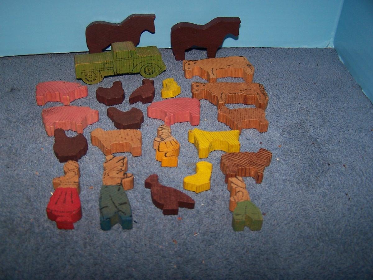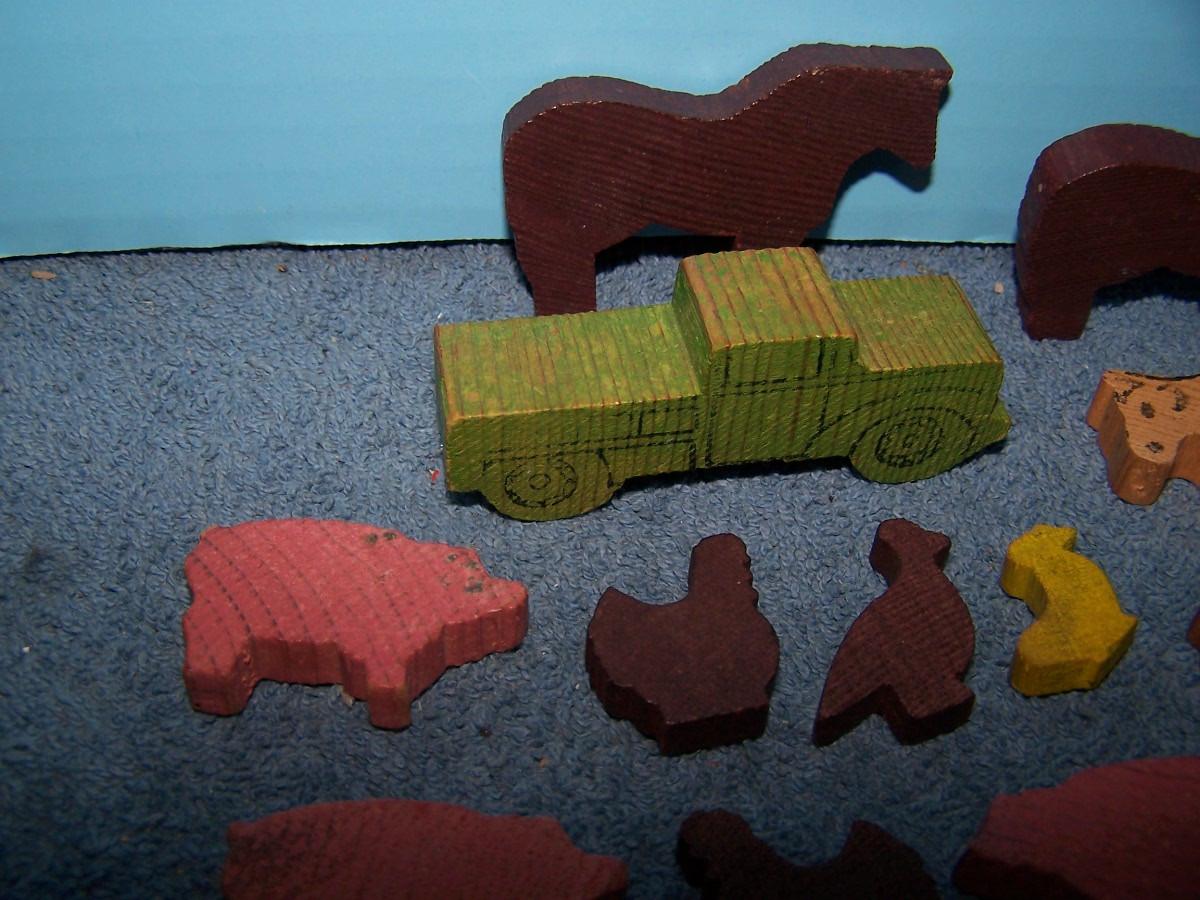 THESE ARE WONDERFUL VINTAGE MINI WOODEN FARM FIGURES!!! UNMARKED.. TRUCK-- 1 1/4'' X 3 1/4''.. LIGHT WEAR..