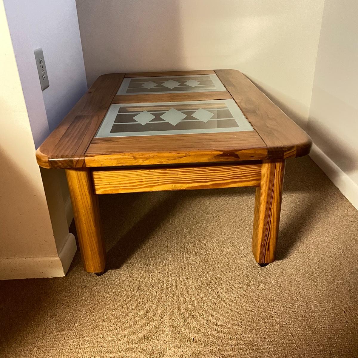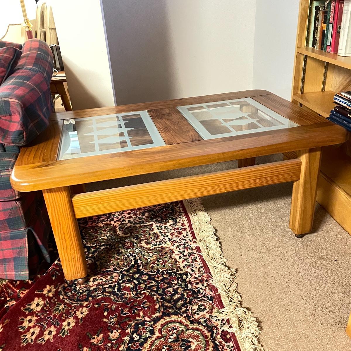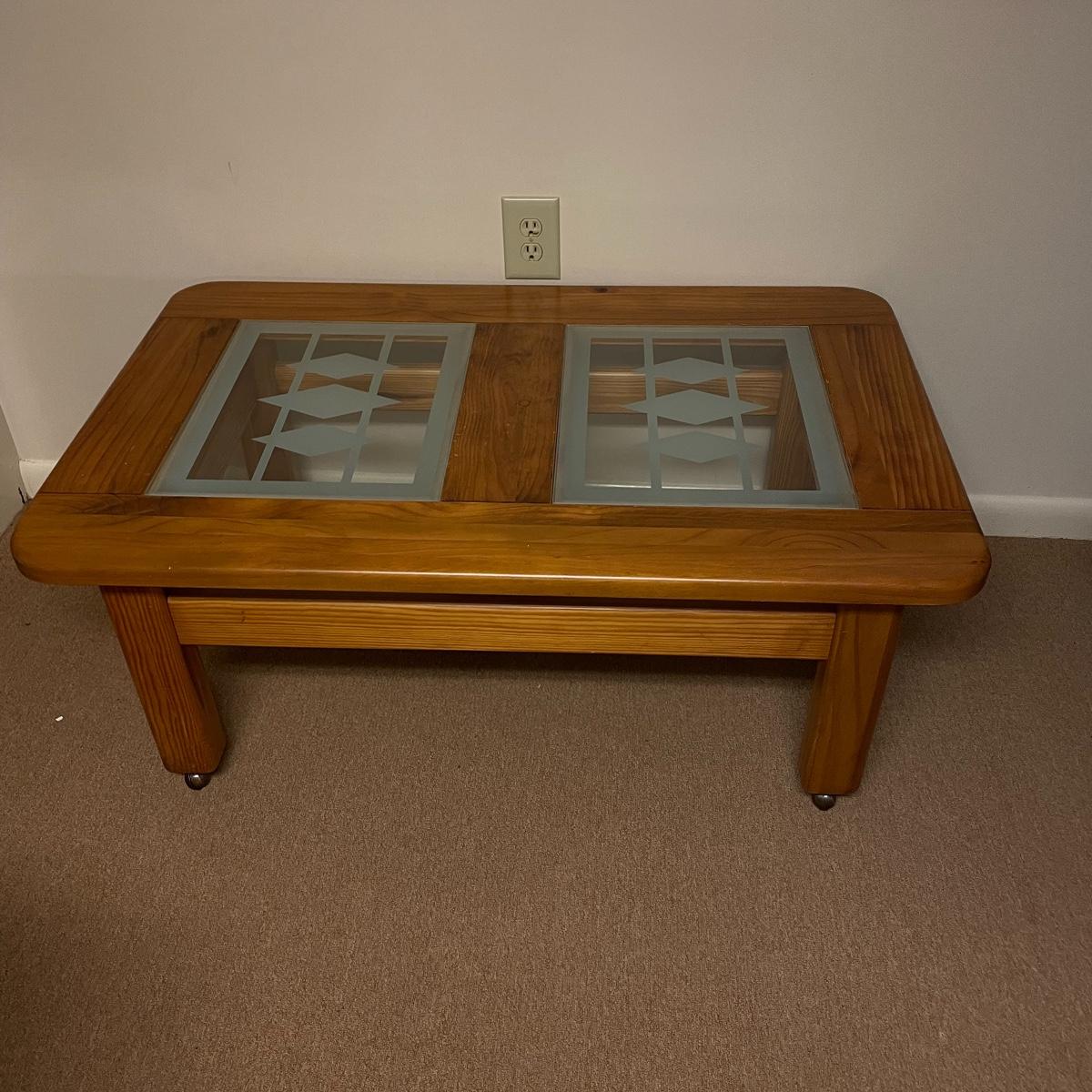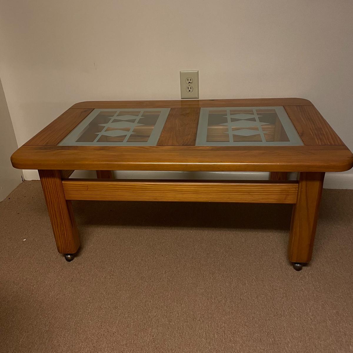 Nice oak like rolling coffee table with two MCM style glass panels. The wheels roll easily on carpet and the finish appears to be in great shape. The MCM style diamonds are the perfect addition to this neat piece. Table measures approximately 44” x 28” x 18.75”. See images. Local pick up only.