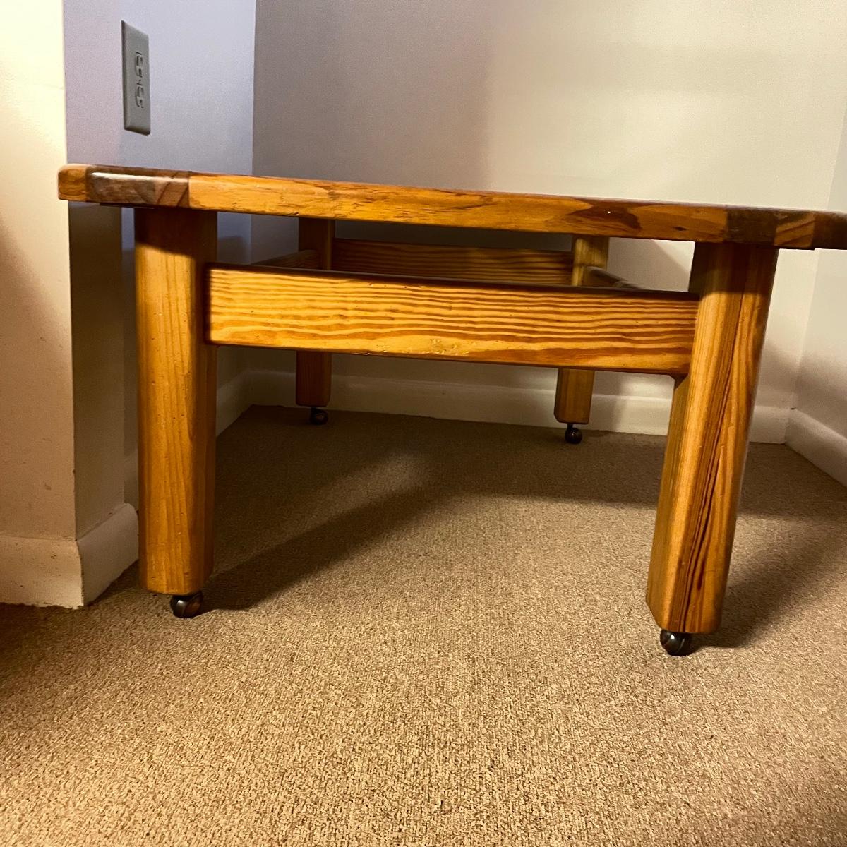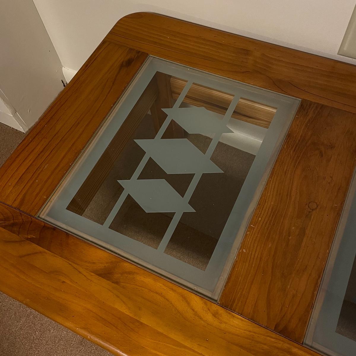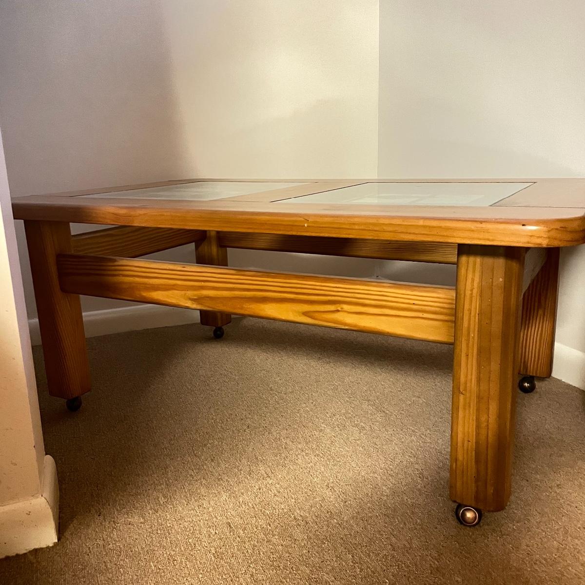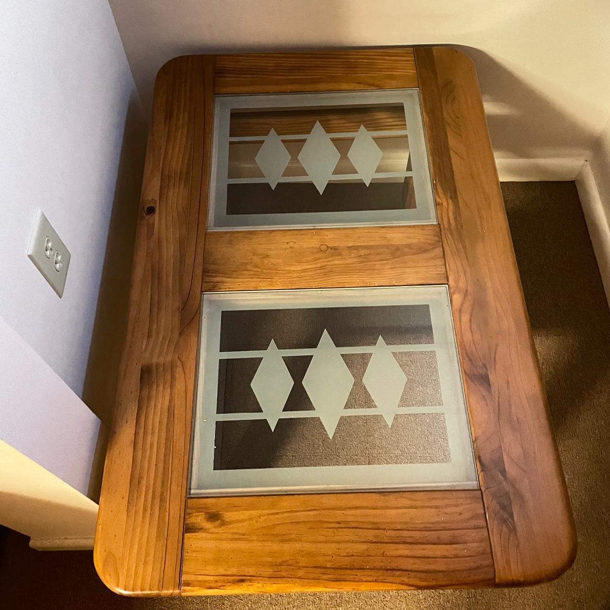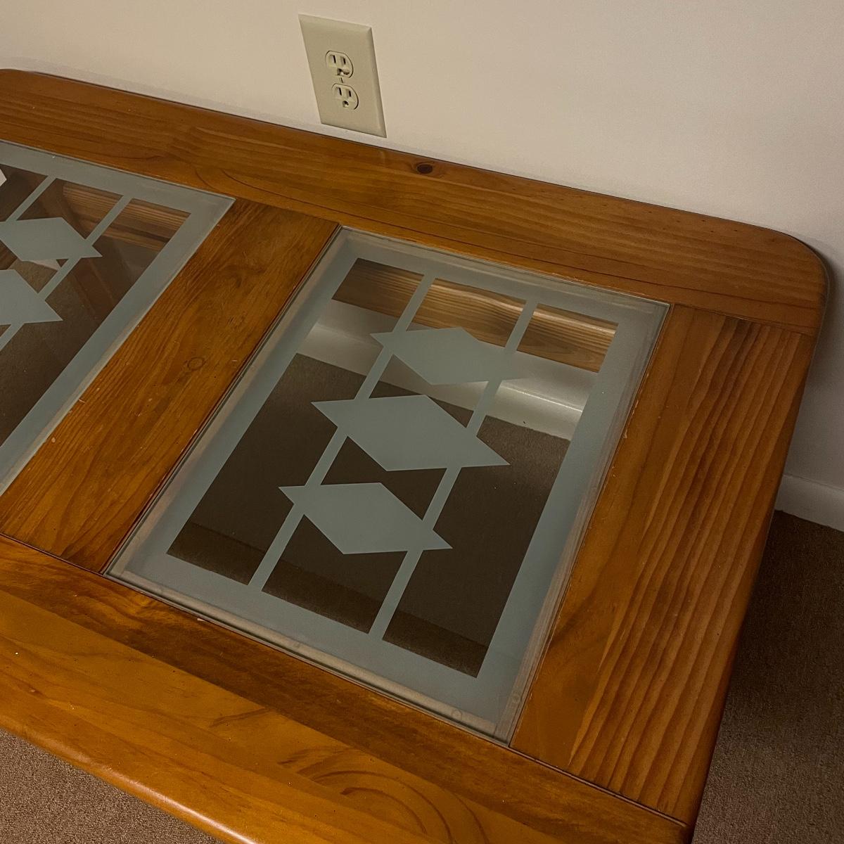 Nice oak like rolling coffee table with two MCM style glass panels. The wheels roll easily on carpet and the finish appears to be in great shape. The MCM style diamonds are the perfect addition to this neat piece. Table measures approximately 44” x 28” x 18.75”. See images. Local pick up only.