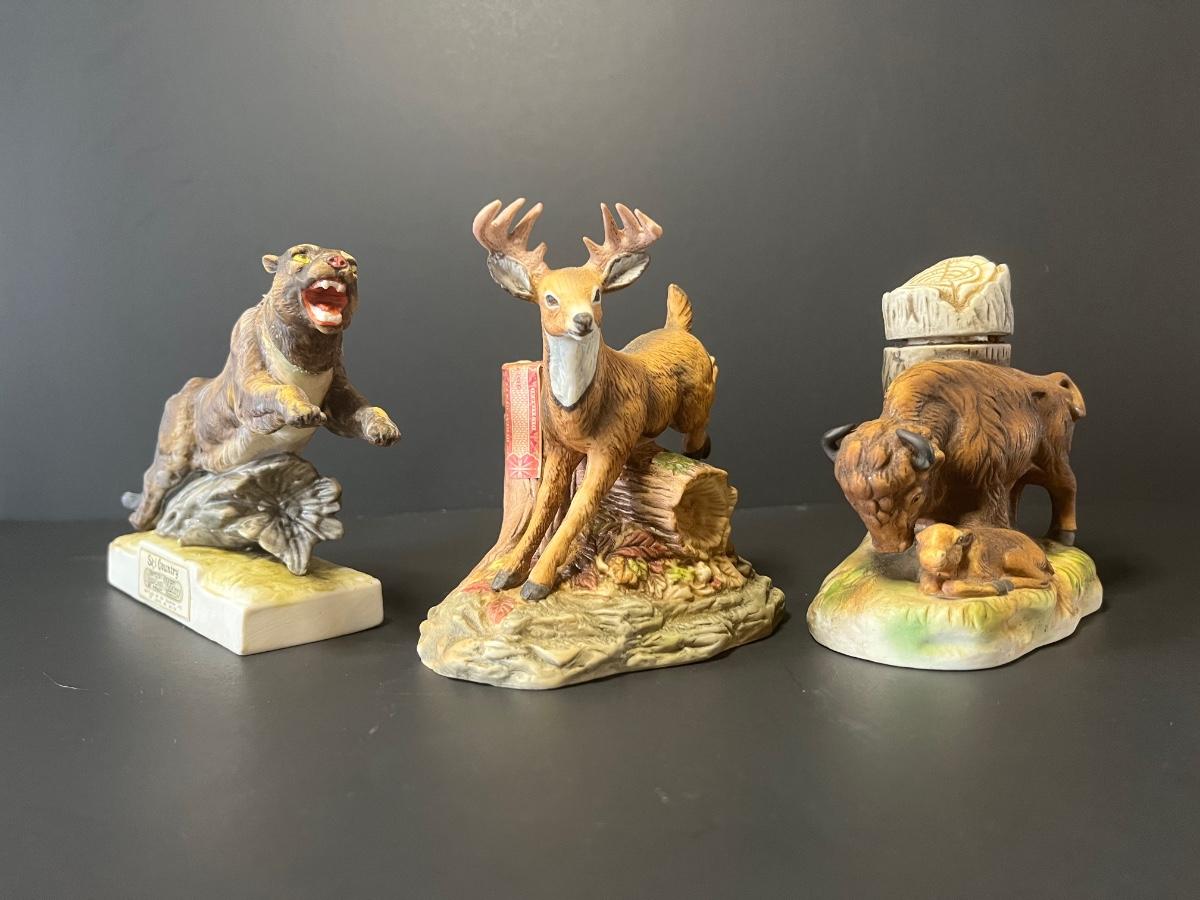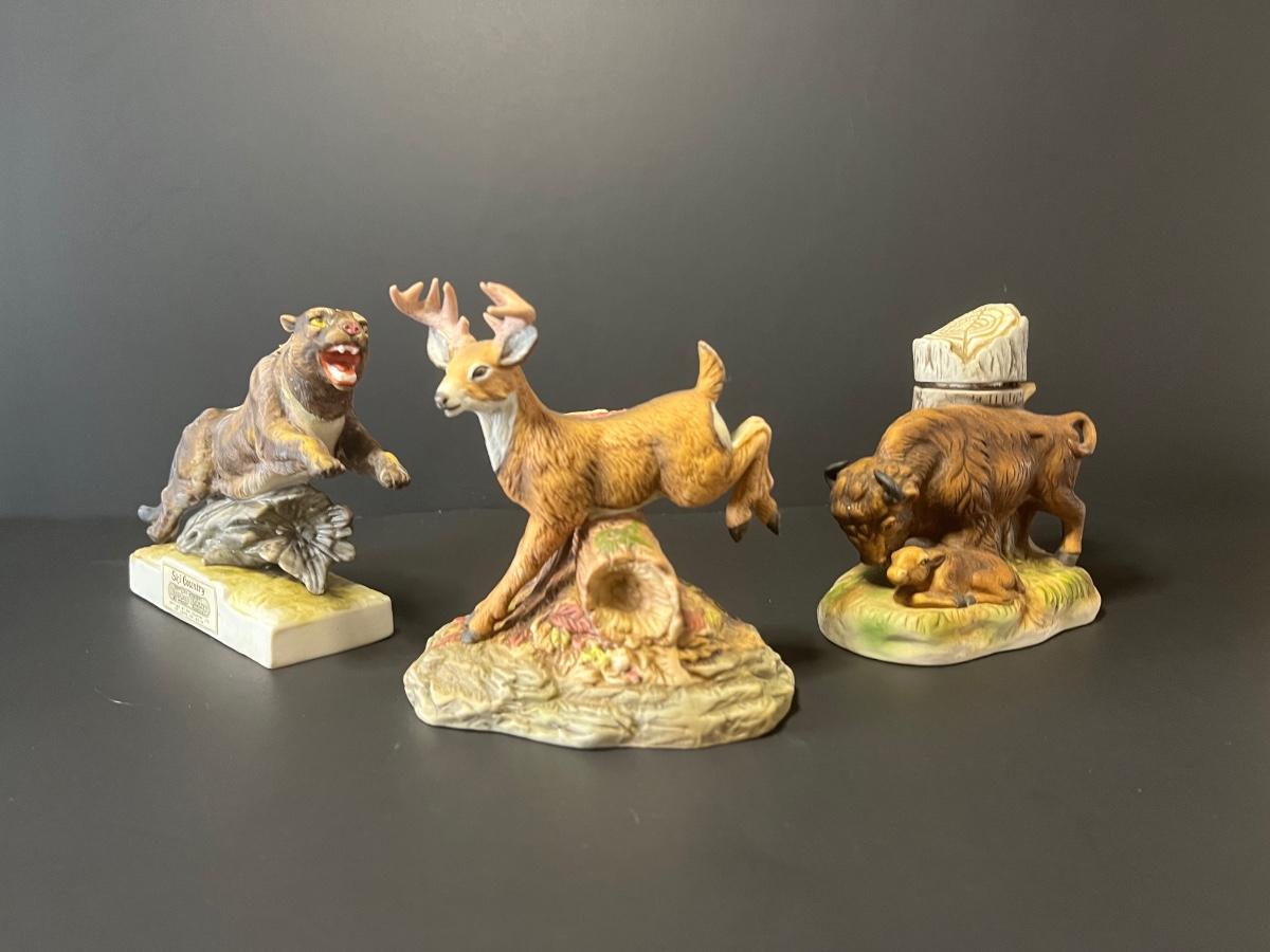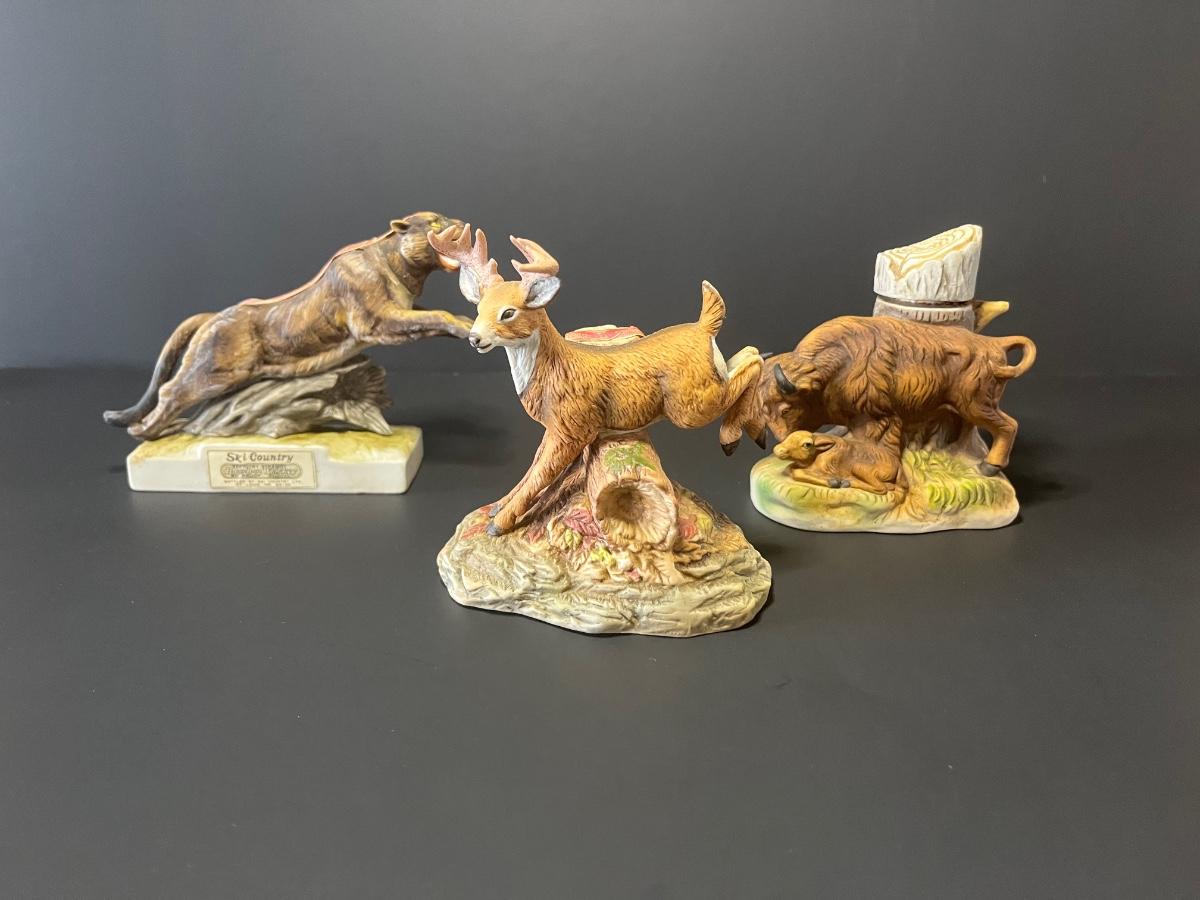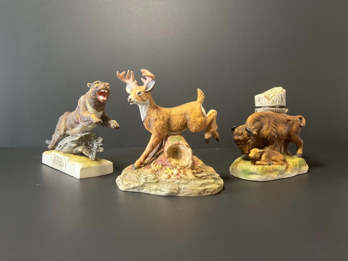 3 vintage liquor decanters, Bison, Deer and Mountain lion. For collecting/displaying purposes. Pre-owned.
