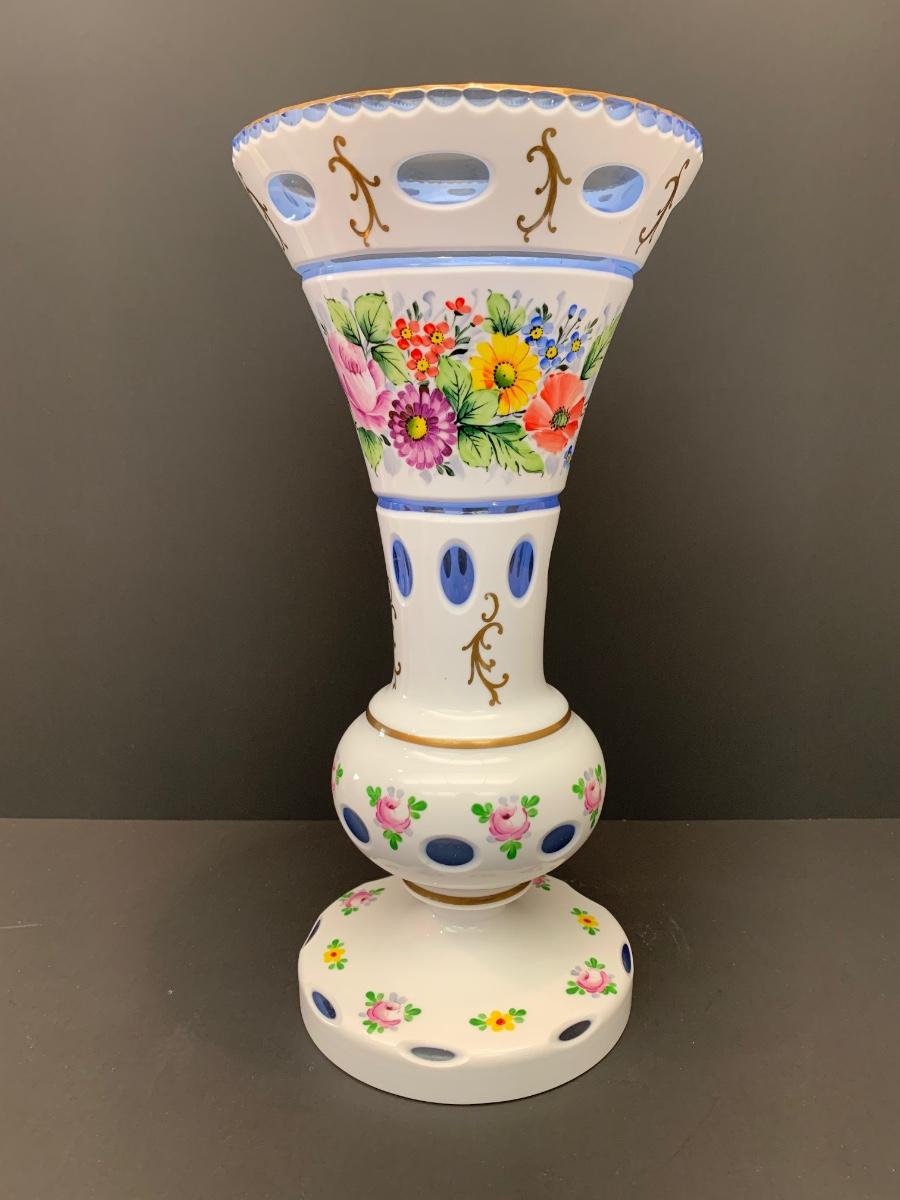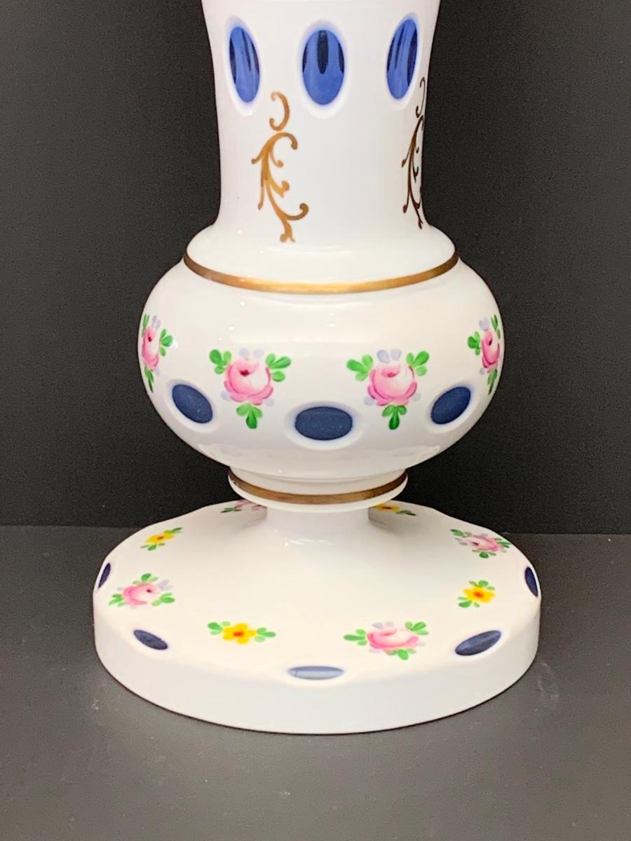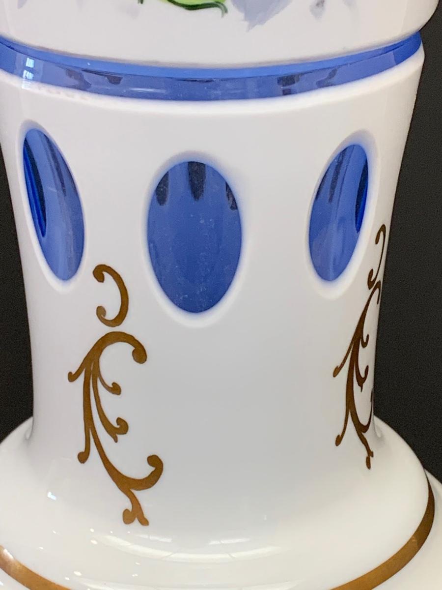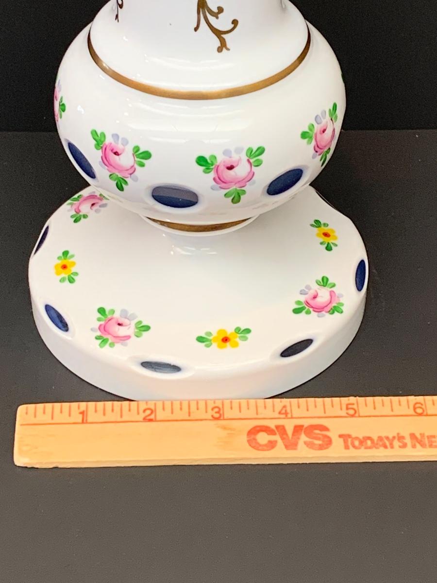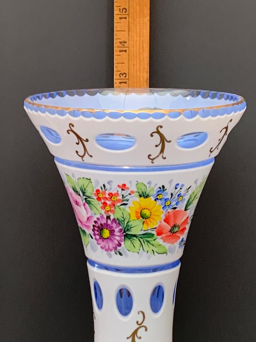 Eye Catching vintage white blue glass crystal vase, hand painted floral along with gold gilding.