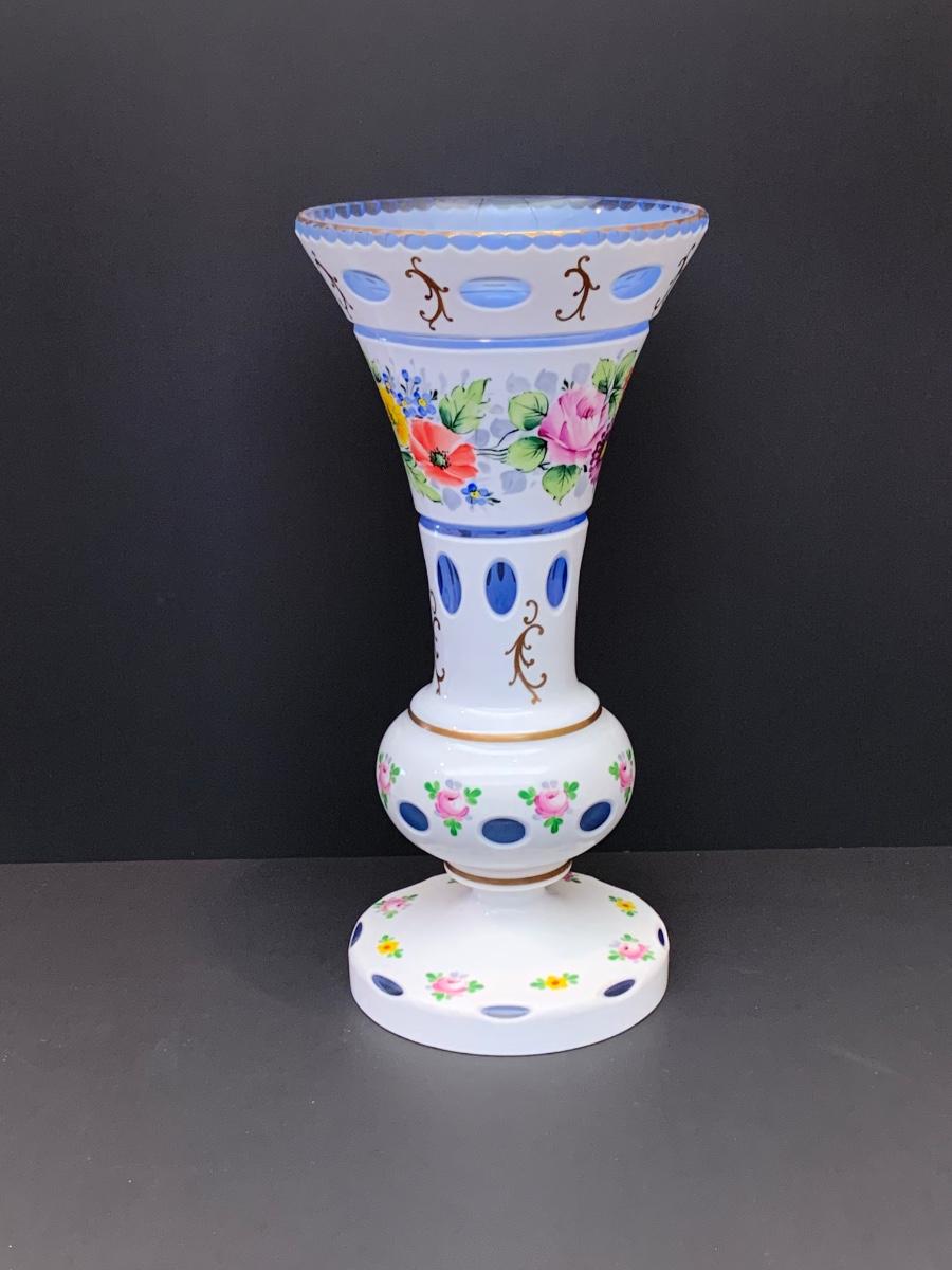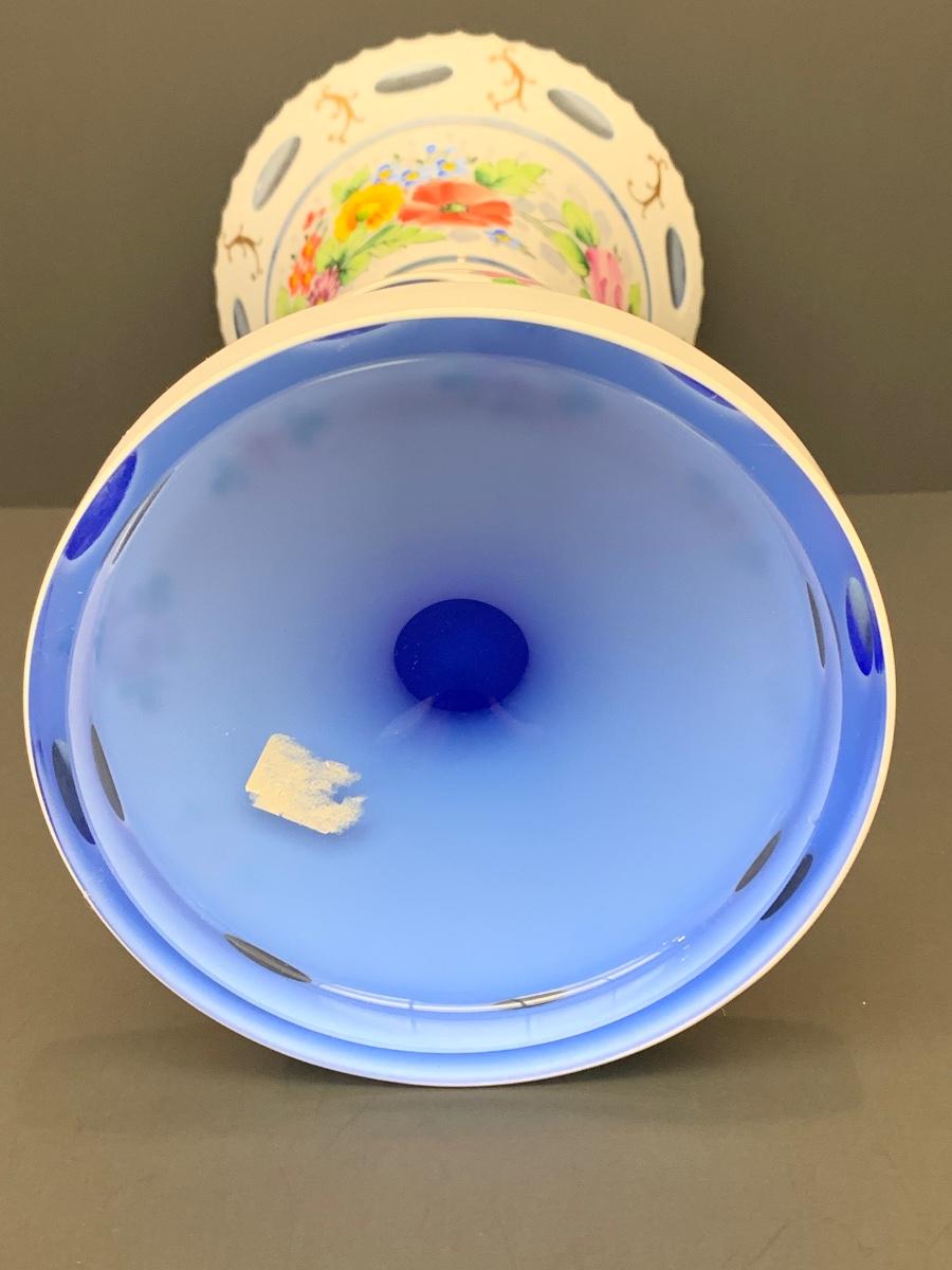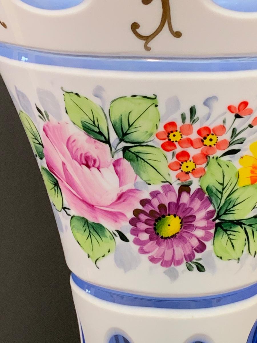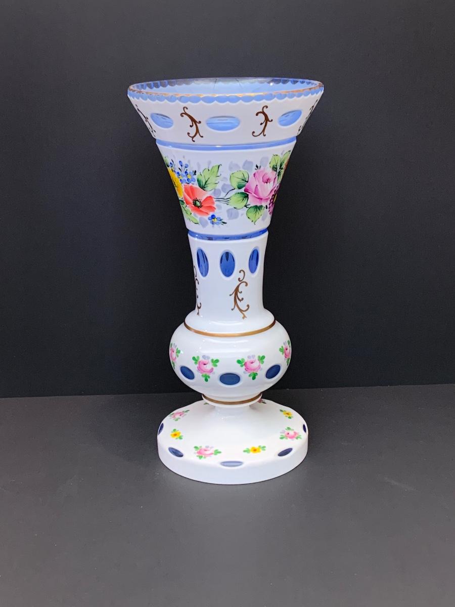 Eye Catching vintage white blue glass crystal vase, hand painted floral along with gold gilding.