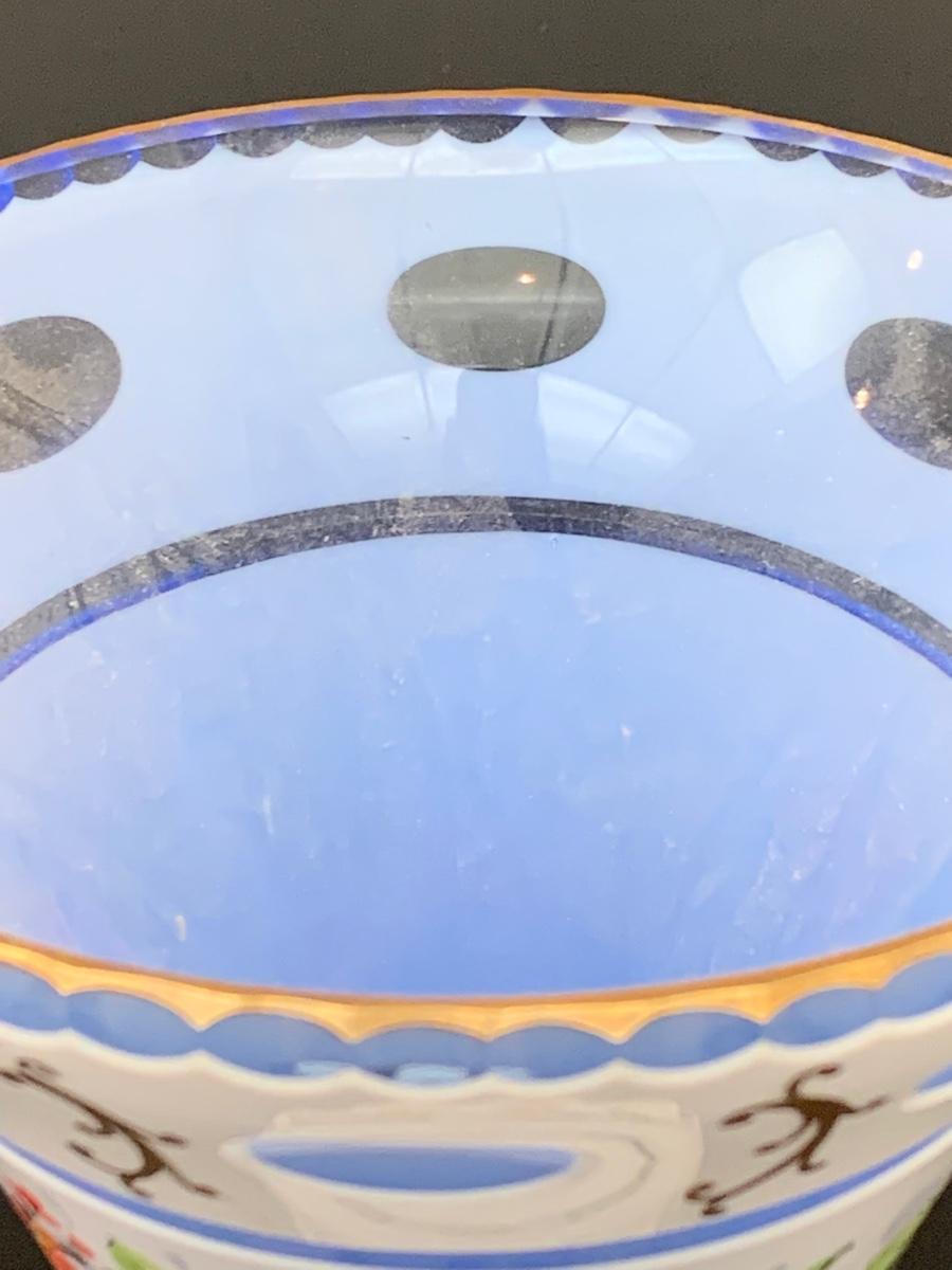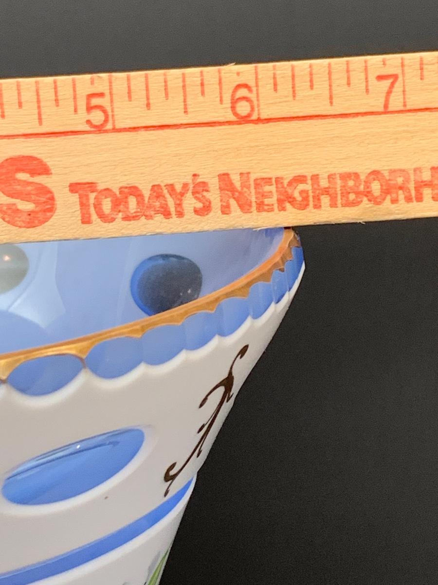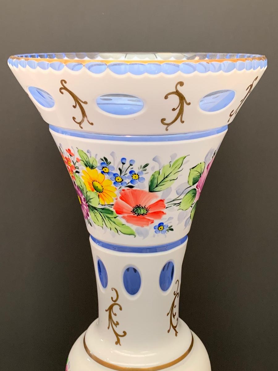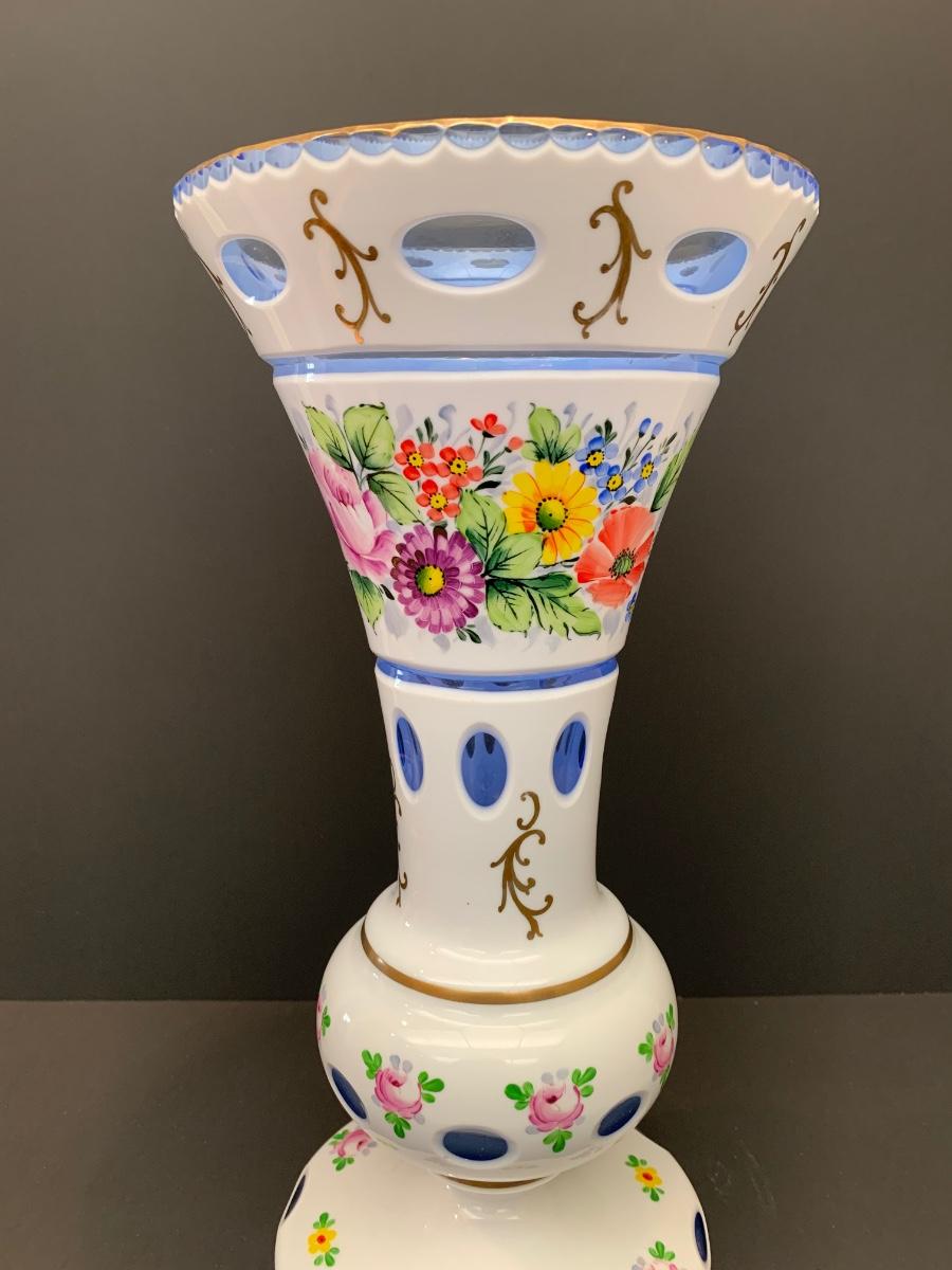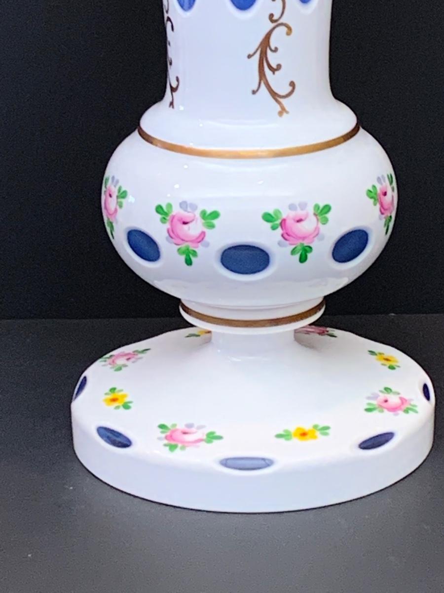 Eye Catching vintage white blue glass crystal vase, hand painted floral along with gold gilding.