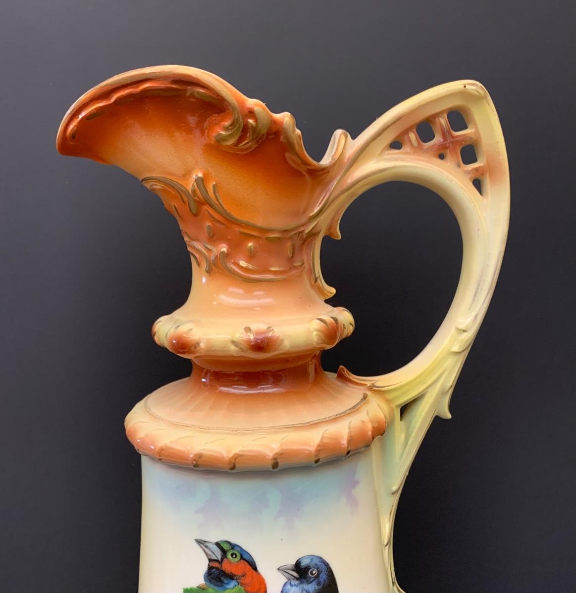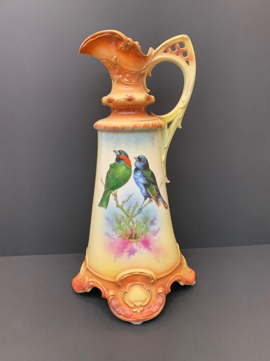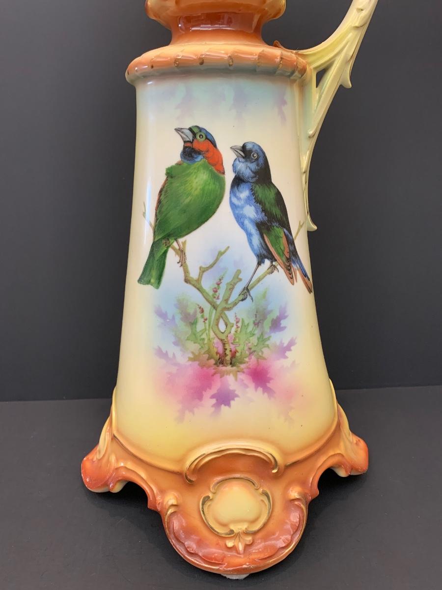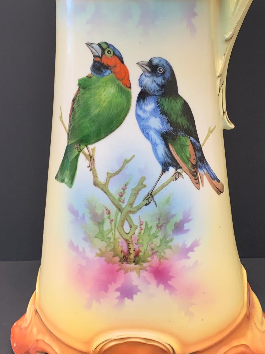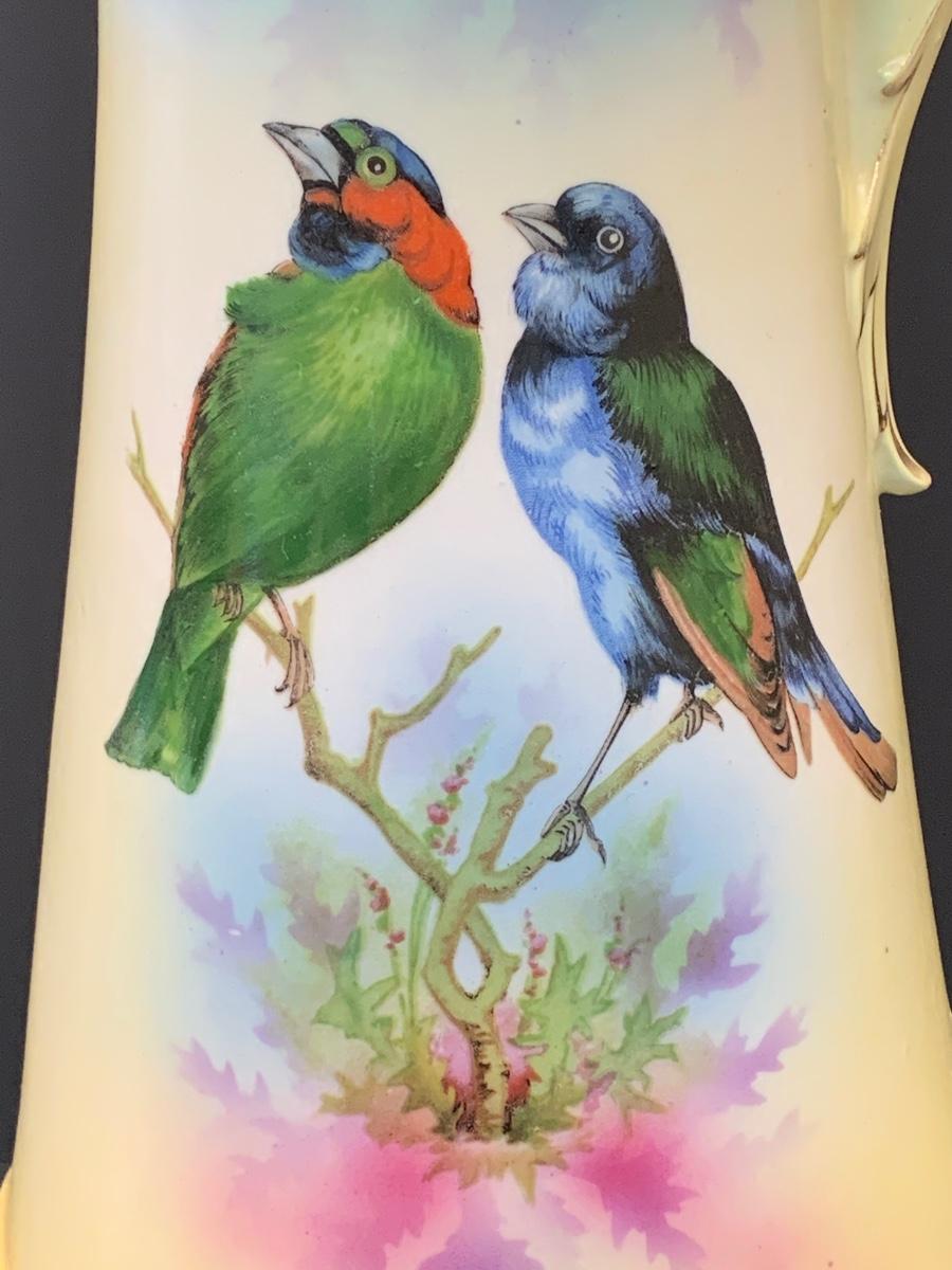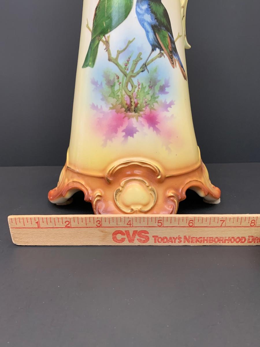 Beautiful footed pitcher vase with vivid colors/birds