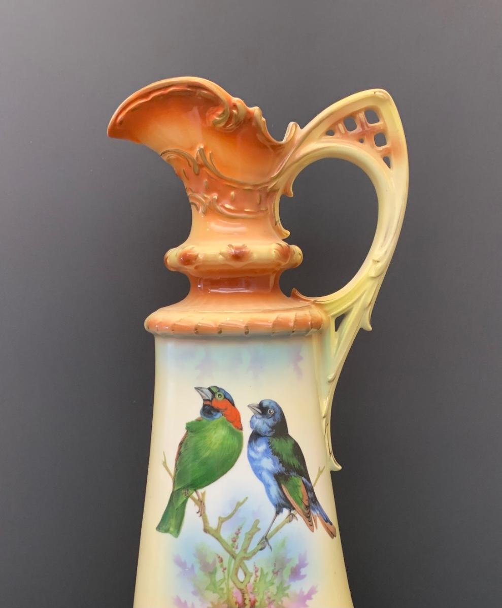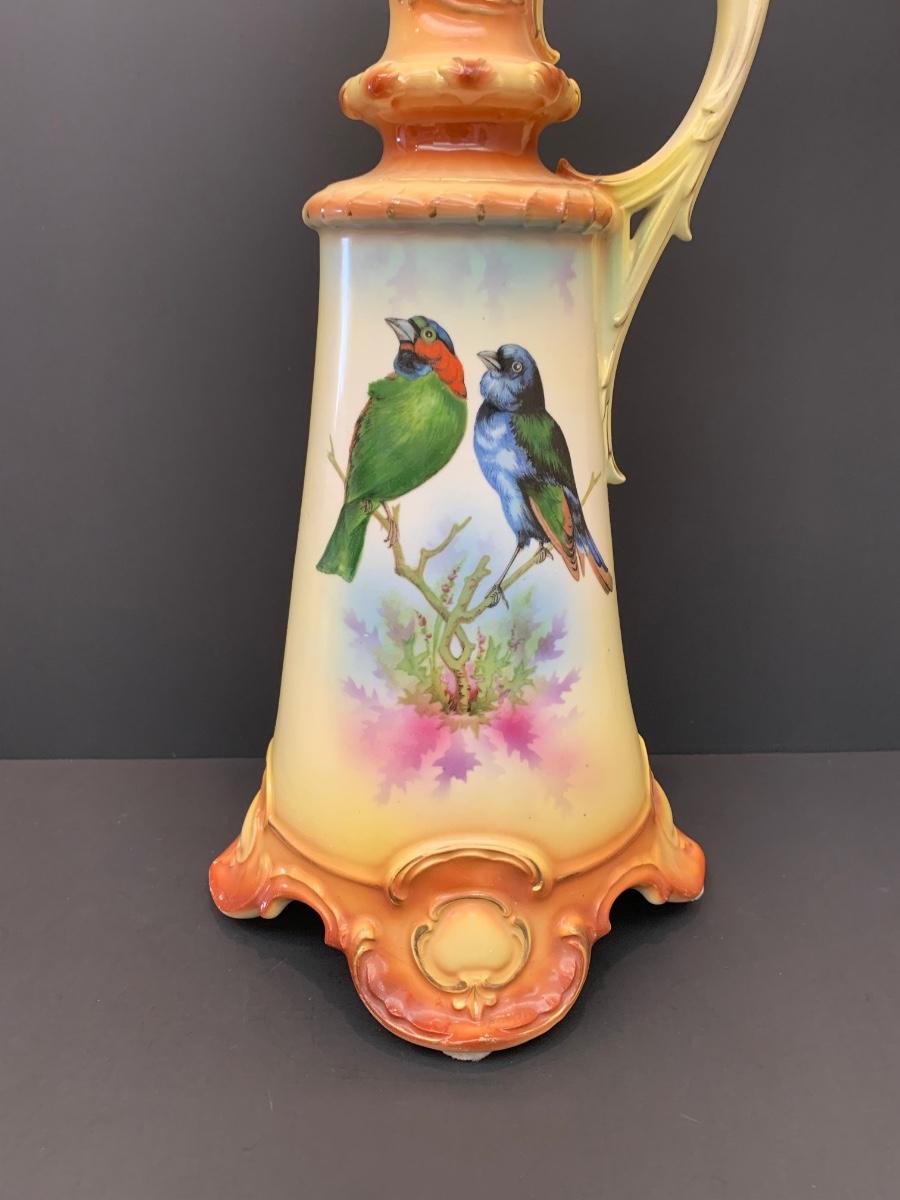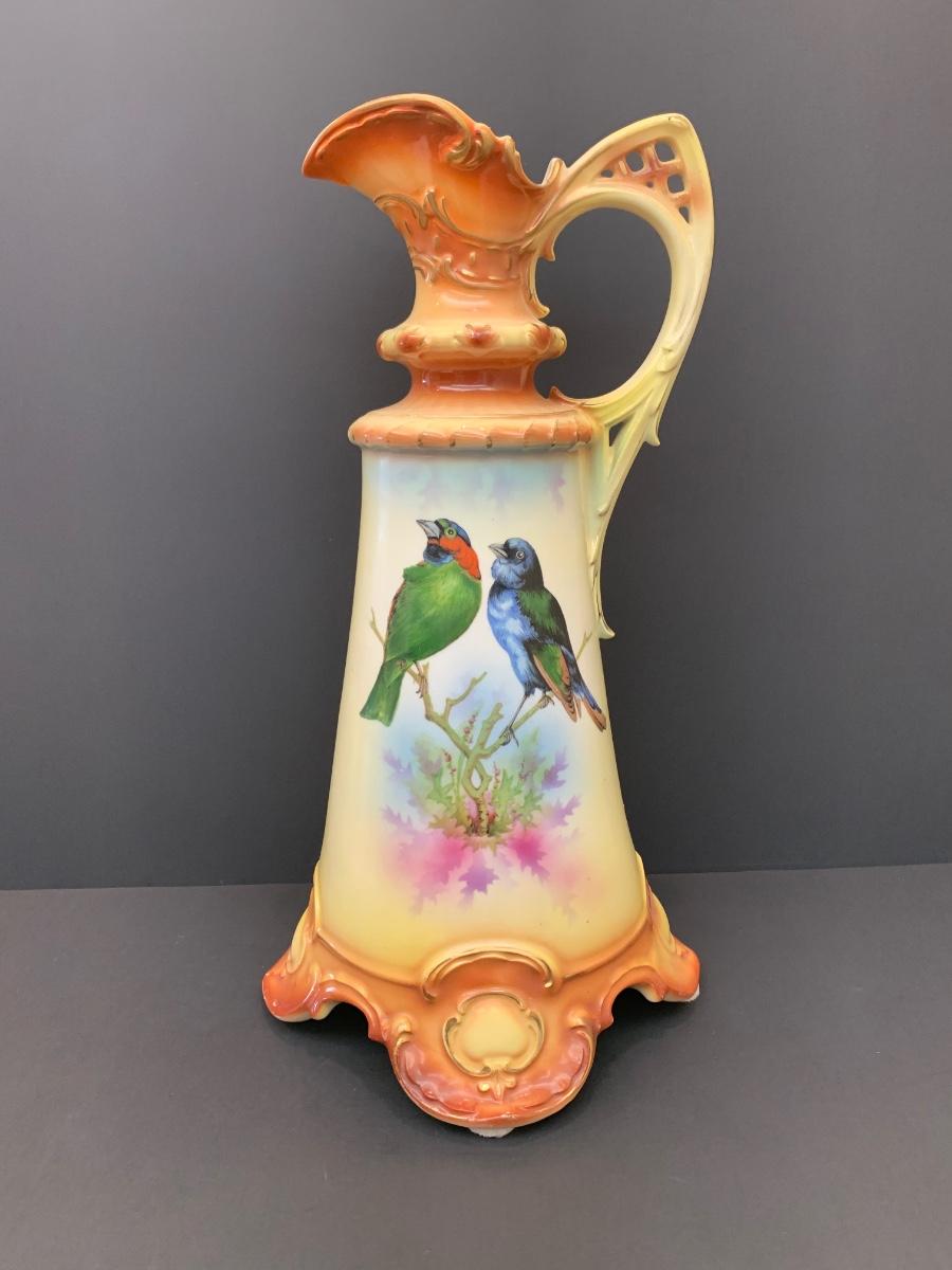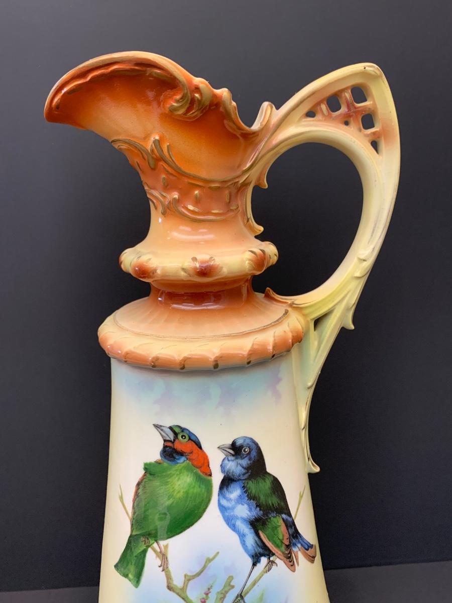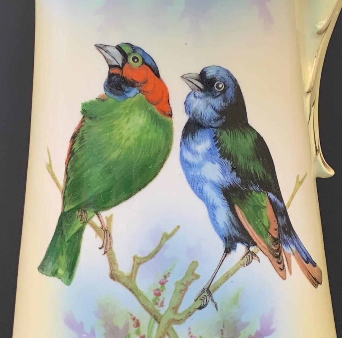 Beautiful footed pitcher vase with vivid colors/birds