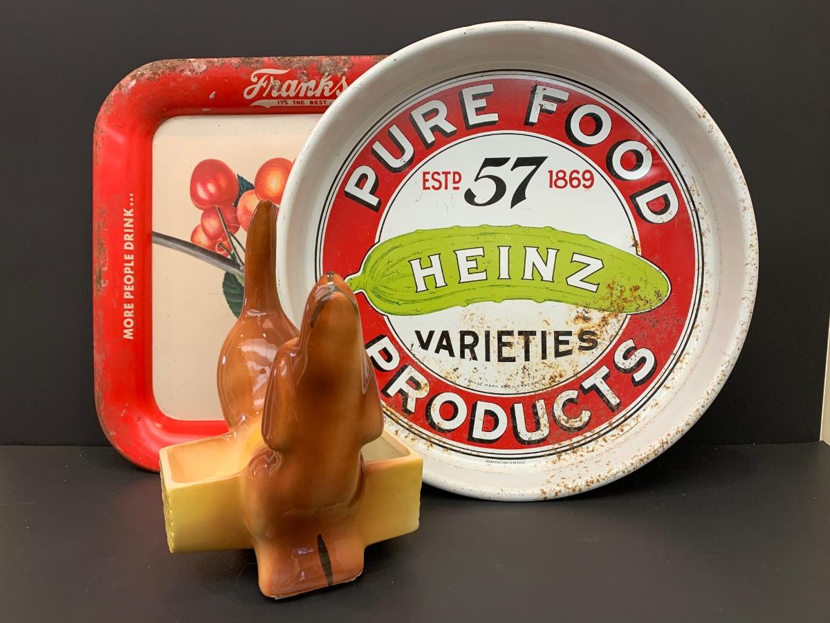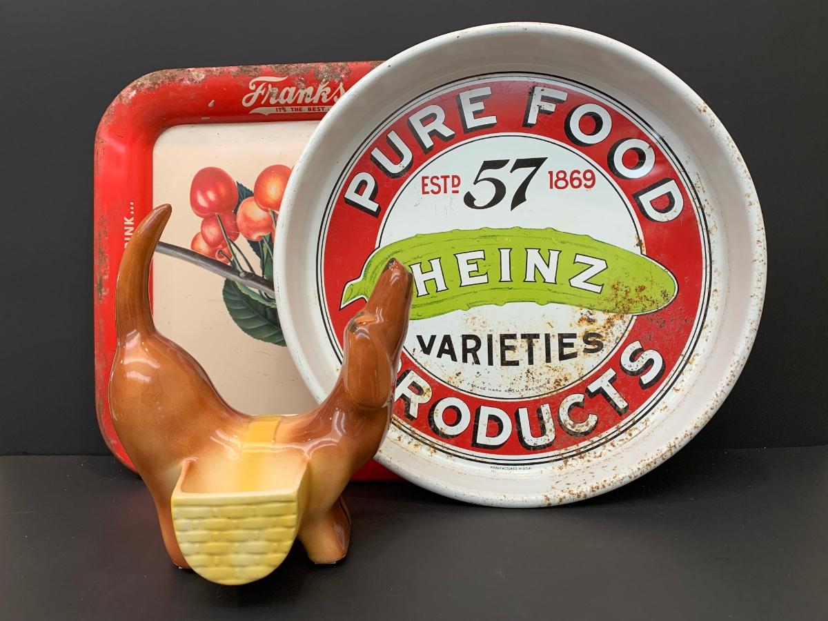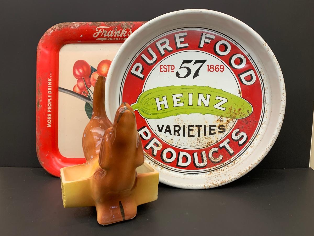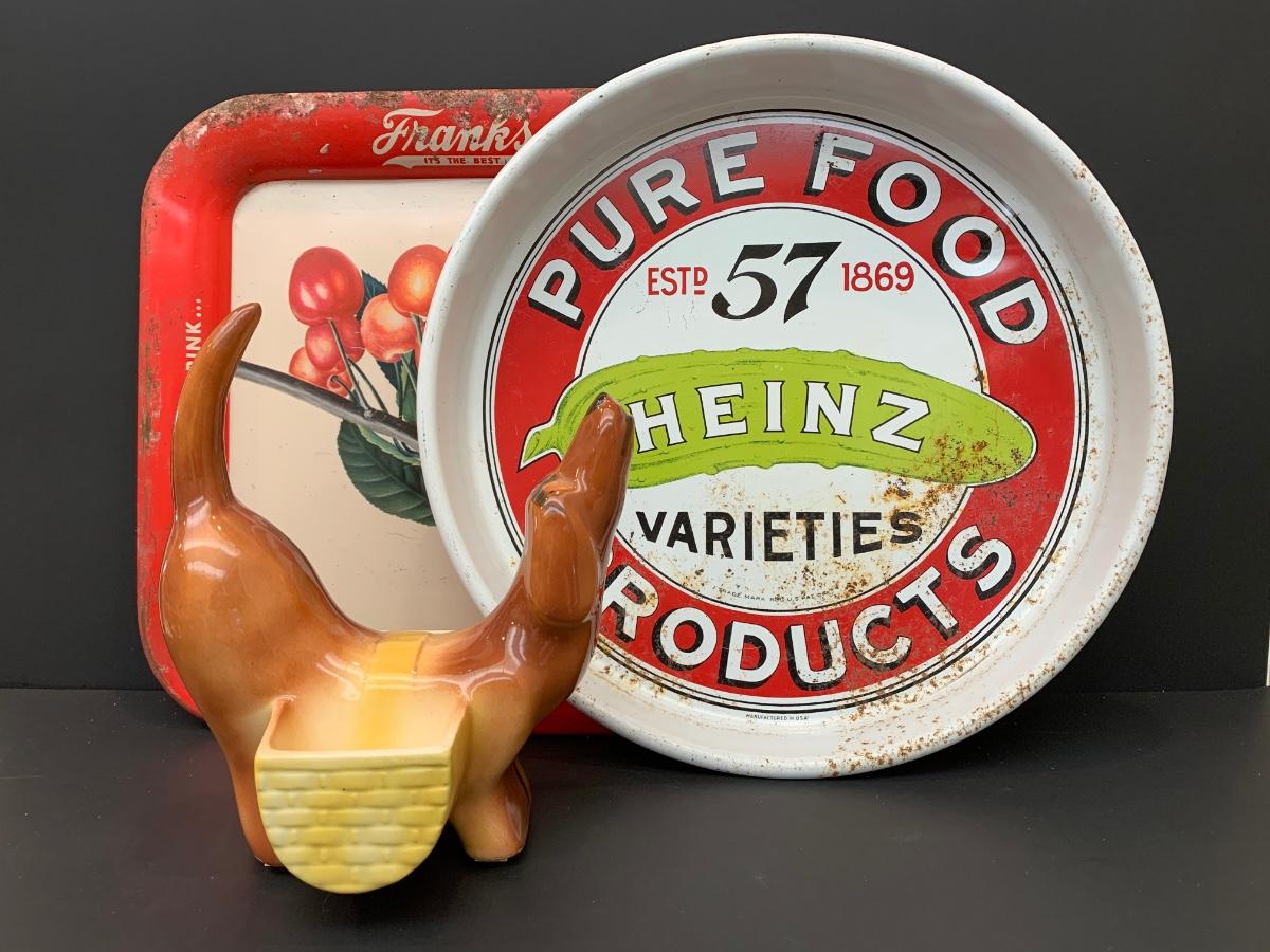 LOT 44: Vintage Advertising Trays and "Hotdog" Dog Condiment Holder