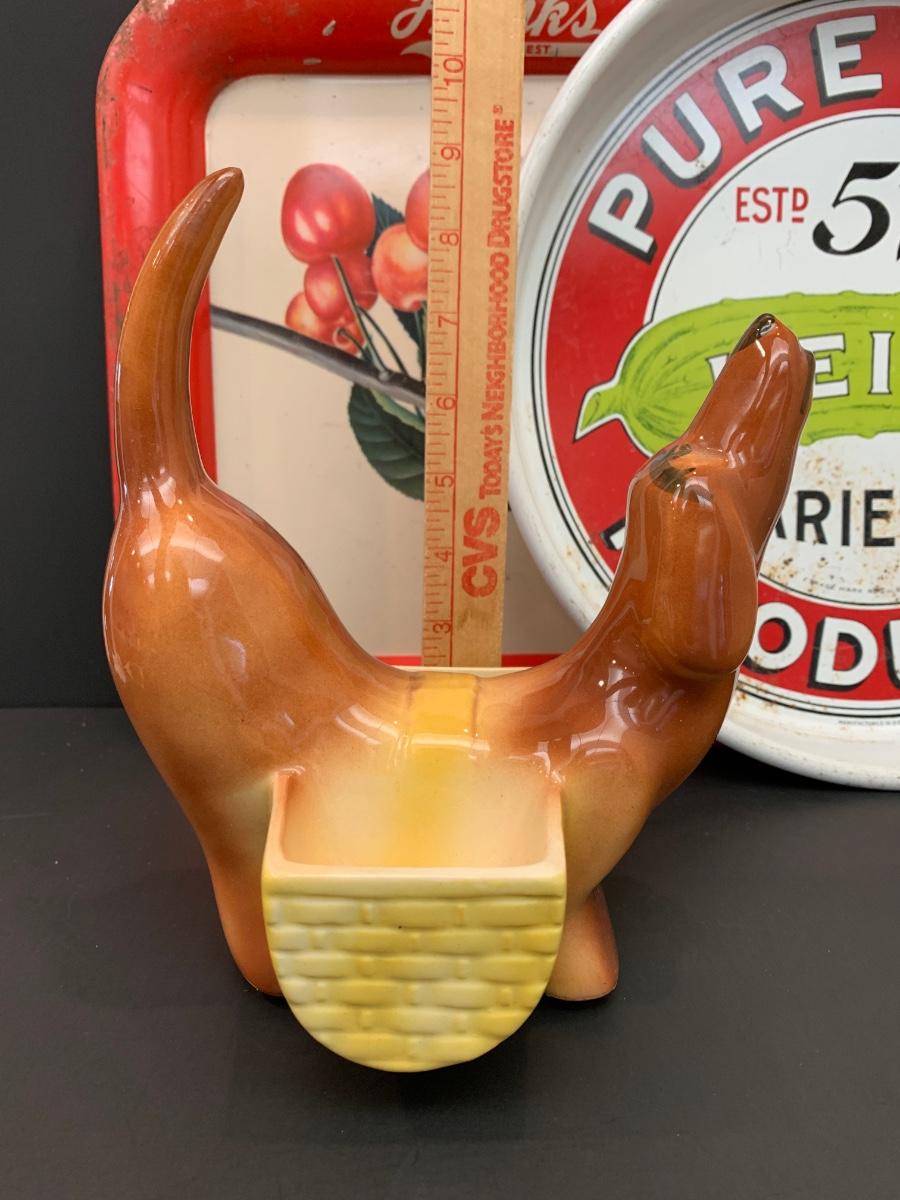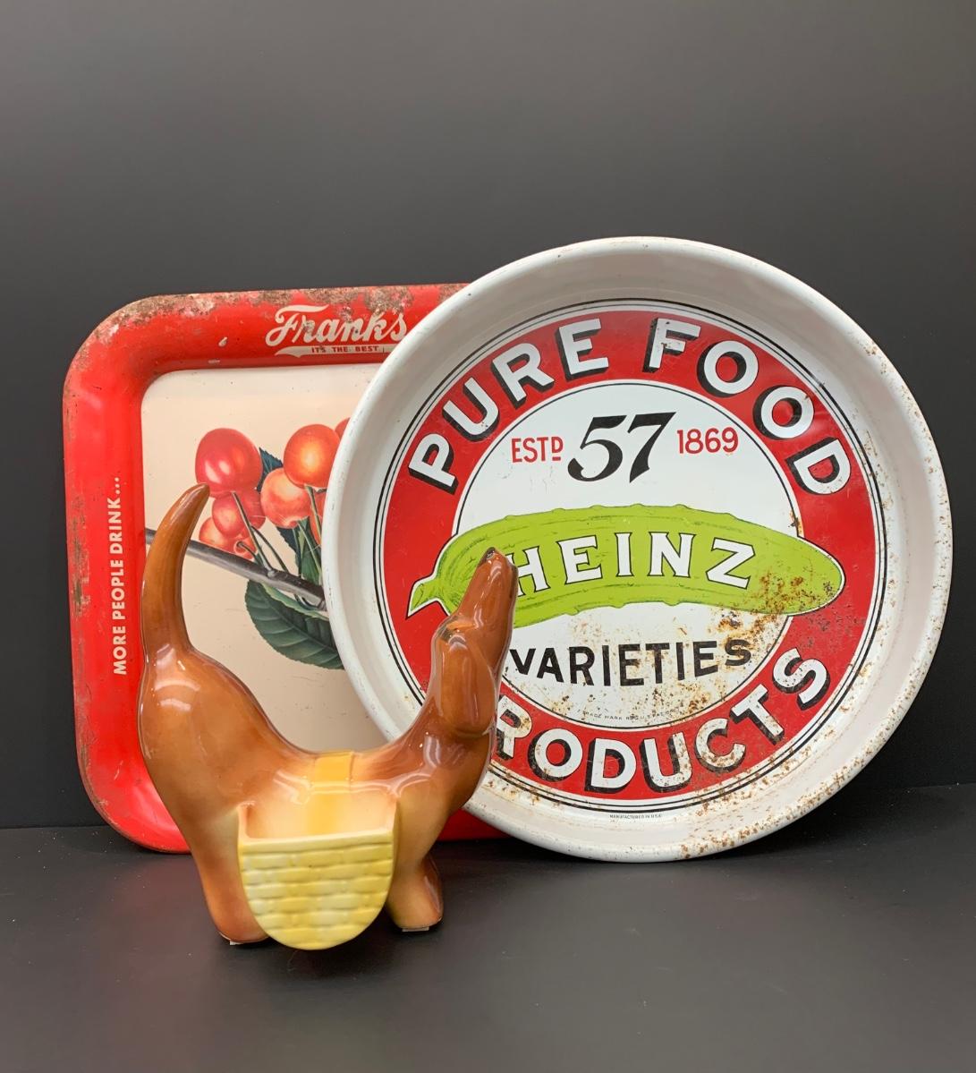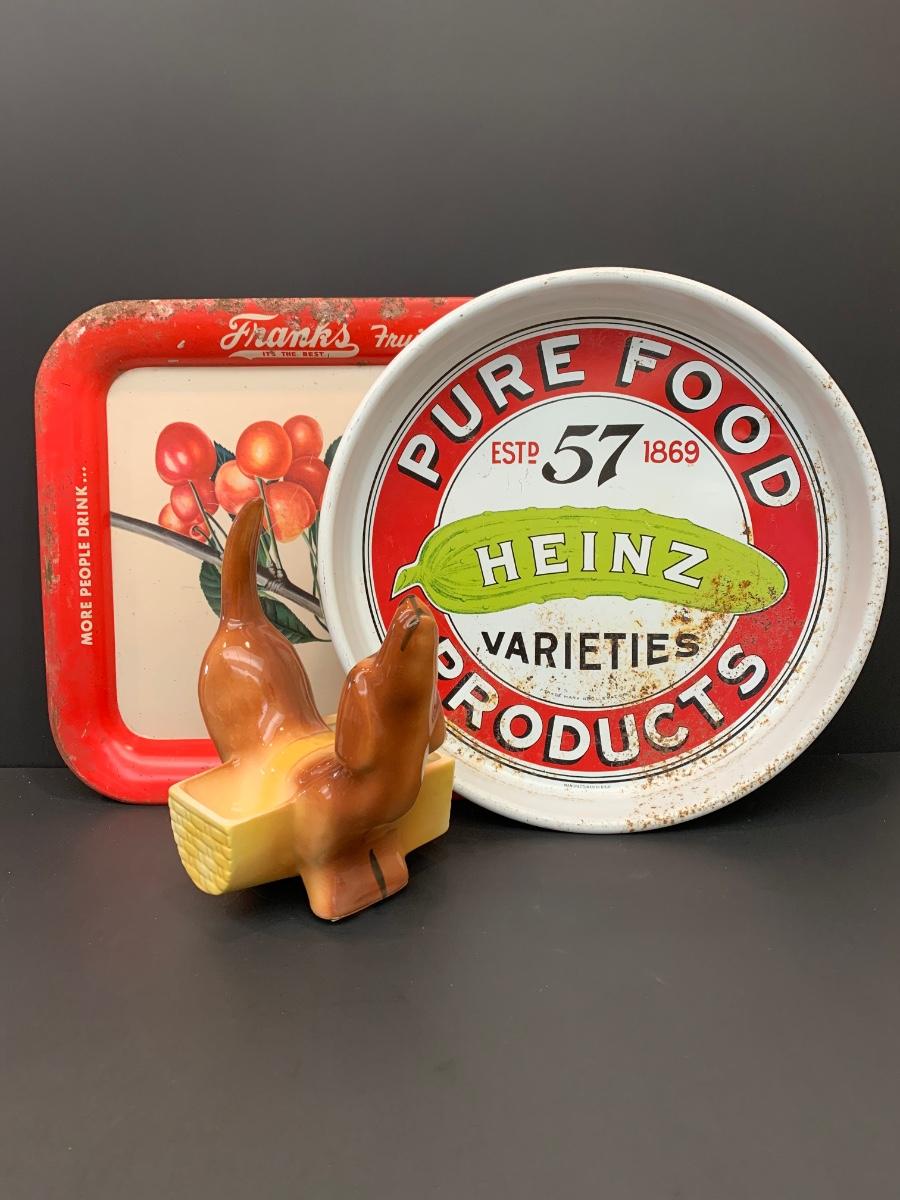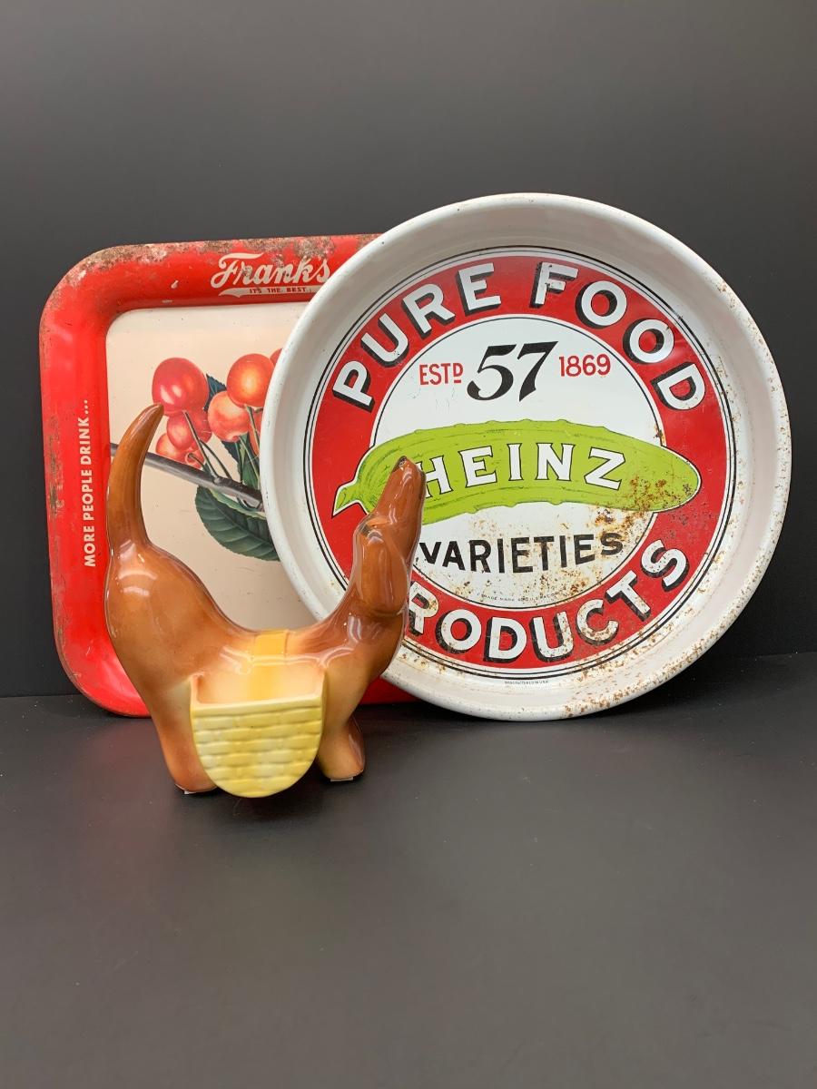 LOT 44: Vintage Advertising Trays and "Hotdog" Dog Condiment Holder