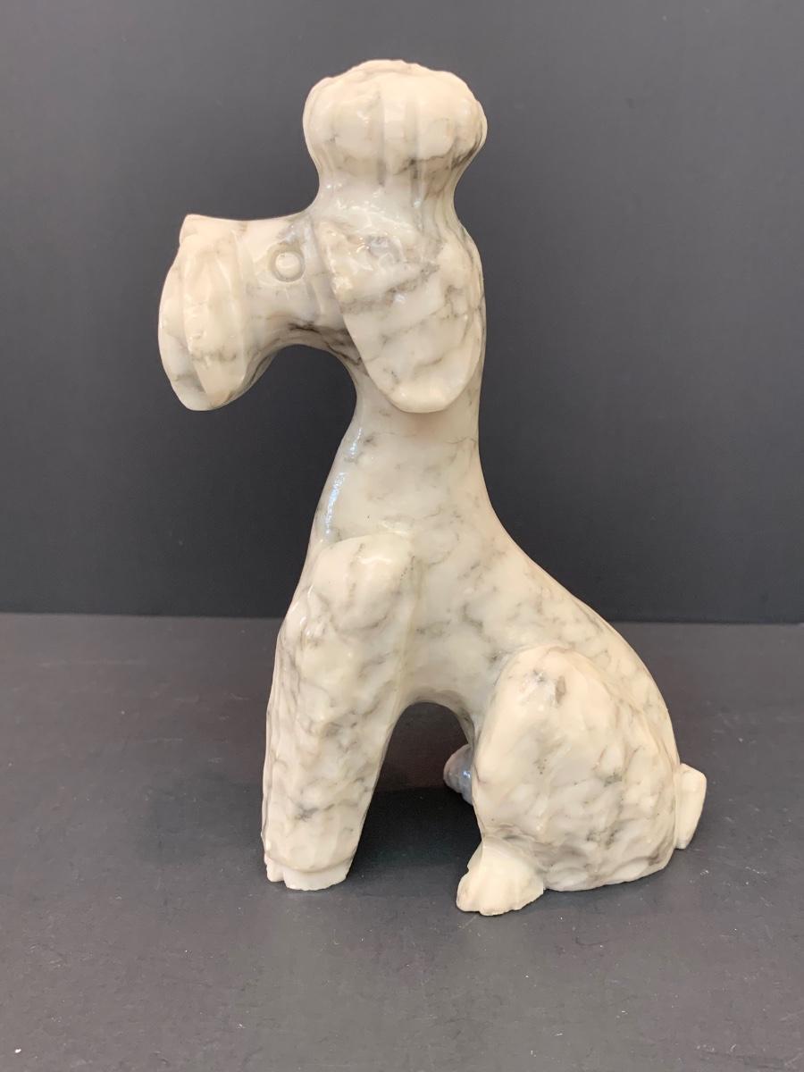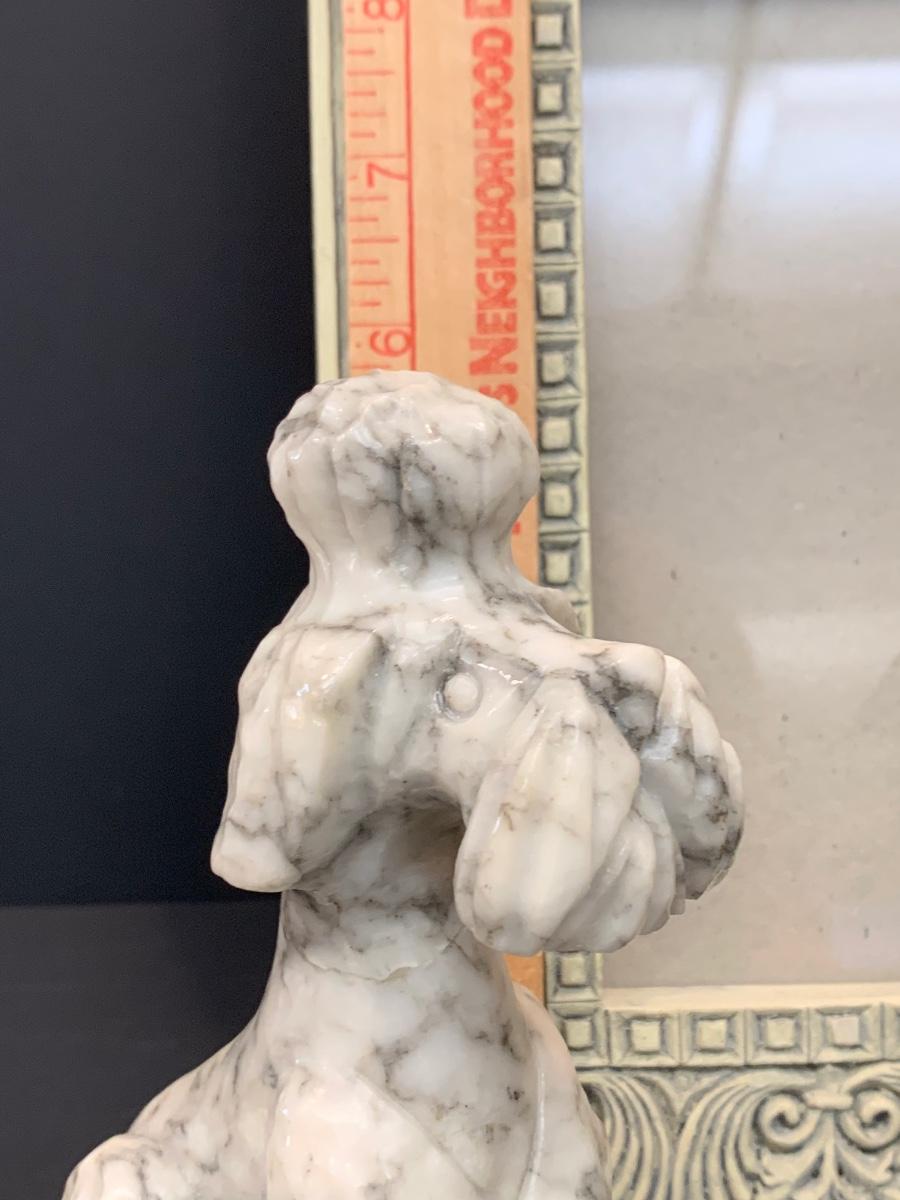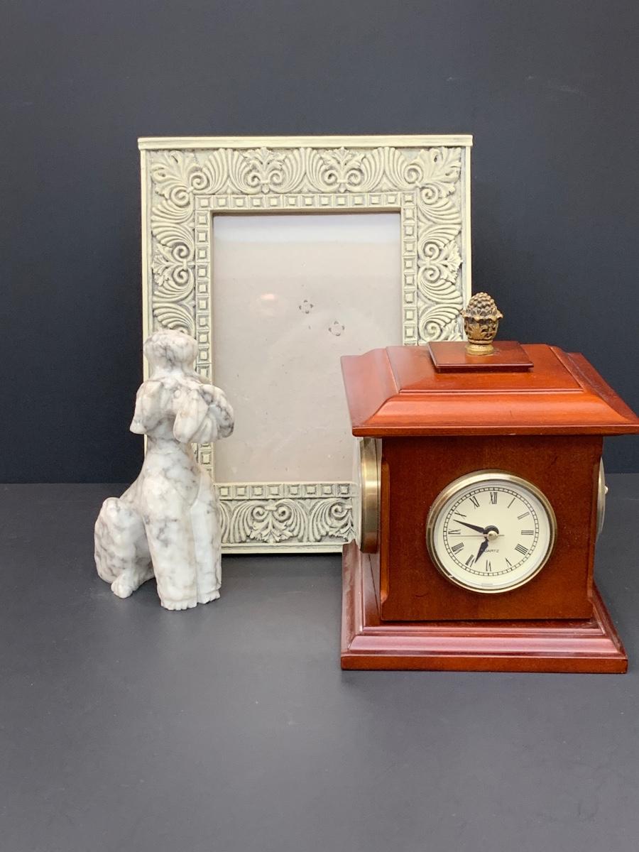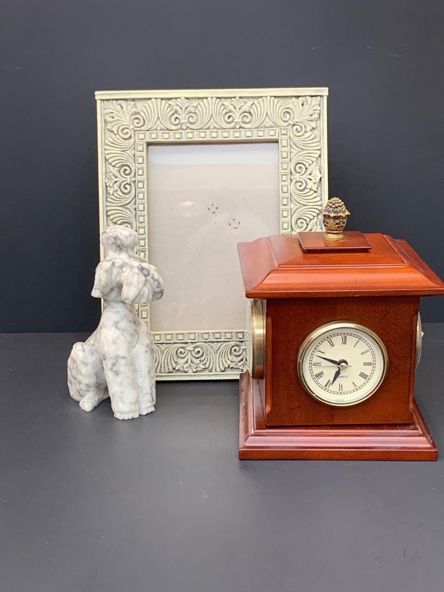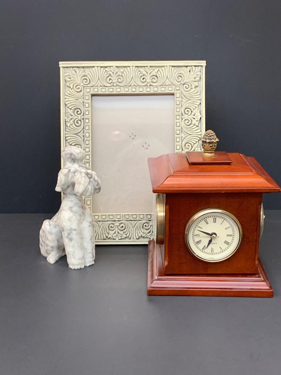 LOT 45: Alabaster Poodle Dog, Stone Frame, and Bombay Co. Clock.