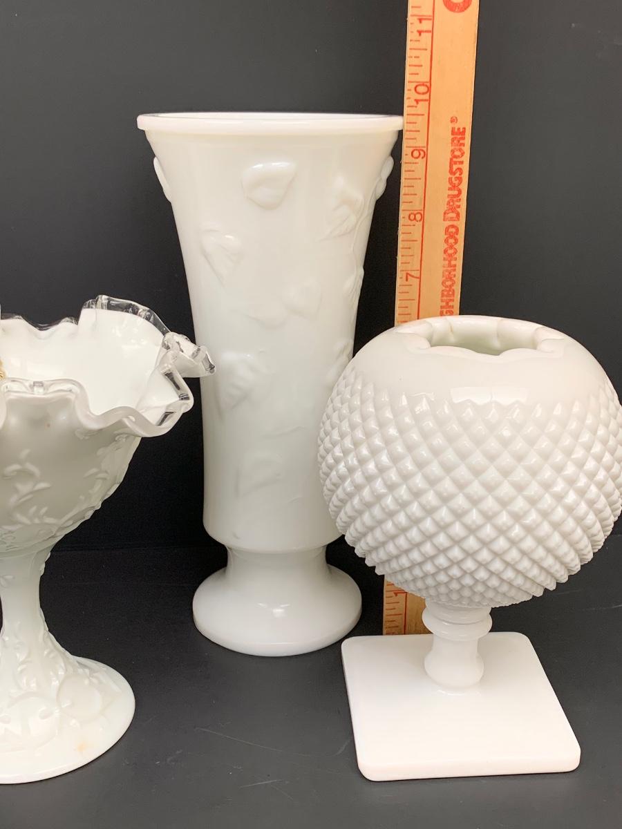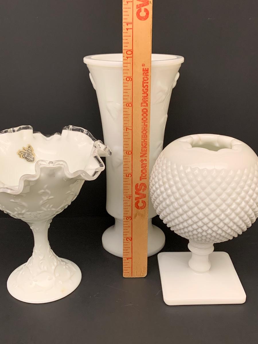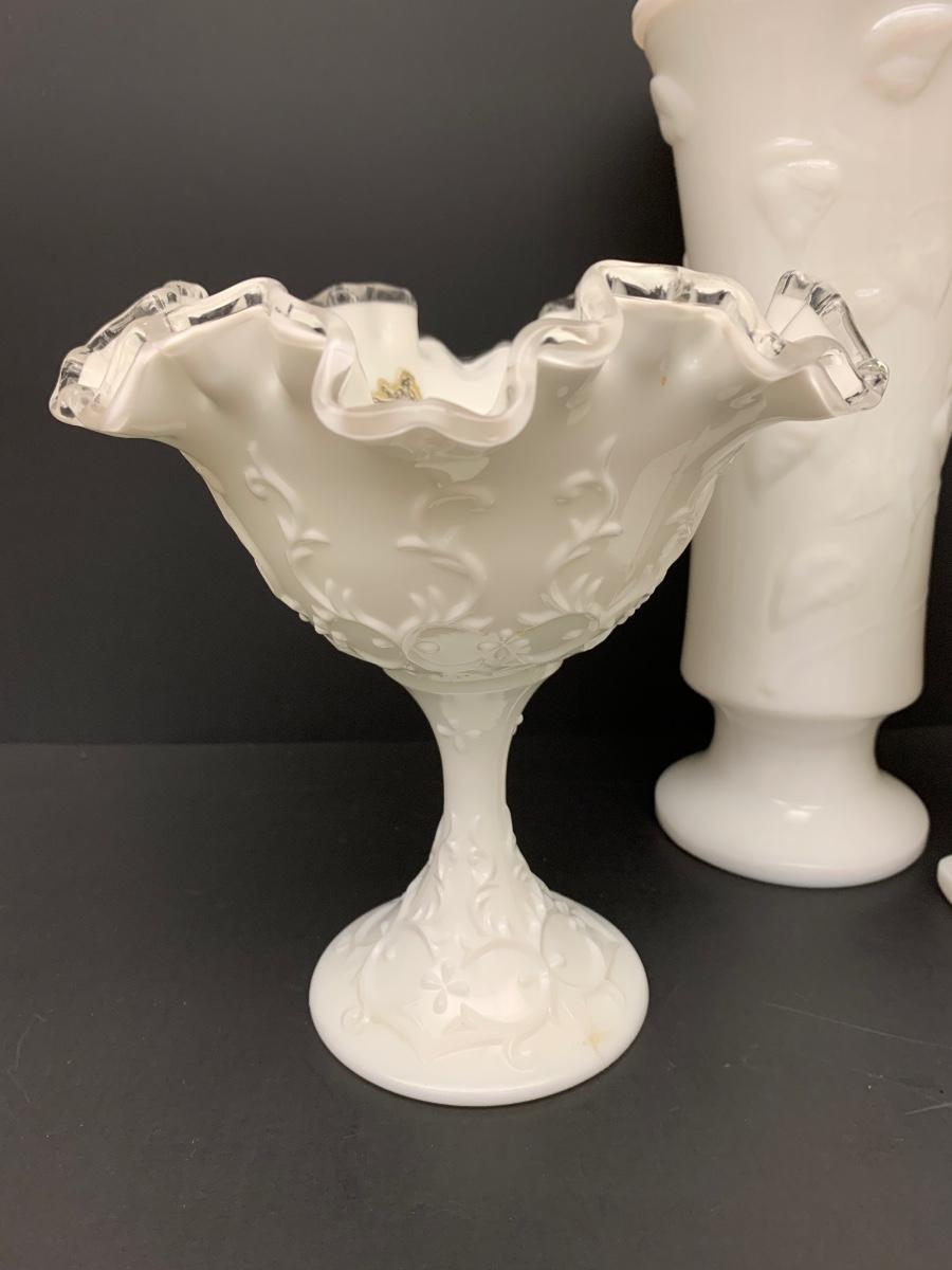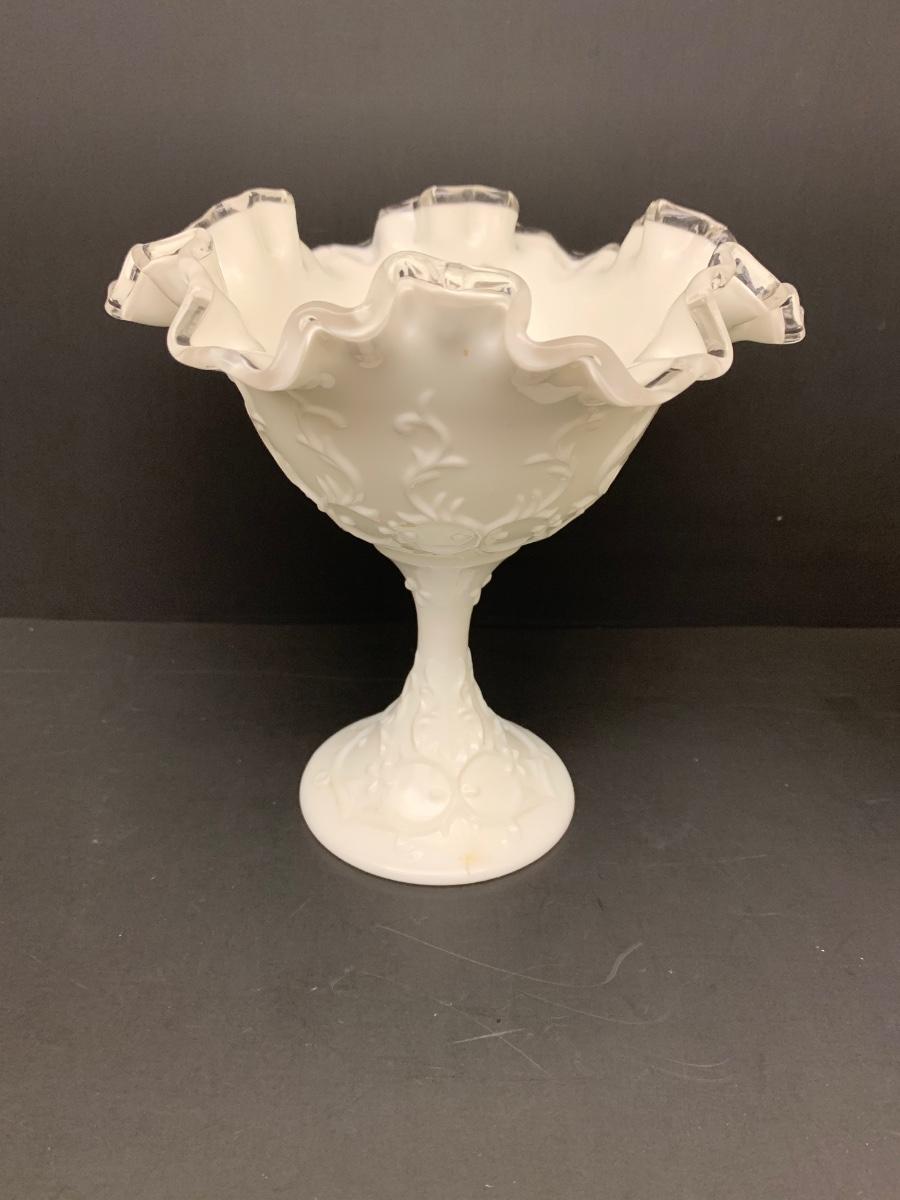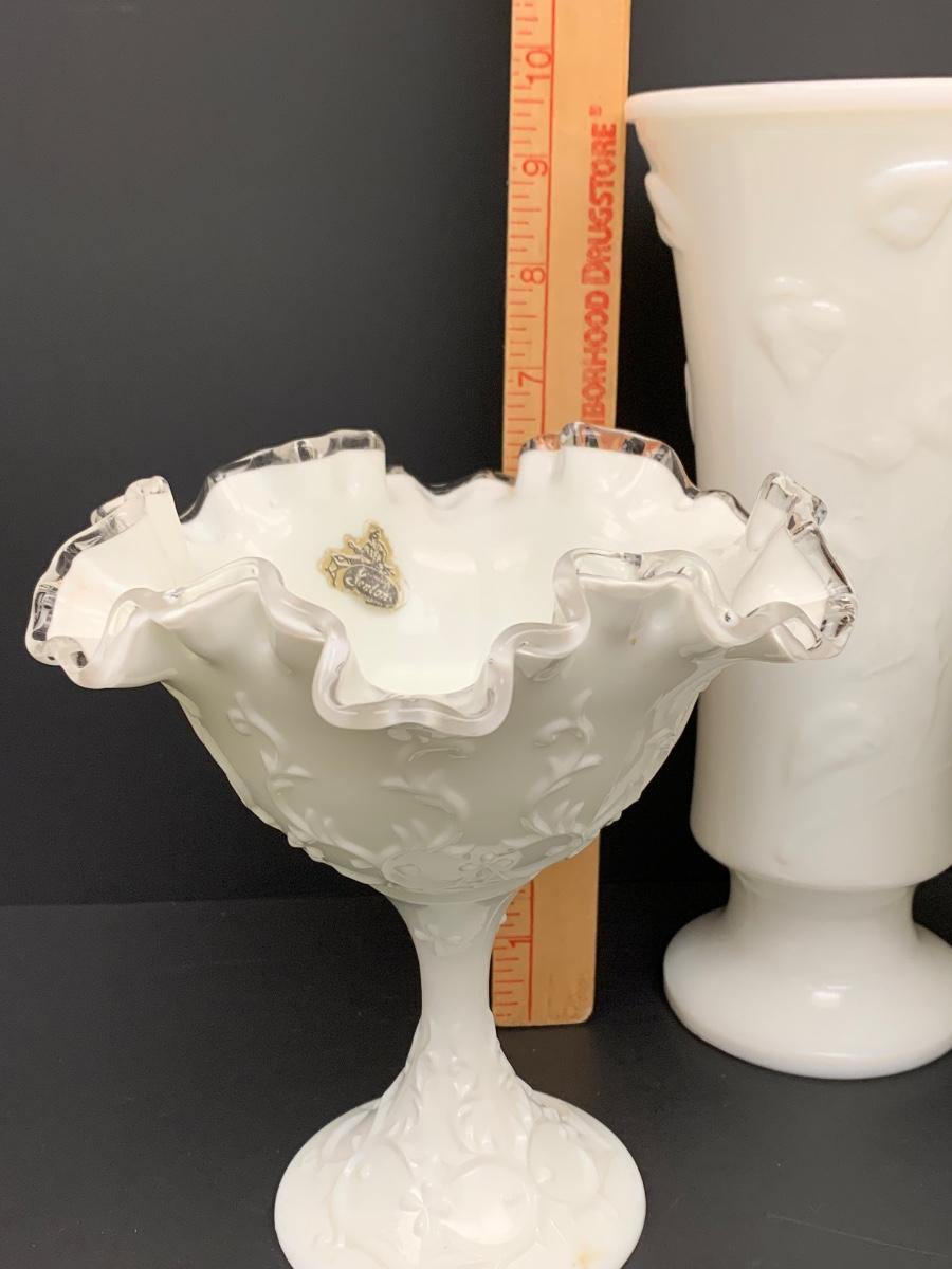 LOT 49: Ruffled Edge Labeled Fenton Candy/Vase and Milk Glass