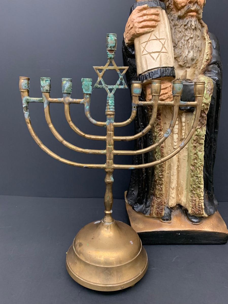 Menorah shows patina from age. Chalkware shows some minor scrapes and dings. Please see all pictures as they are the best representation of the items. The pictures show condition, measurements if taken, and what is included in the lot. Due to the large amount that we photograph and the time frame, we are not always able to take measurements. All items unless noted, are pre-owned and have been used. If you purchased furniture, you must bring help. We do not allow one person to carry large furniture out on their own. Bring help, tools and a truck for the safety of our client’s homes, and your personal safety. Any damages that result to the property including walls, and floors due to moving of the furniture will be charged to the buyer. Company policy. Thank you.
