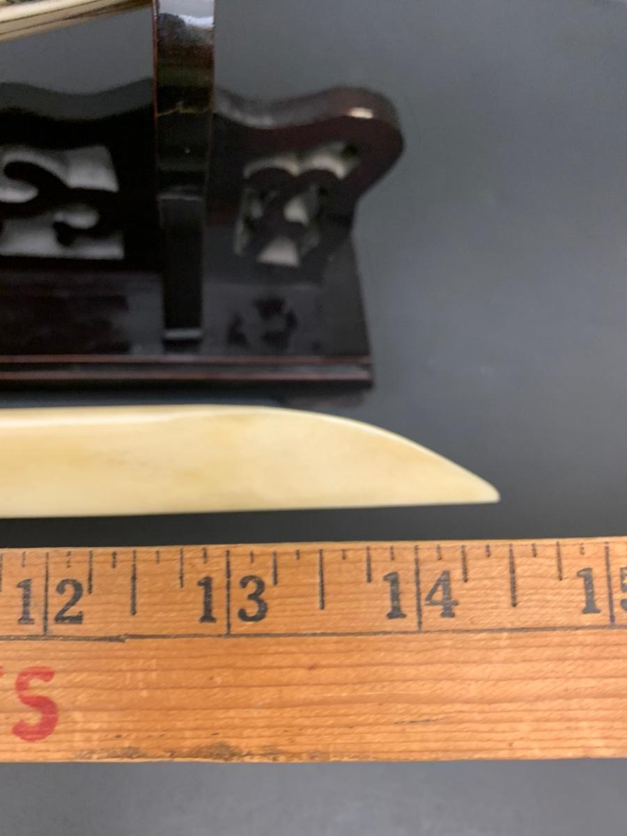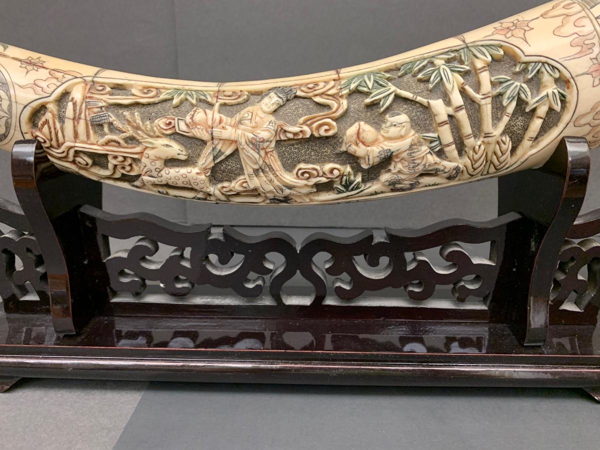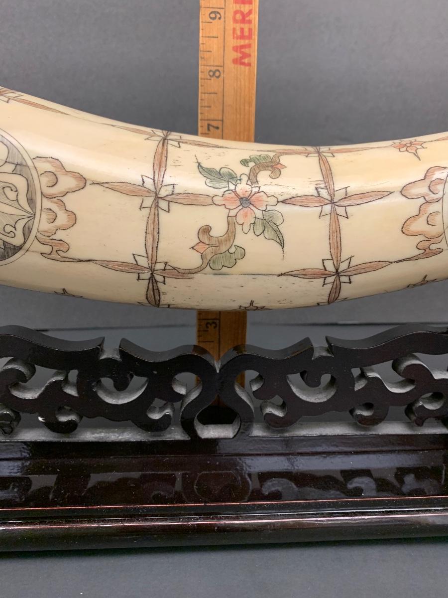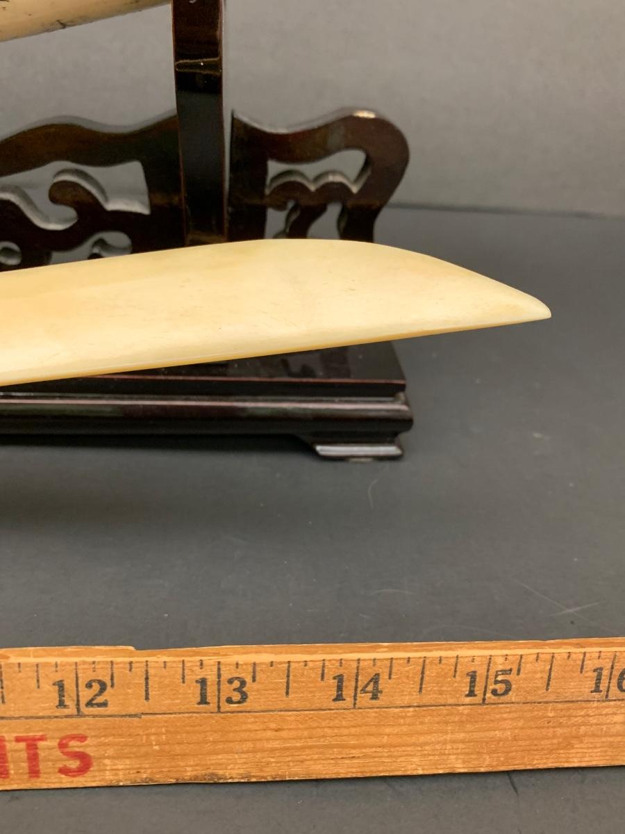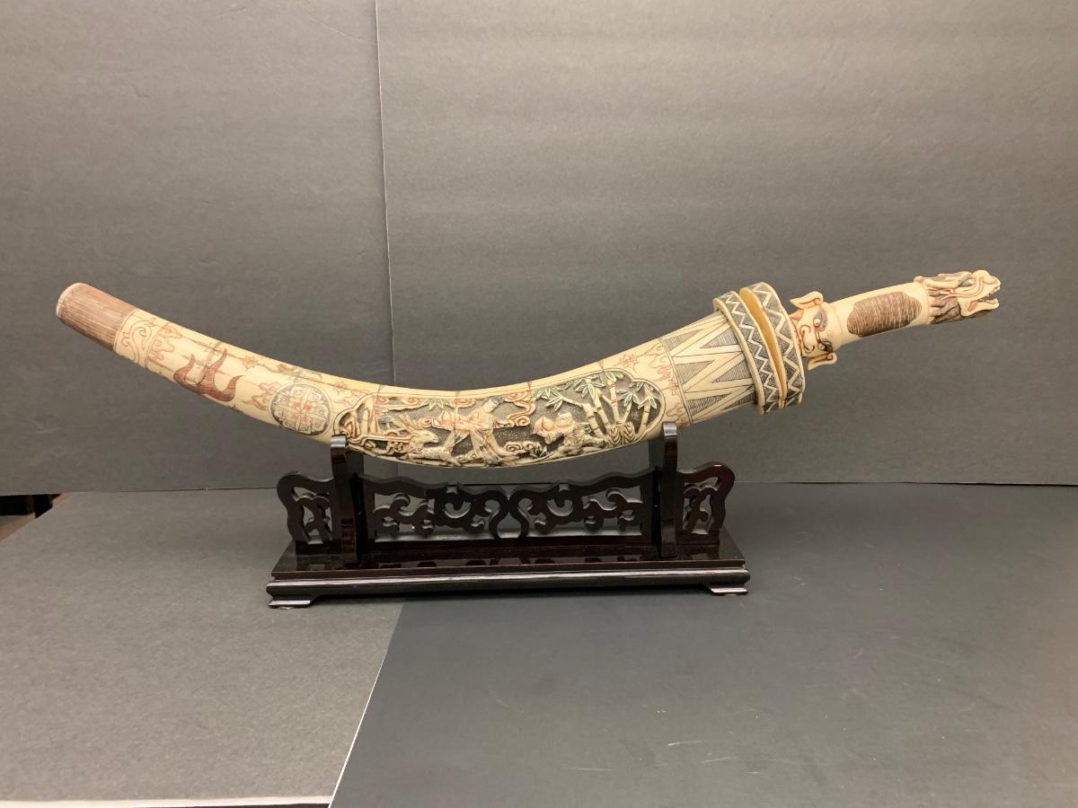 This is not ivory, it looks to be a heavy resin or bone of some sort. You can see where the maker pieced the horn part together, and that it is not one piece like a natural animal horn would be. Please see all pictures as they are the best representation of the items. The pictures show condition, measurements if taken, and what is included in the lot. Due to the large amount that we photograph and the time frame, we are not always able to take measurements. All items unless noted, are pre-owned and have been used. If you purchased furniture, you must bring help. We do not allow one person to carry large furniture out on their own. Bring help, tools and a truck for the safety of our client’s homes, and your personal safety. Any damages that result to the property including walls, and floors due to moving of the furniture will be charged to the buyer. Company policy. Thank you.