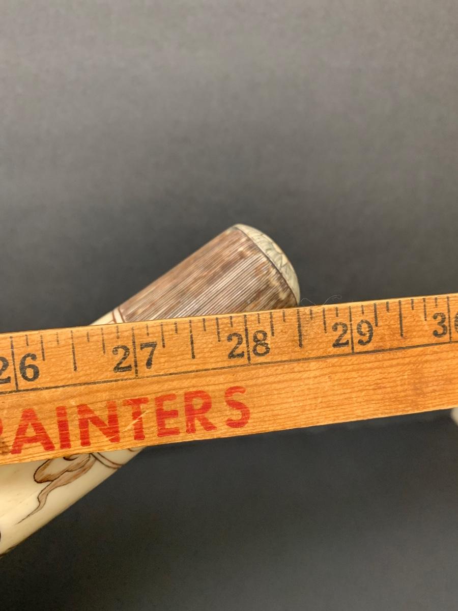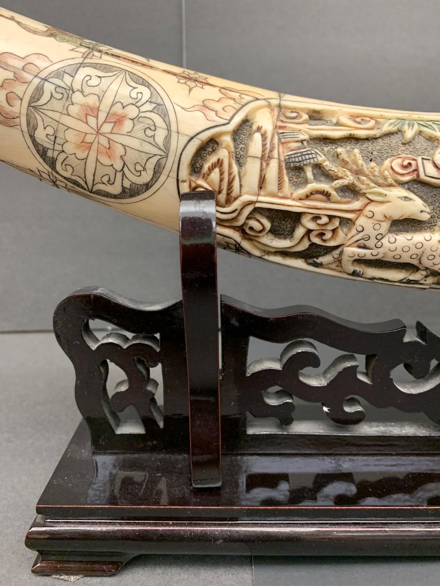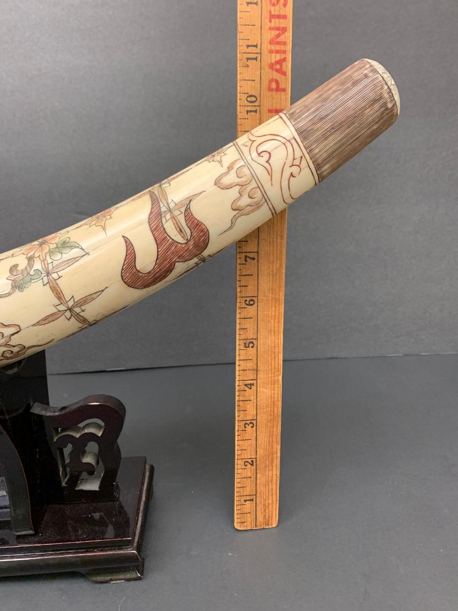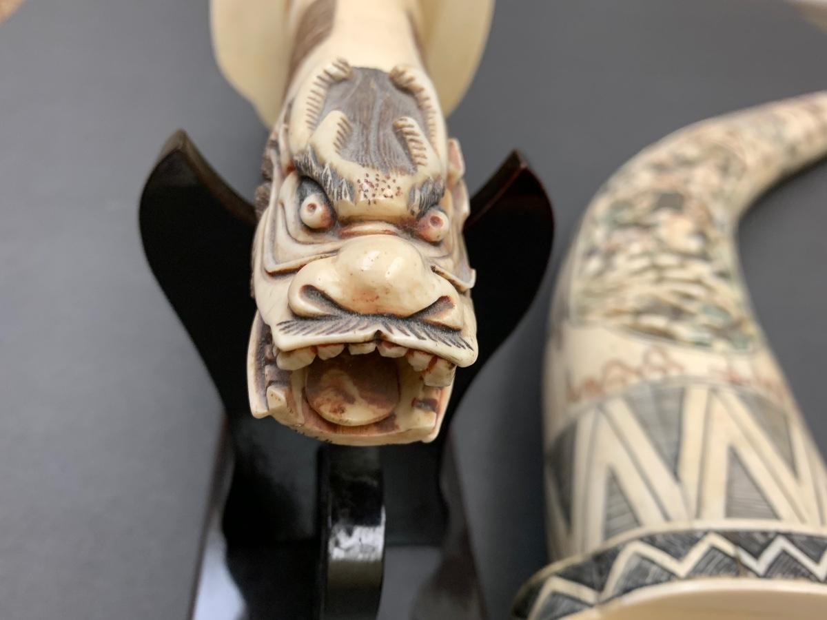 This is not ivory, it looks to be a heavy resin or bone of some sort. You can see where the maker pieced the horn part together, and that it is not one piece like a natural animal horn would be. Please see all pictures as they are the best representation of the items. The pictures show condition, measurements if taken, and what is included in the lot. Due to the large amount that we photograph and the time frame, we are not always able to take measurements. All items unless noted, are pre-owned and have been used. If you purchased furniture, you must bring help. We do not allow one person to carry large furniture out on their own. Bring help, tools and a truck for the safety of our client’s homes, and your personal safety. Any damages that result to the property including walls, and floors due to moving of the furniture will be charged to the buyer. Company policy. Thank you.