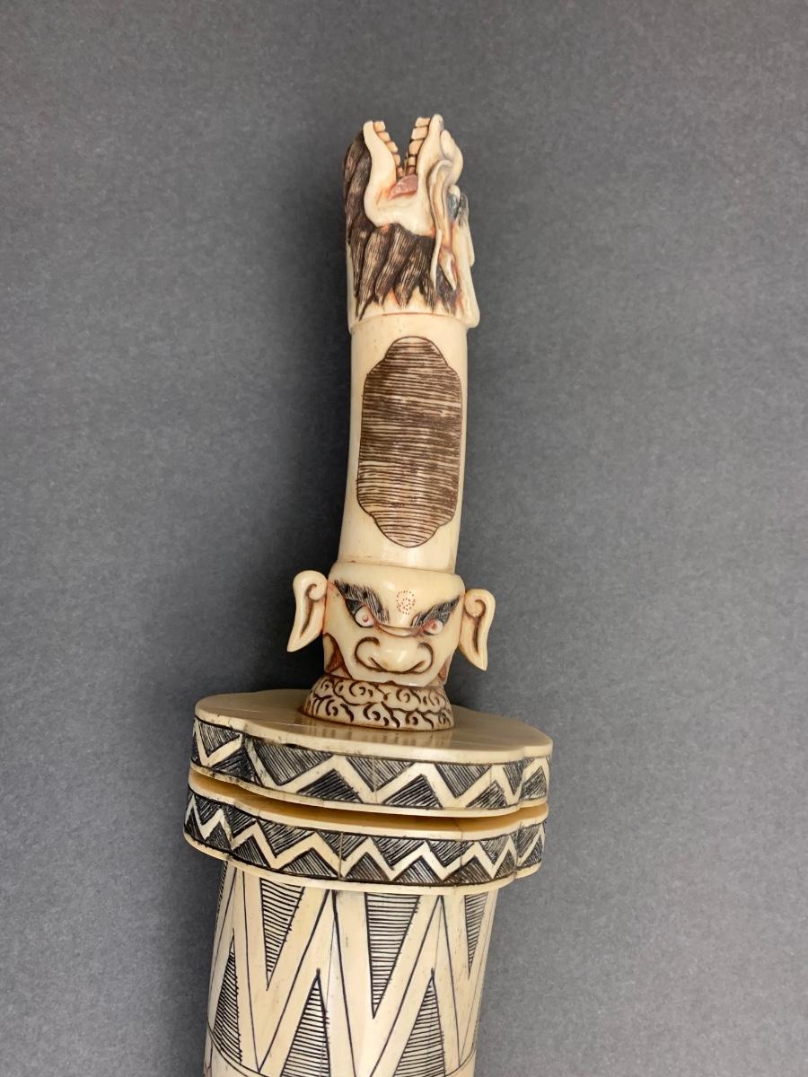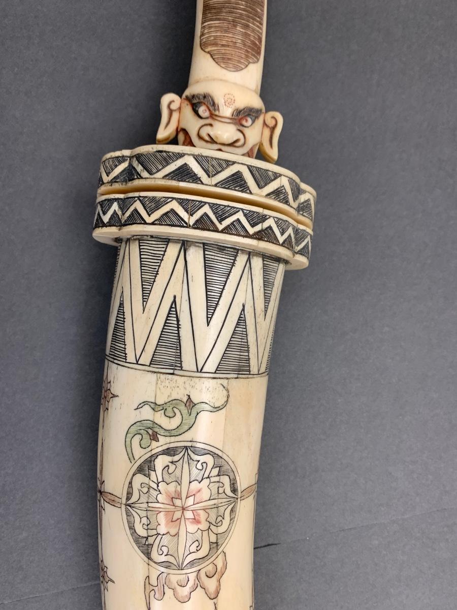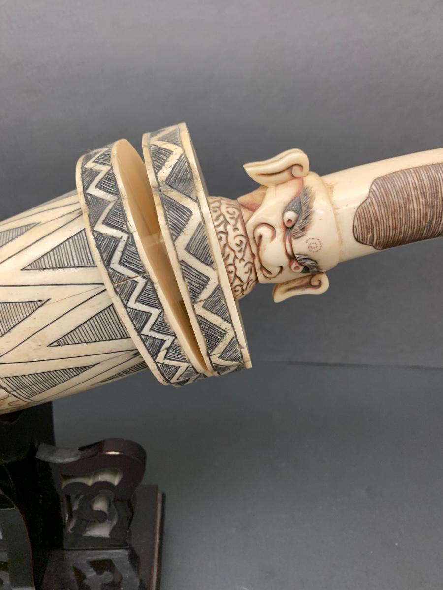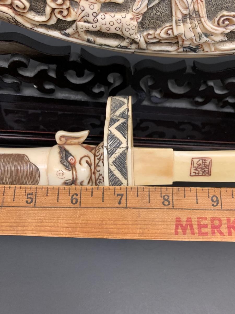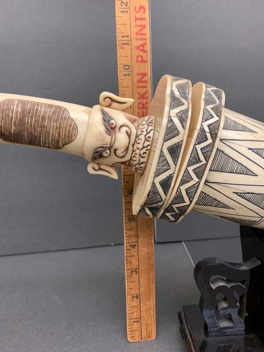 LOT 57: Asian Inspired Carved Asian Head Knife, Case, and Display Stand