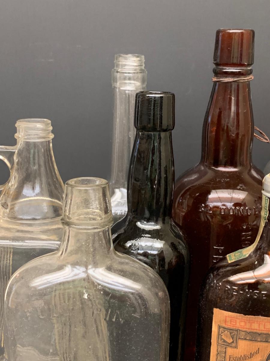 Collection of 10 vintage bottles with label, raised letters and/or with no markings