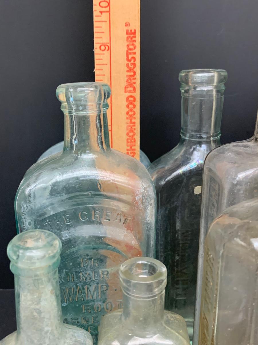 Collection of 12 vintage bottles with labels, raised letters and/or with no markings