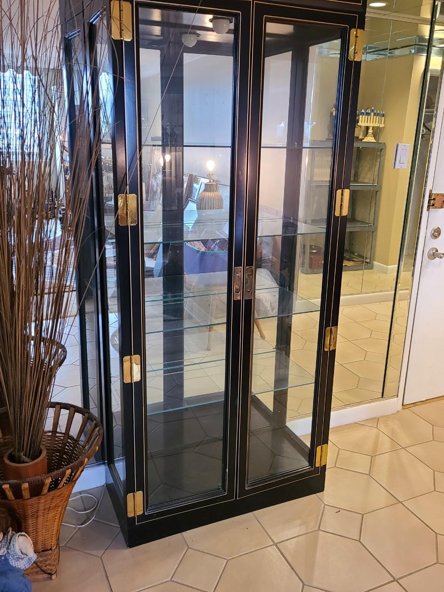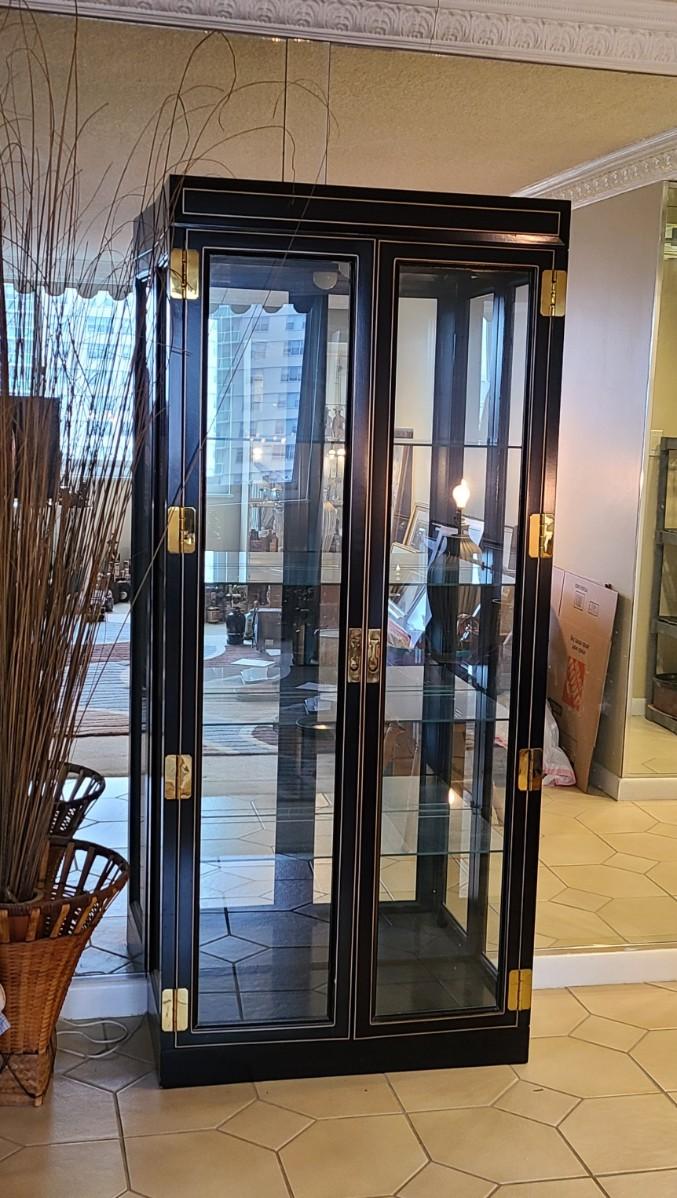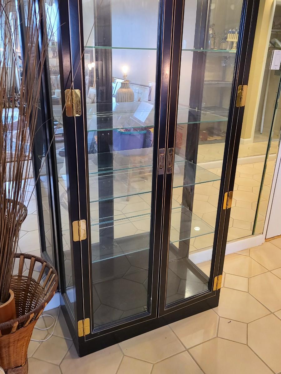 LOT 126: Black Wood Framed Lighted Curio Cabinet w/Brass Hardware
