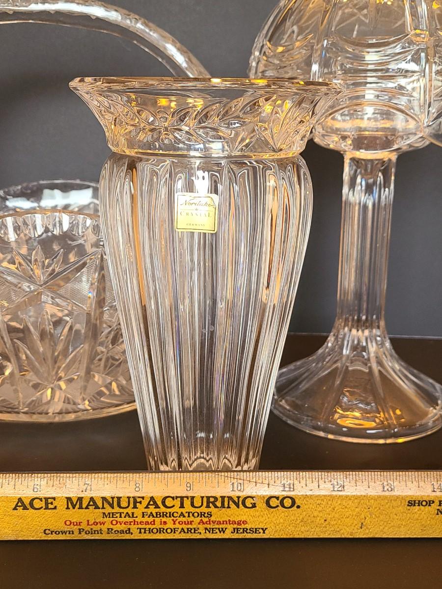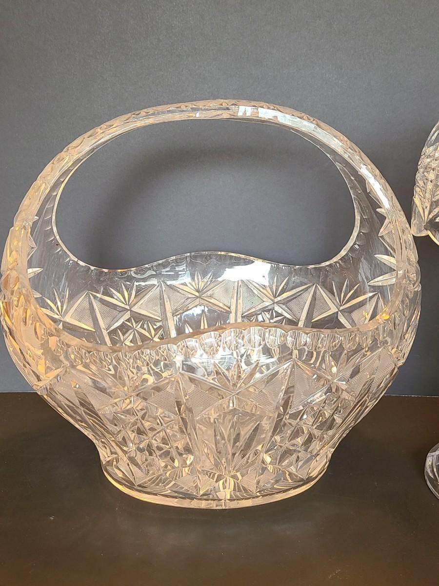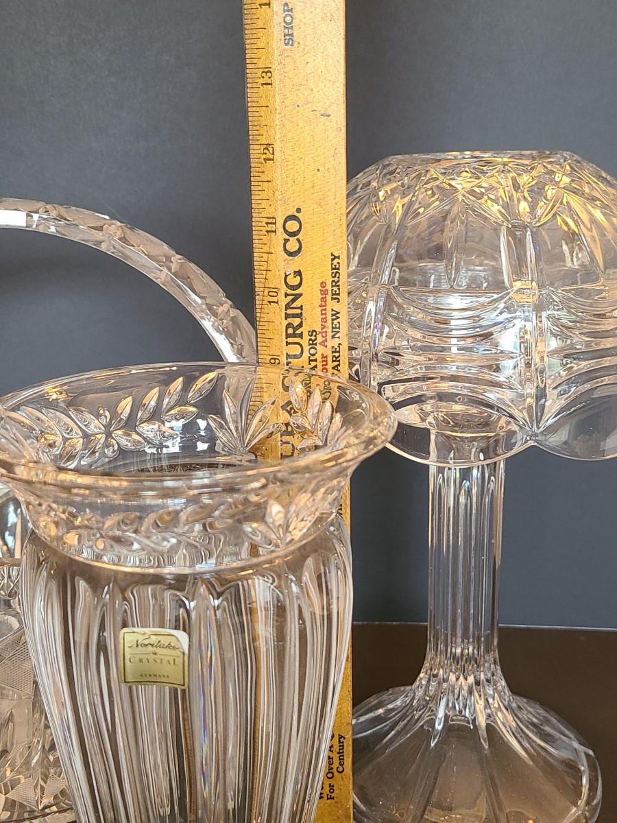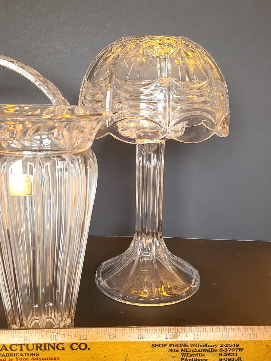 LOT: 149: Noritake German Crystal, Large Glass Hurricane Candle Holder. and Large Glass Centerpiece Basket