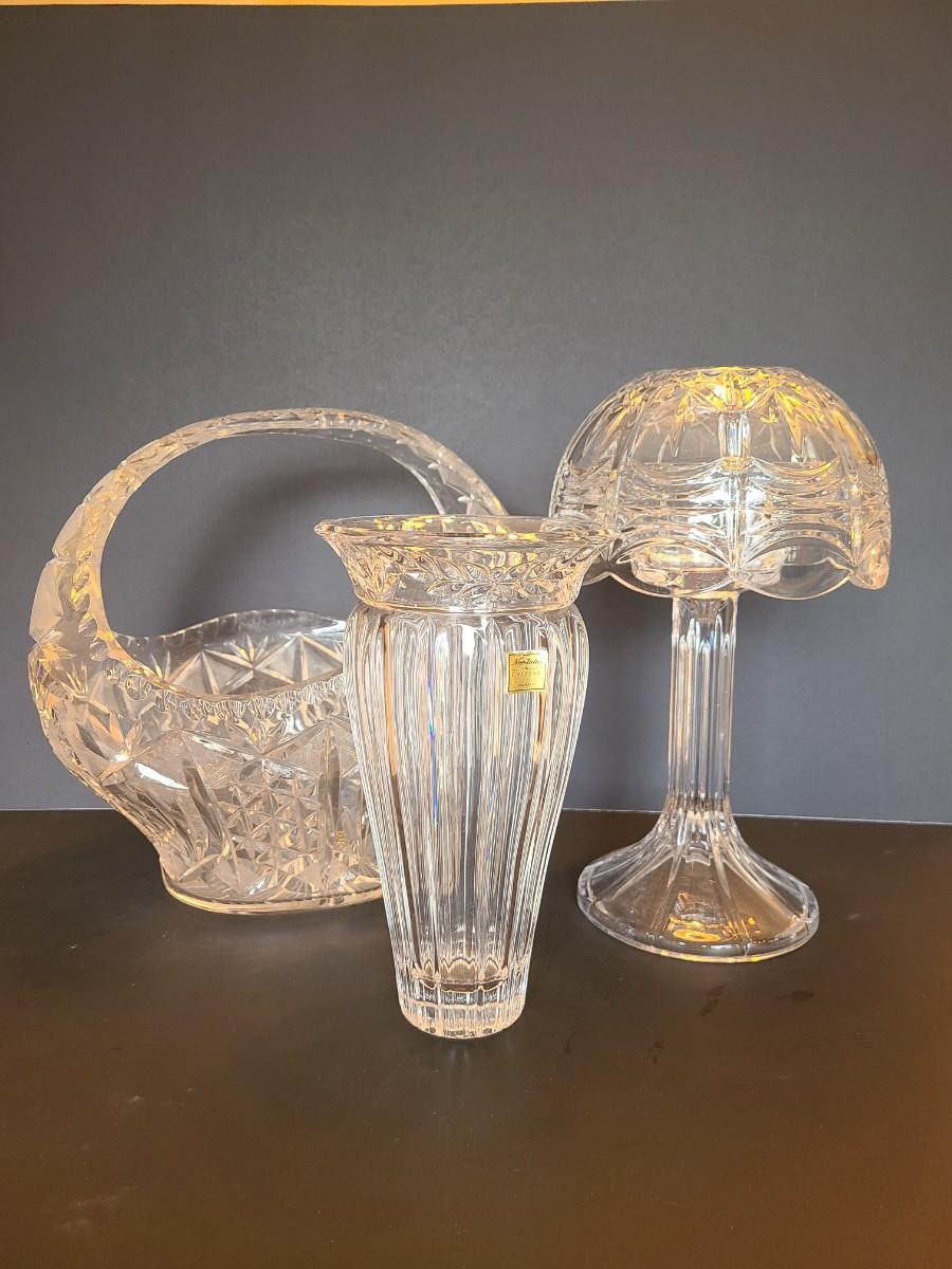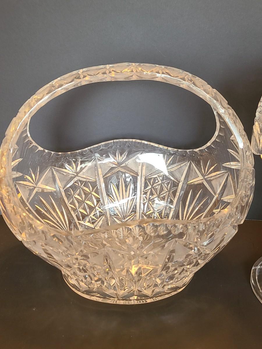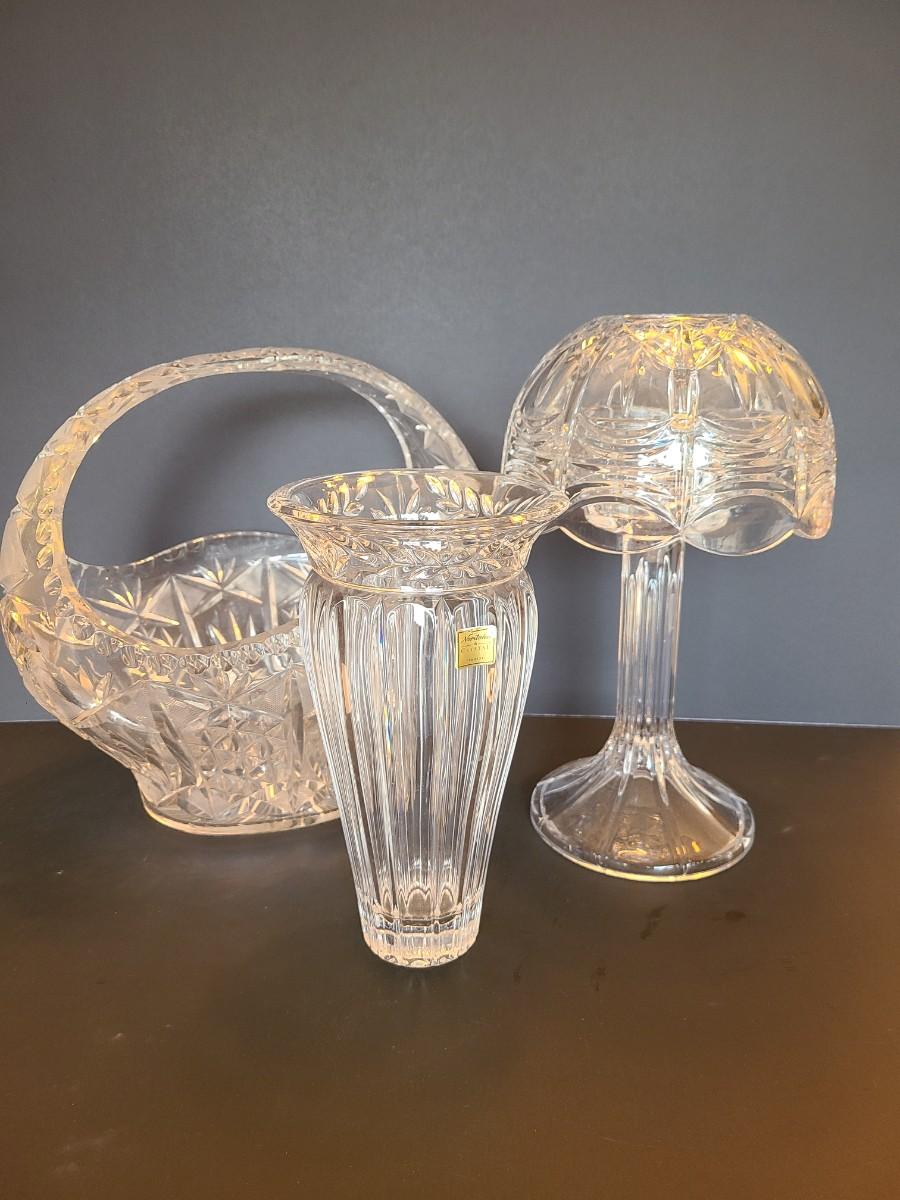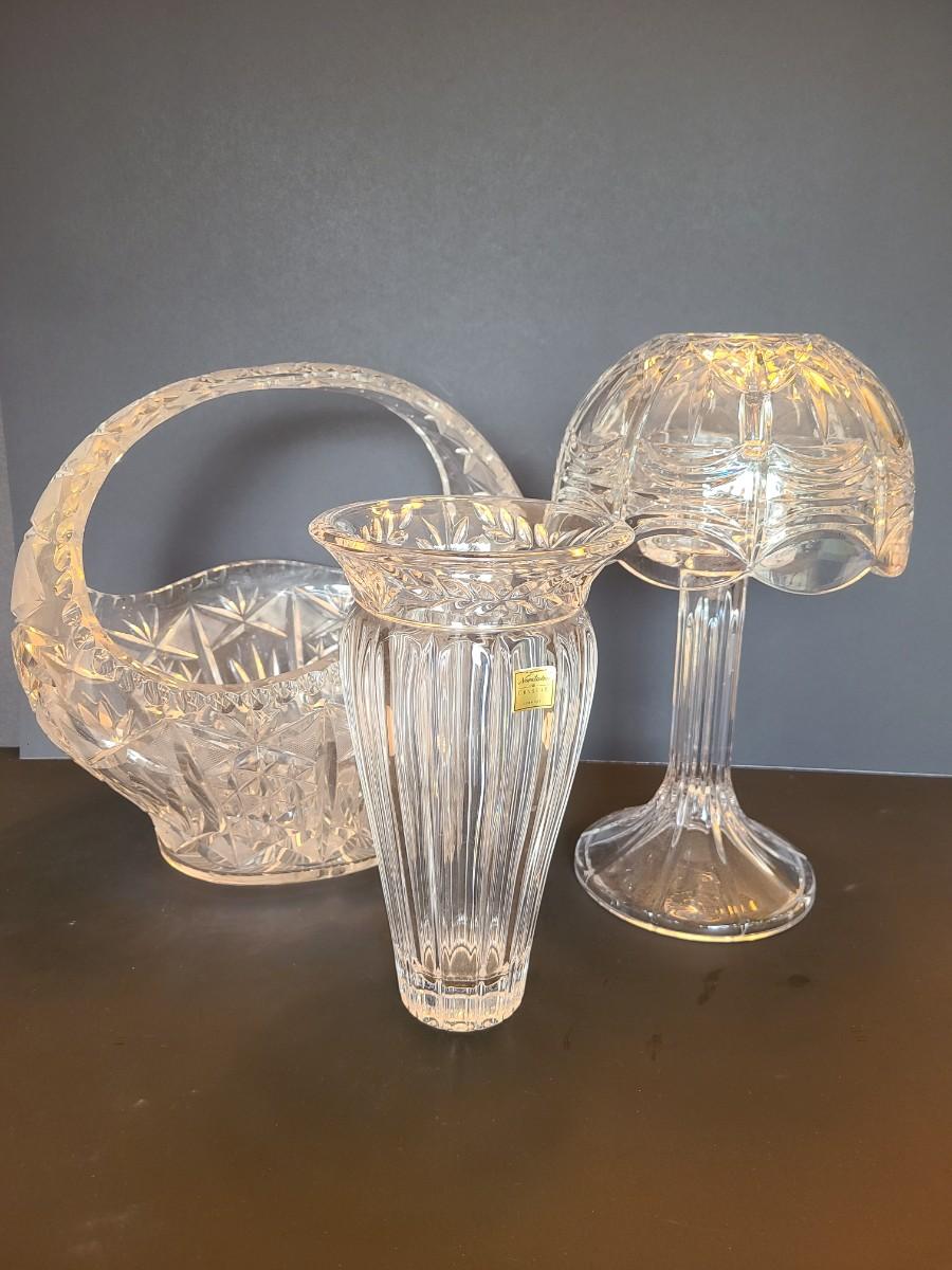 LOT: 149: Noritake German Crystal, Large Glass Hurricane Candle Holder. and Large Glass Centerpiece Basket