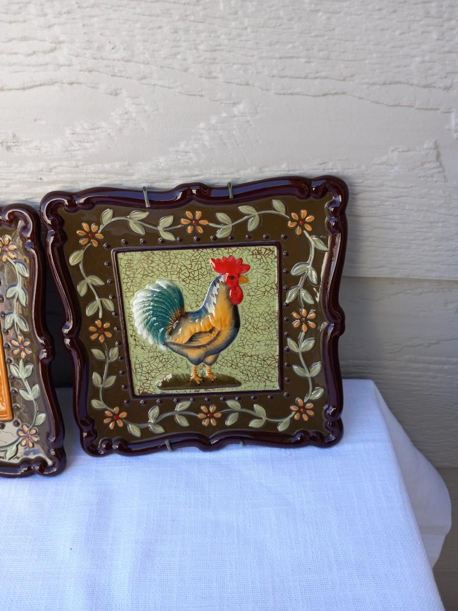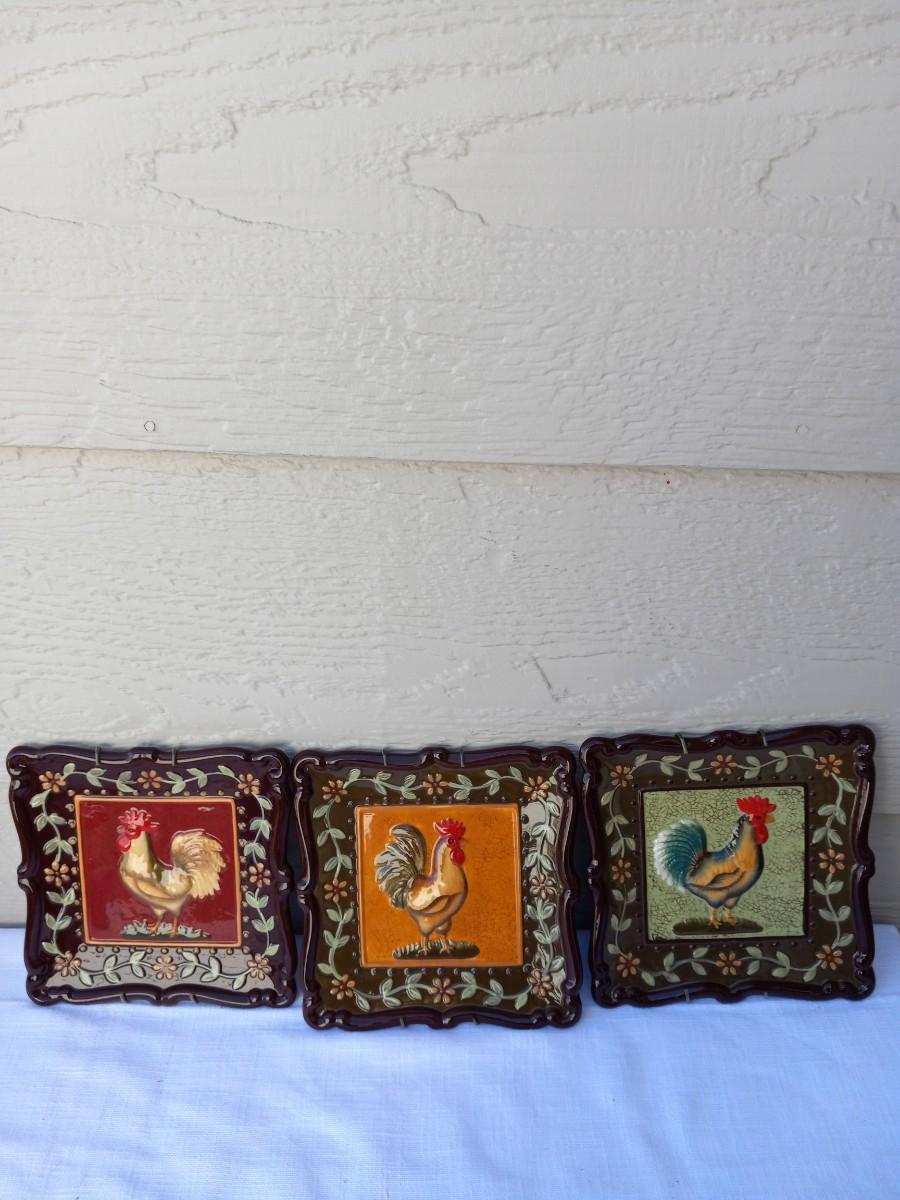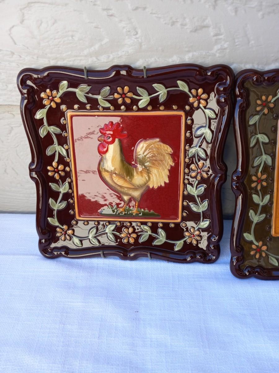 PLATES 8" SQUARE, 2 CERAMIC ROOSTERS