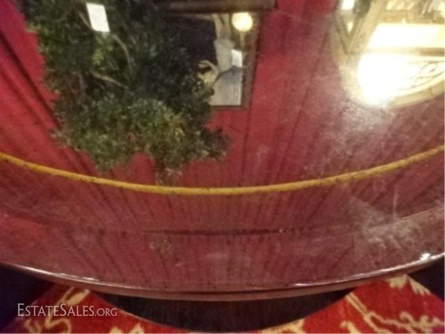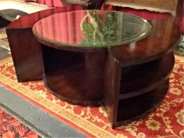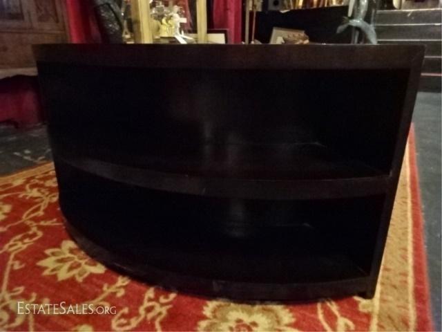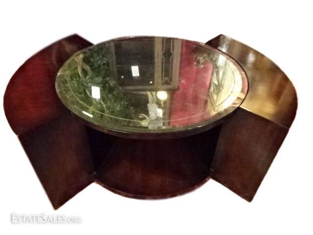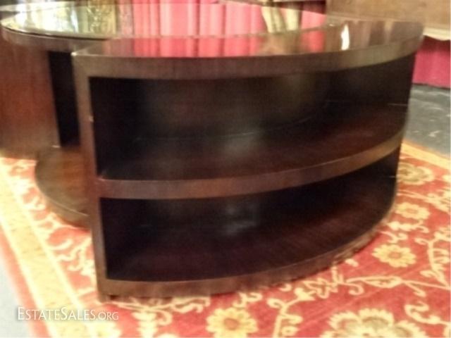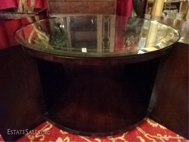 LOT 69A: BARBARA BARRY STYLE COFFEE TABLE, SILVER GILT BACK MIRRORED ROUND TOP, DARK FINISH, EACH END WITH 2 SHELVES, VERY GOOD CONDITION, 54"W X 38"D X 20"W, SKU256.04
